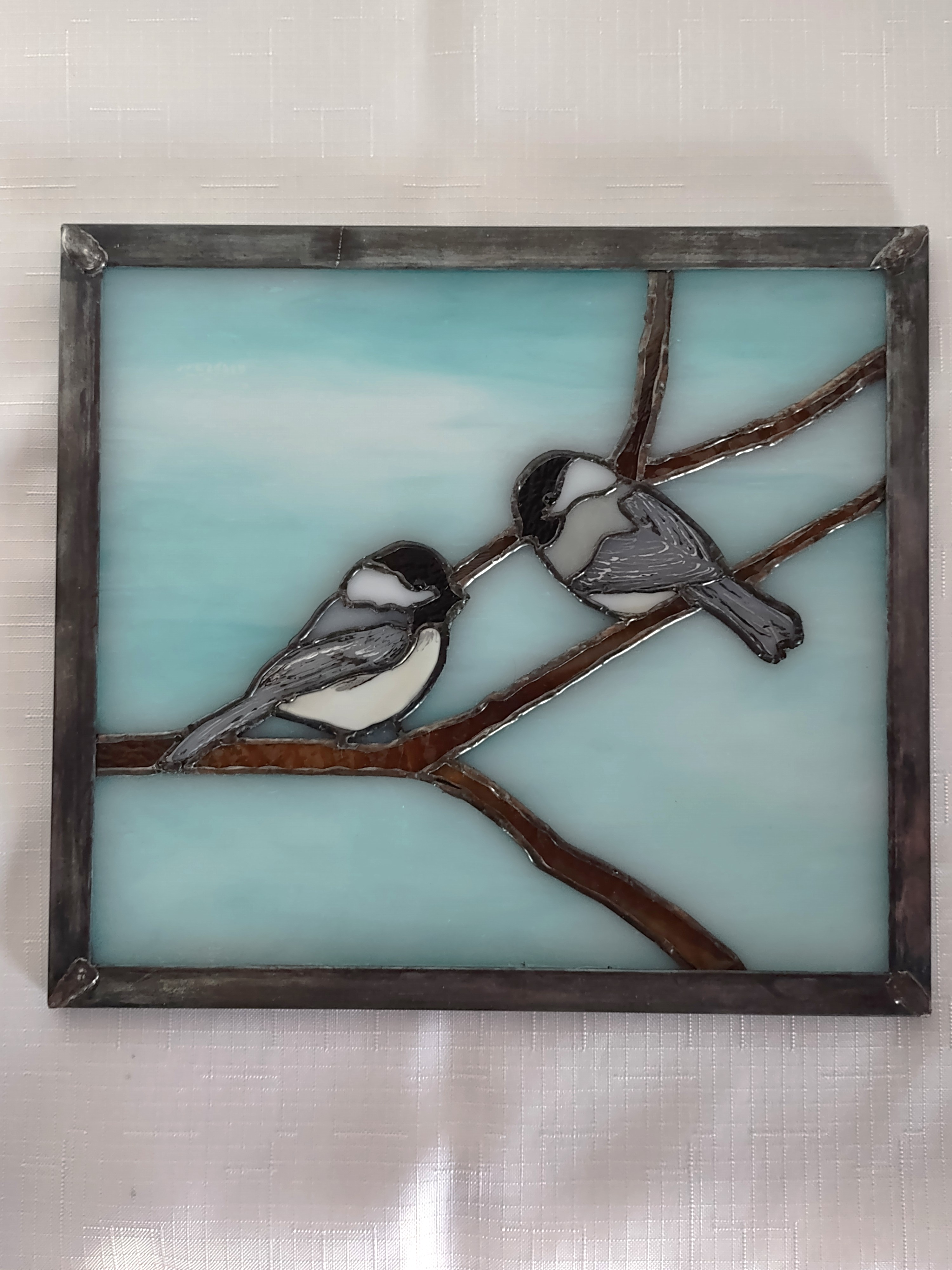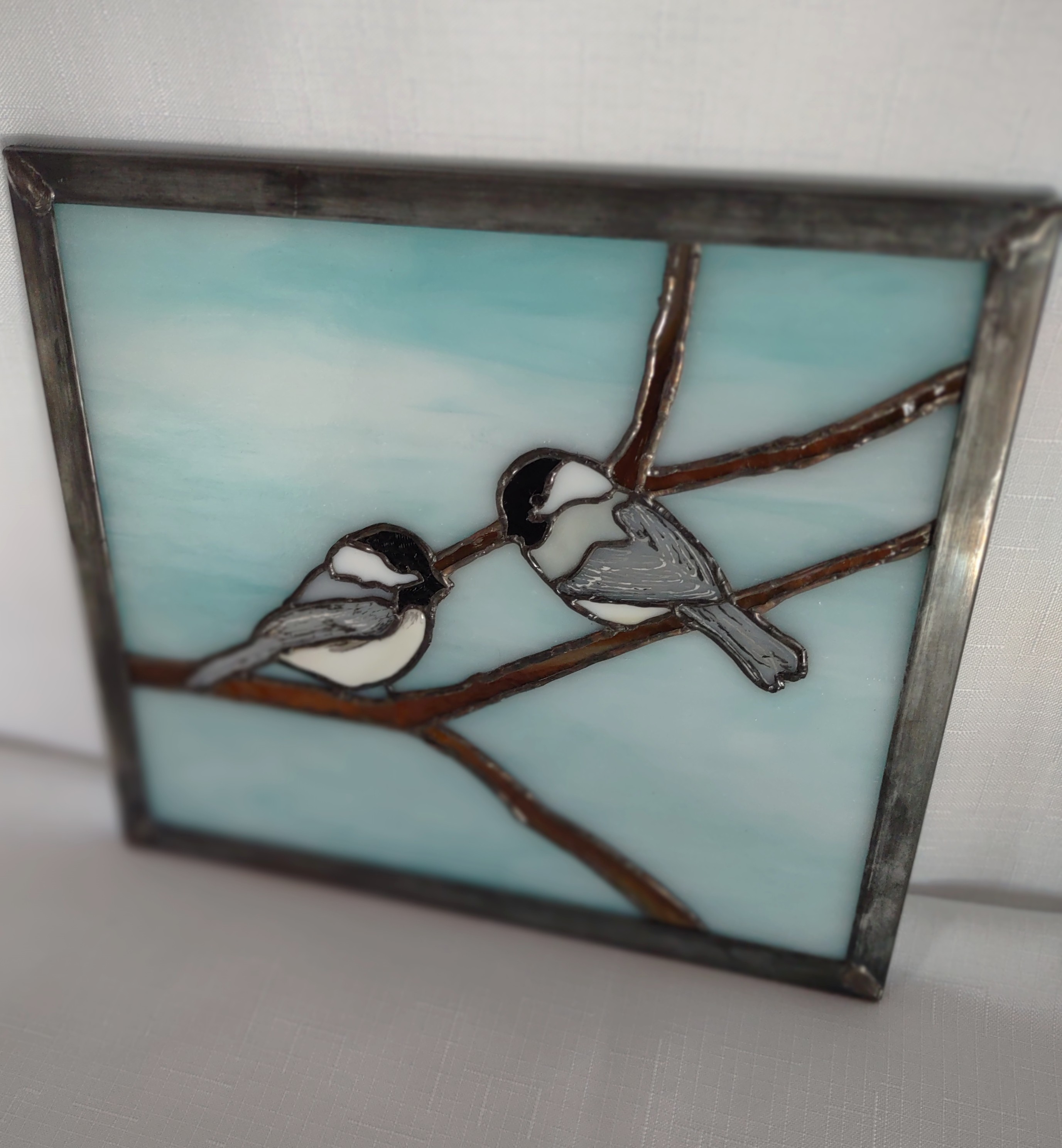 Two Chickadees perched on a branch in winter. An original design and hand-crafted in the Tiffany style. Wings and tails are glass painted for detail and kiln fired for permanence. Eyes are black Swarovski crystals. Panel is framed with zinc, stressed with patina. and measures 9 ¾” x 8 ¾”. A tiny piece that does well as a wall hanging but can be window displayed with indirect light.