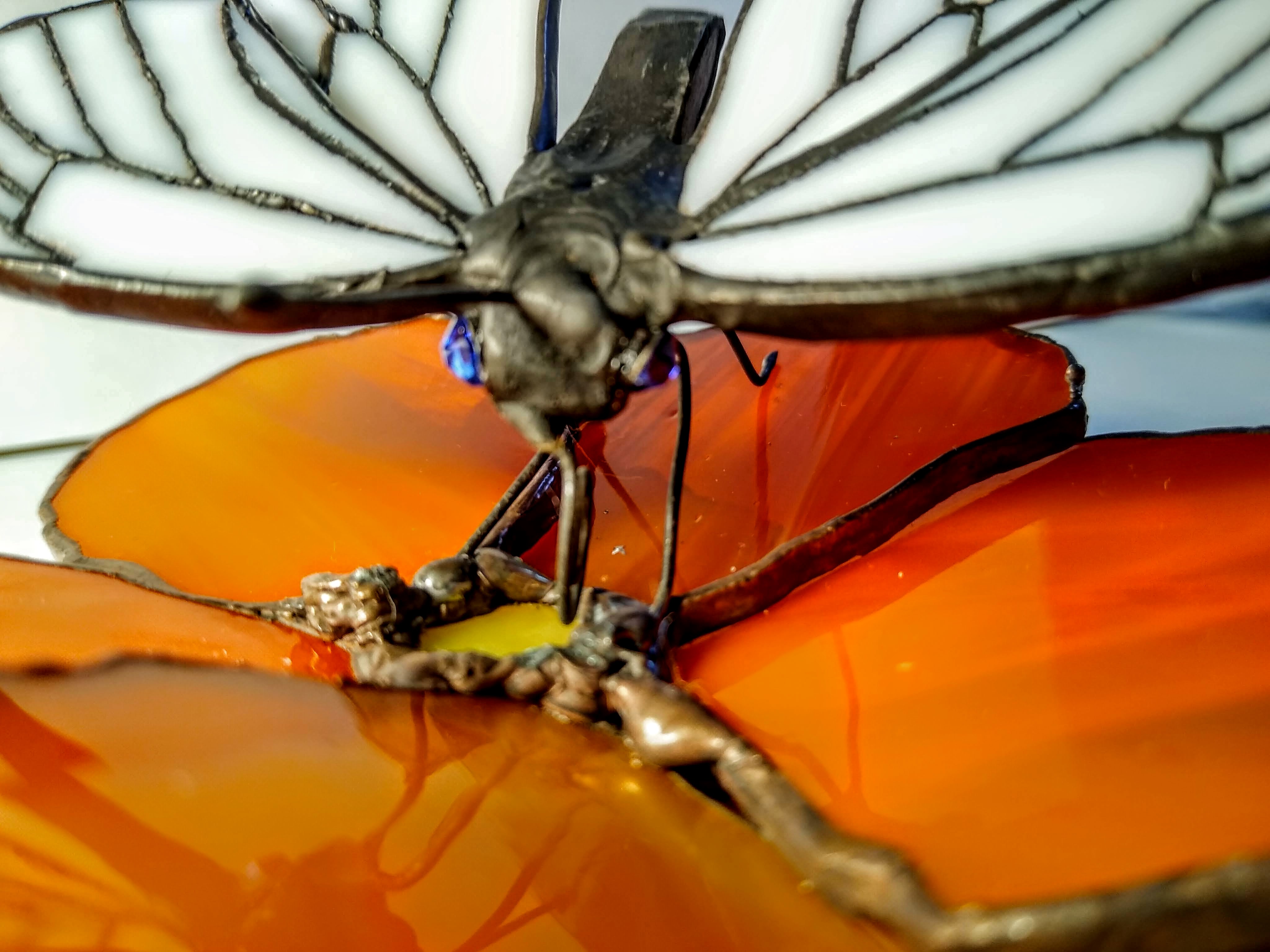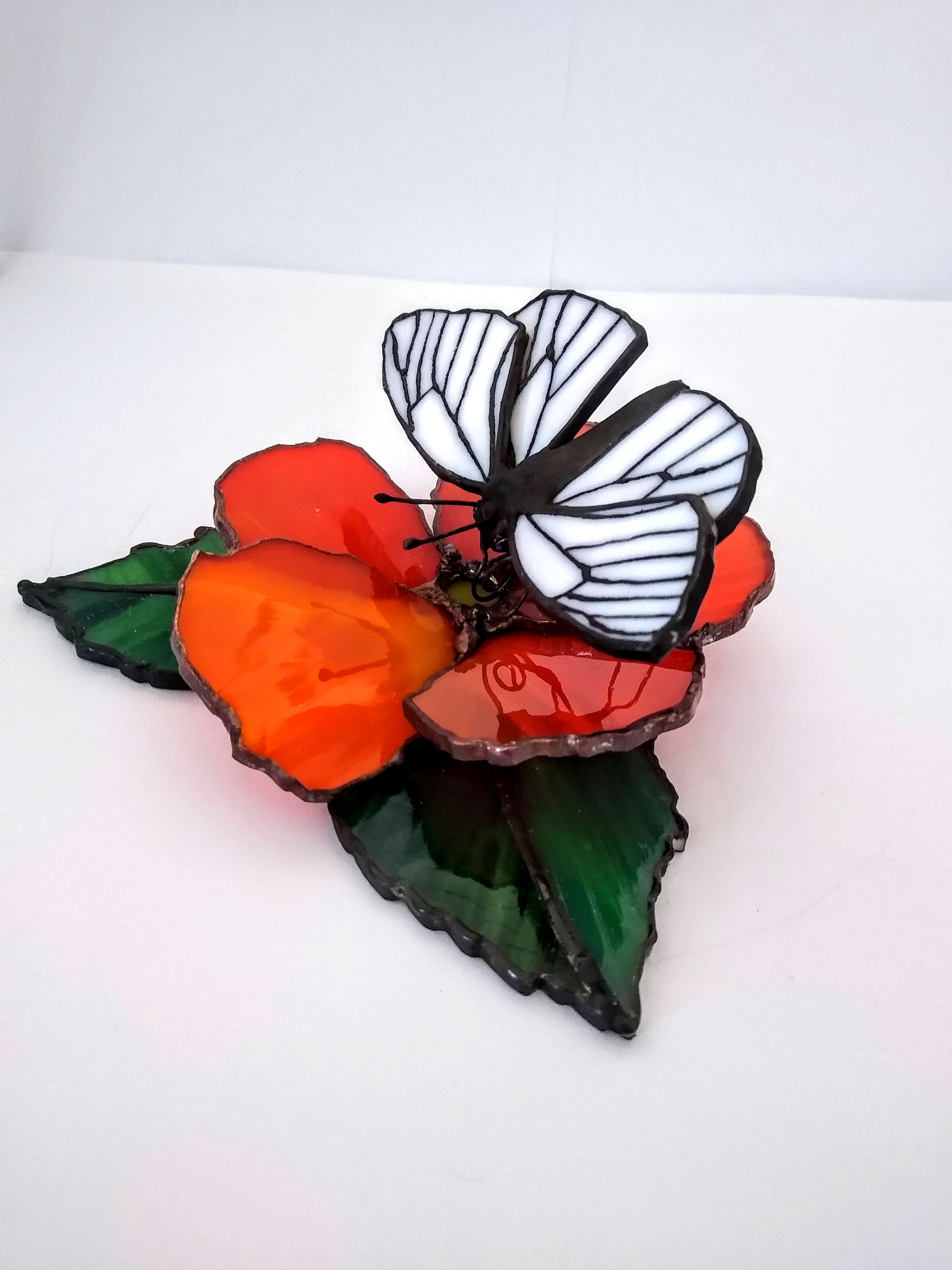 White Butterfly on Orange Poppy – $295. Hand-crafted stained glass White Butterfly with blue crystal eyes on Orange Poppy.