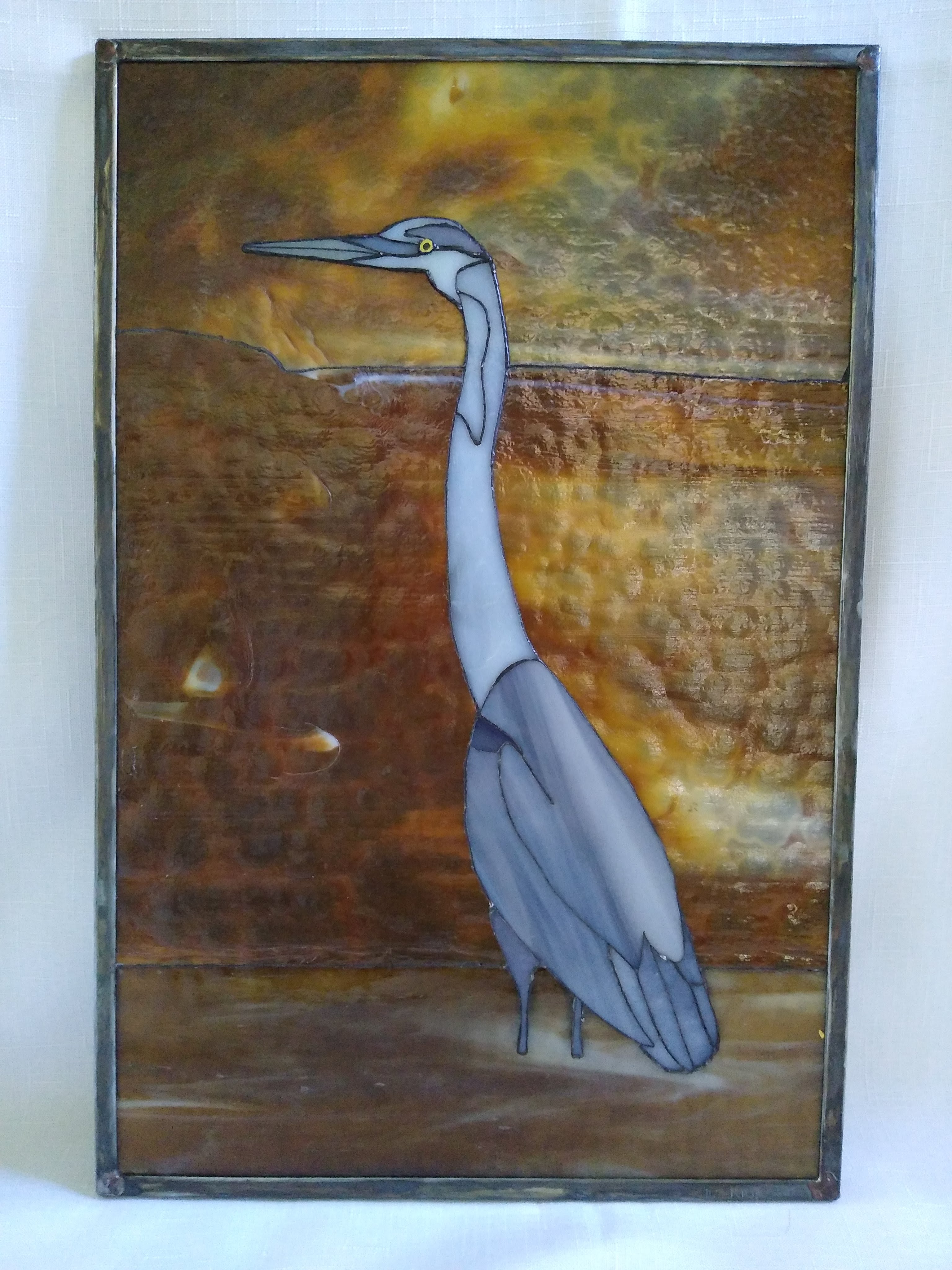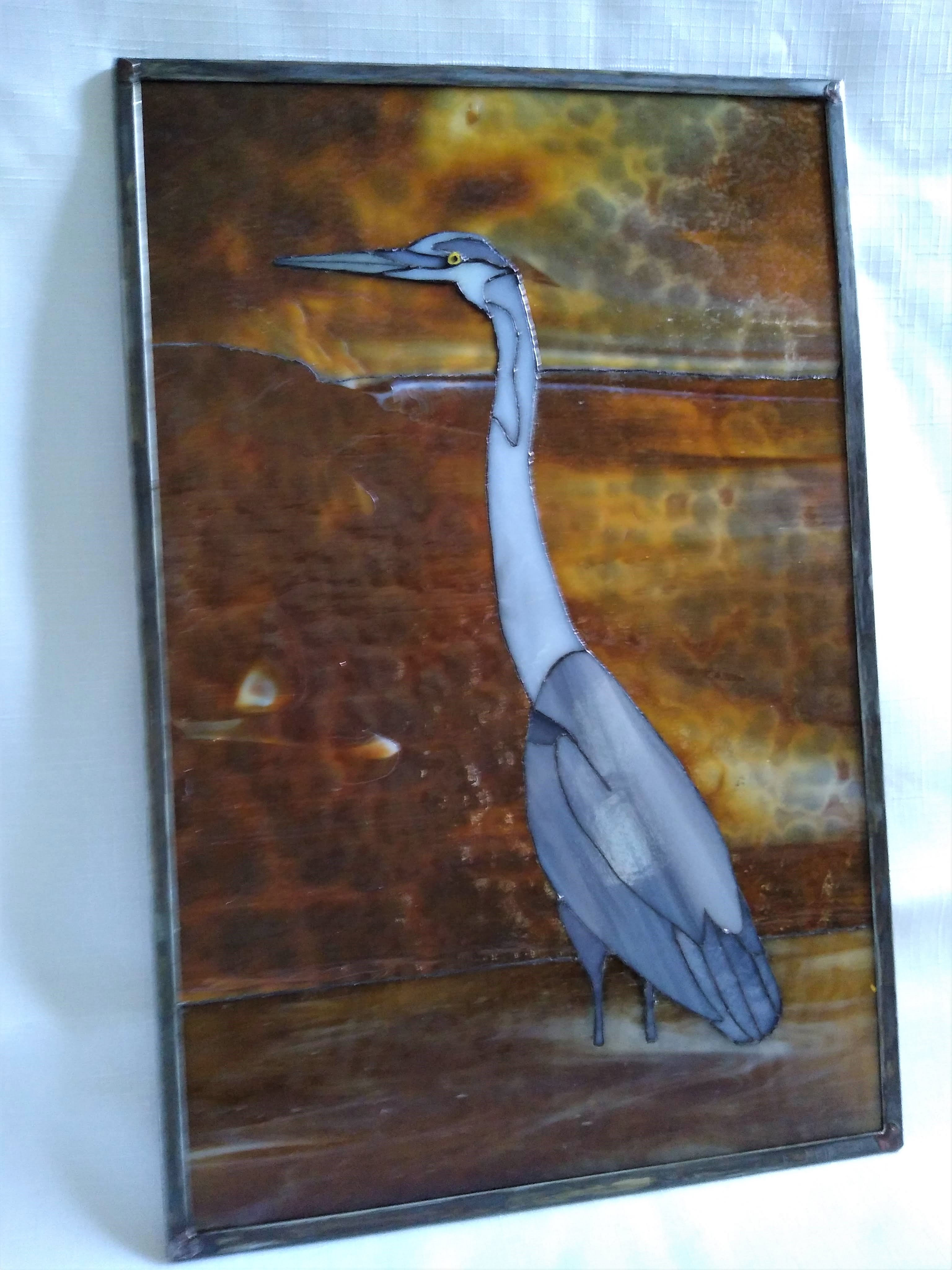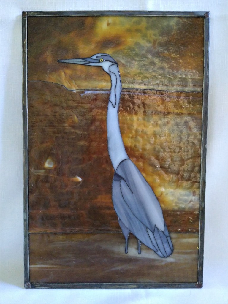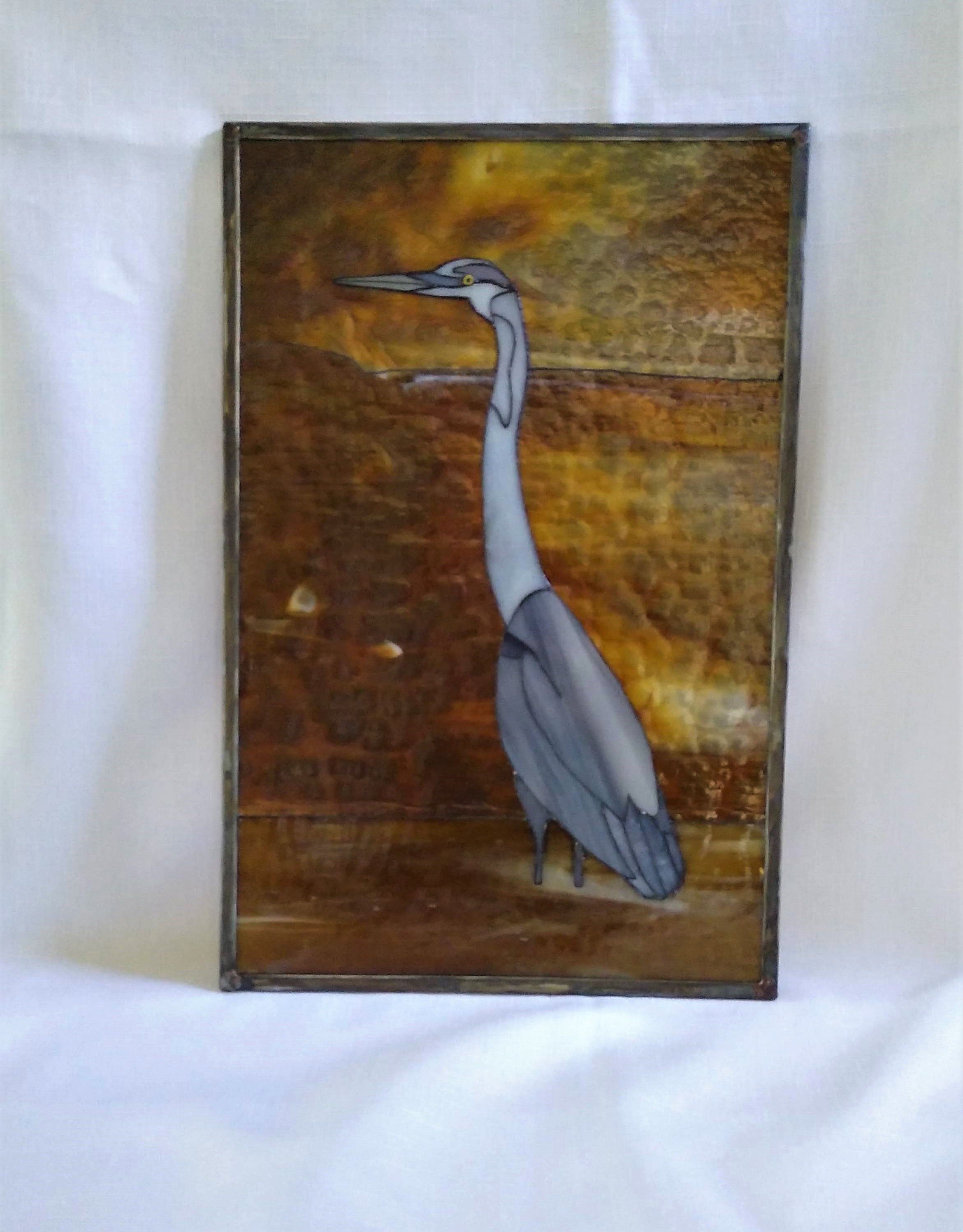 Great Blue Heron at Dusk – $245. Great Blue Heron stained glass panel – an evening pause from fishing. Hand-crafted stained glass, Tiffany style. Framed and finished with black burnished patina. Measures 10” x 15” – preferable presentation as wall hanging as opposed to window. A one-of-a-kind creation – each piece we create is unique.