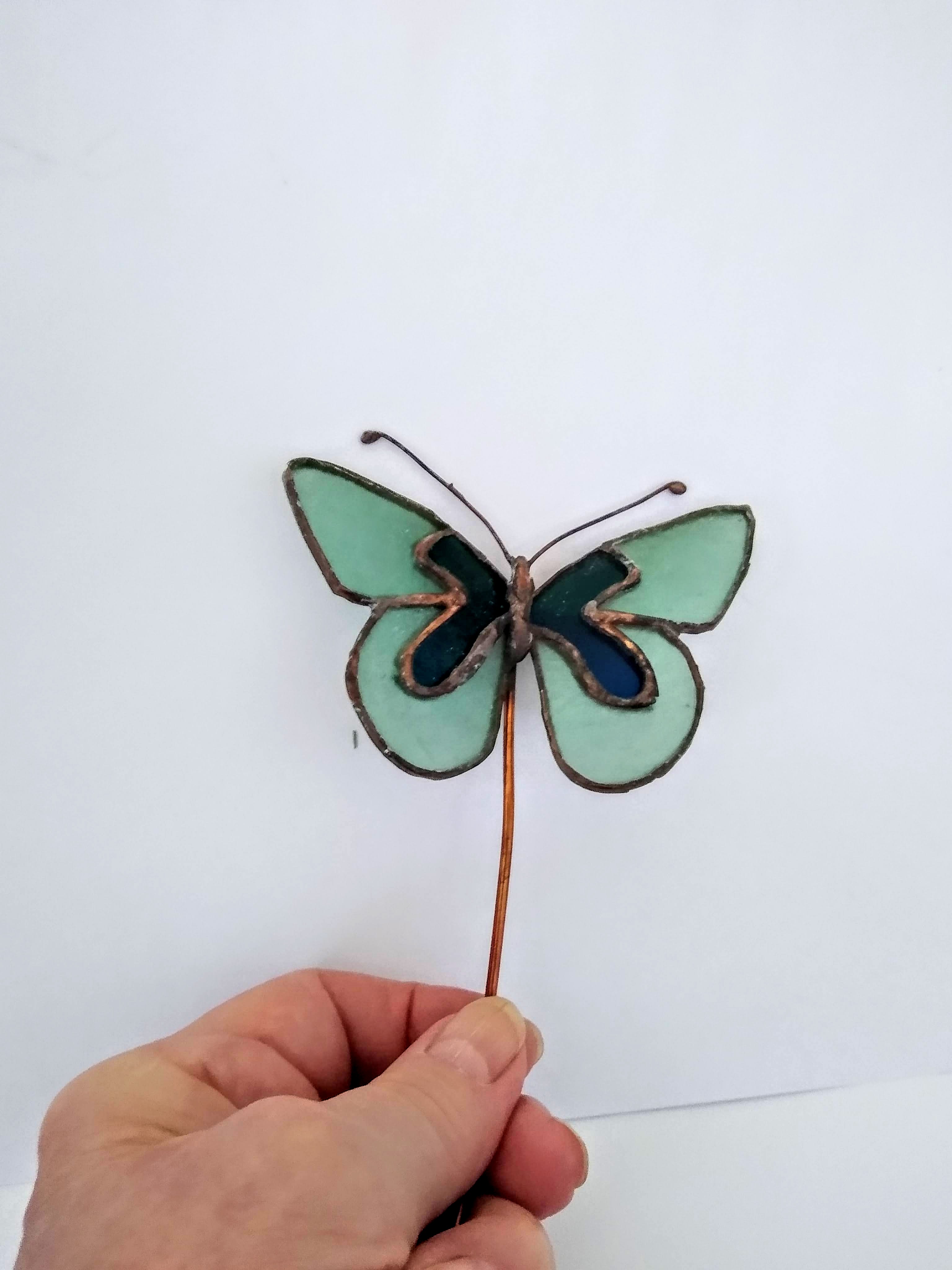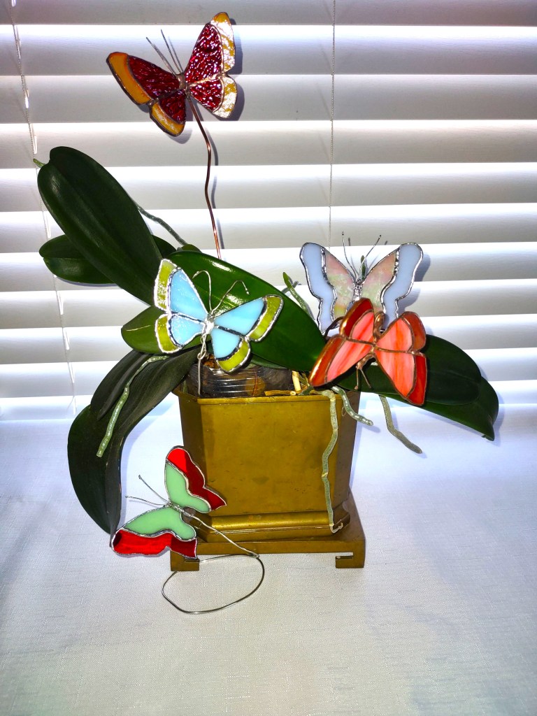 Butterfly Two Color Plant Stake – $45. Hand-crafted 2-color mini glass butterflies. Mounted on flexible copper wire, these small, colorful butterflies can be added to your non-blooming house plants, or entwined on a lamp, or bedpost to add a splash of color. Each butterfly is hand-made with glass, copper foil, lead solder and copper wire using the Tiffany foil method. Colors available as pictured – special color requests will be considered and may require additional production time. A perfect tiny gift for any occasion. Chec Etsy for color choices and availability.