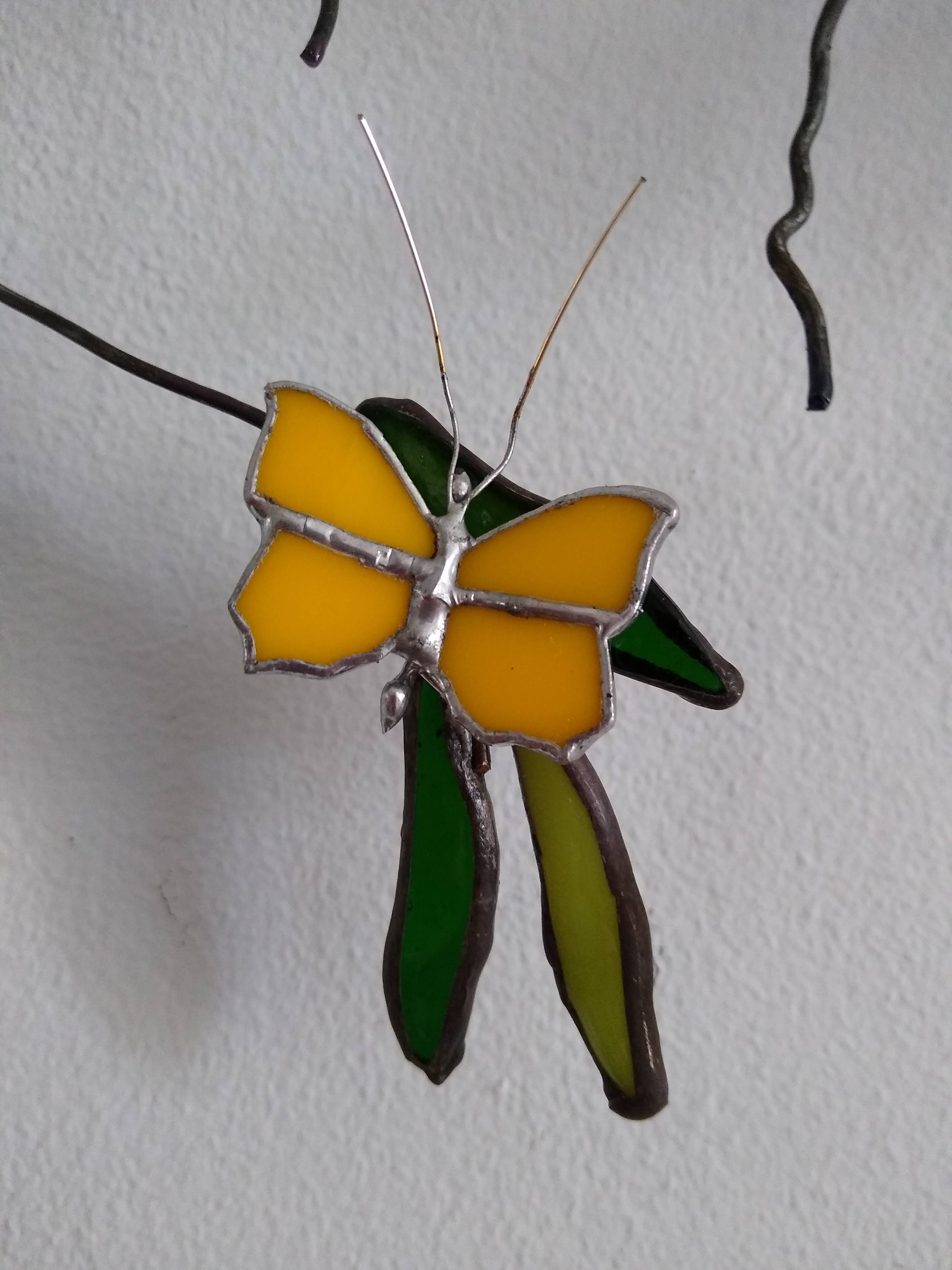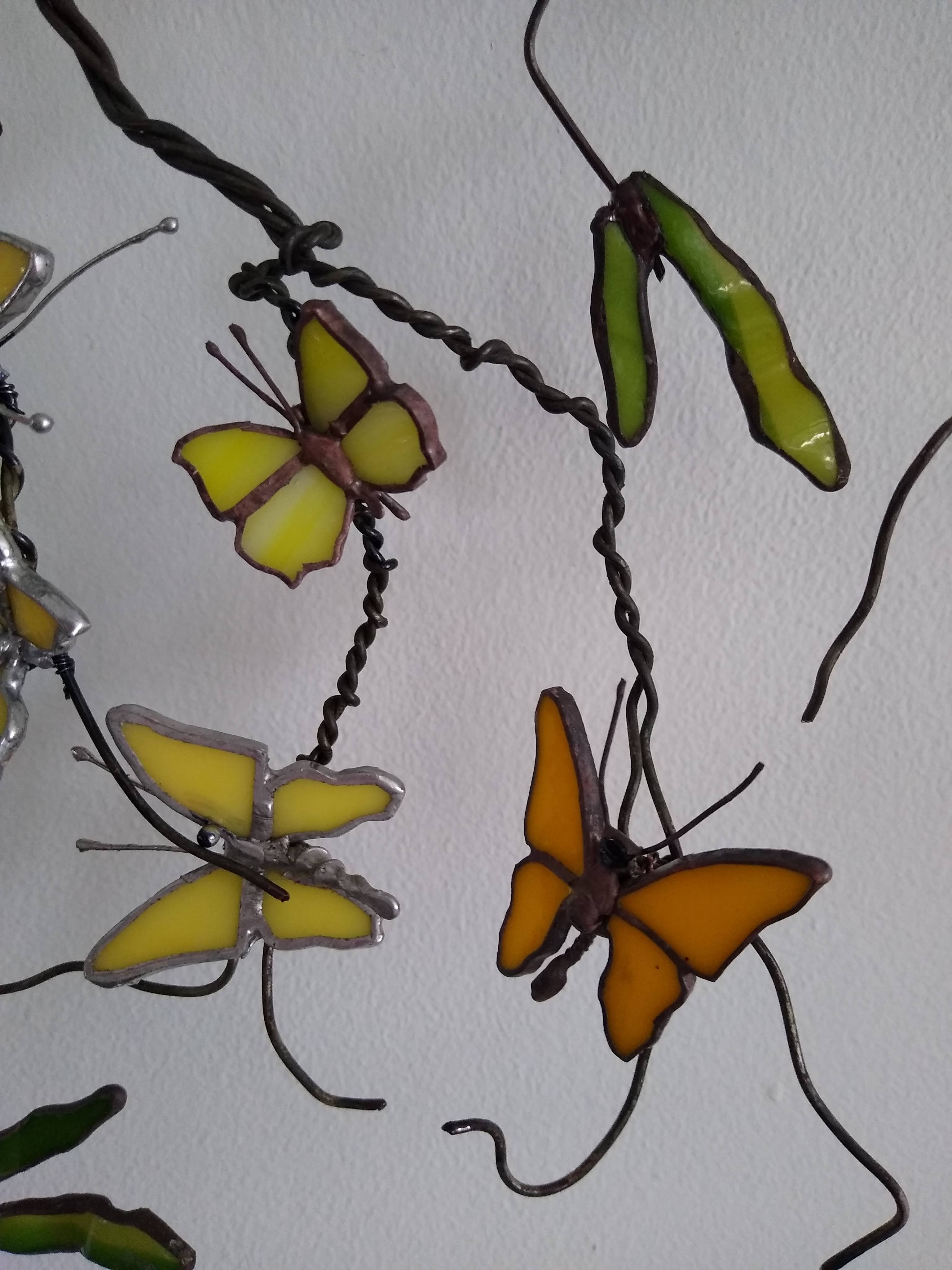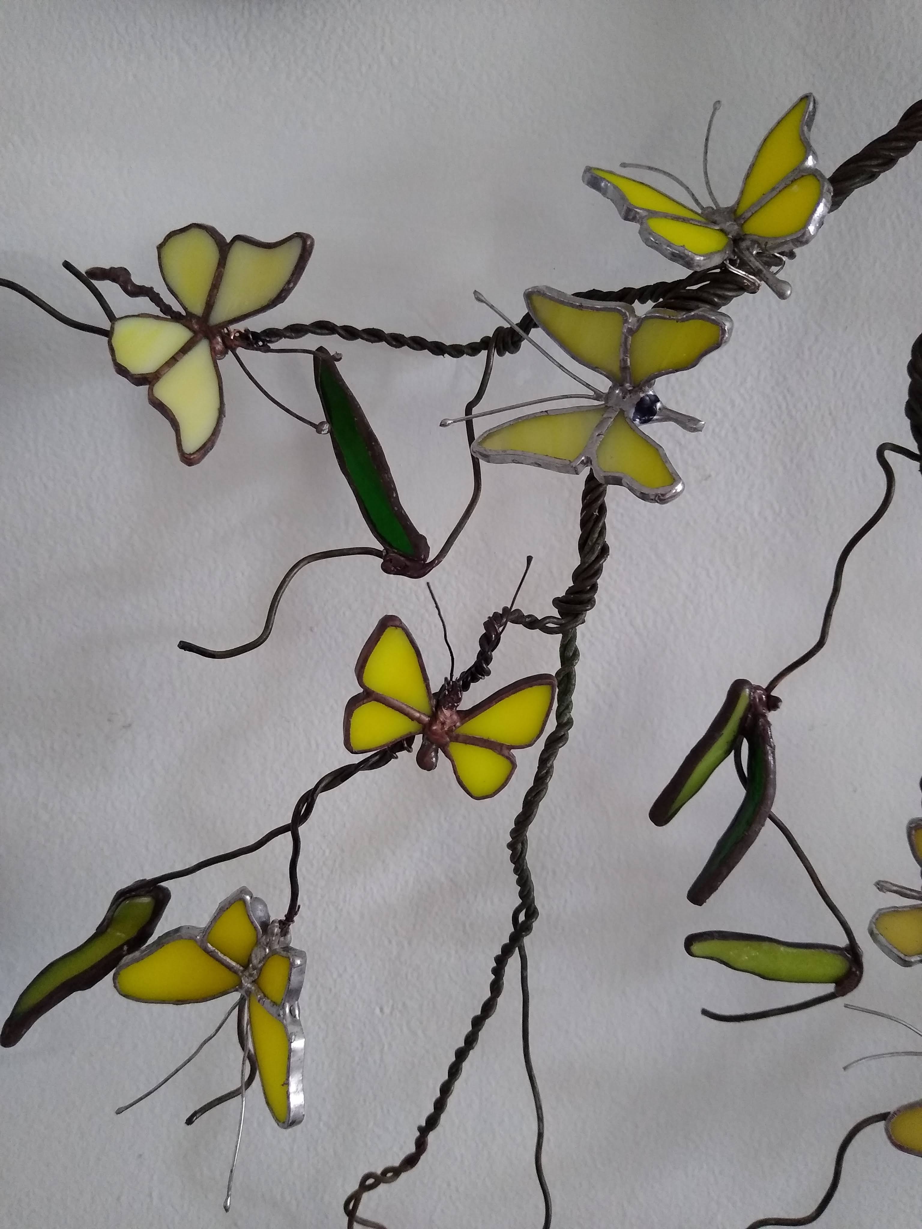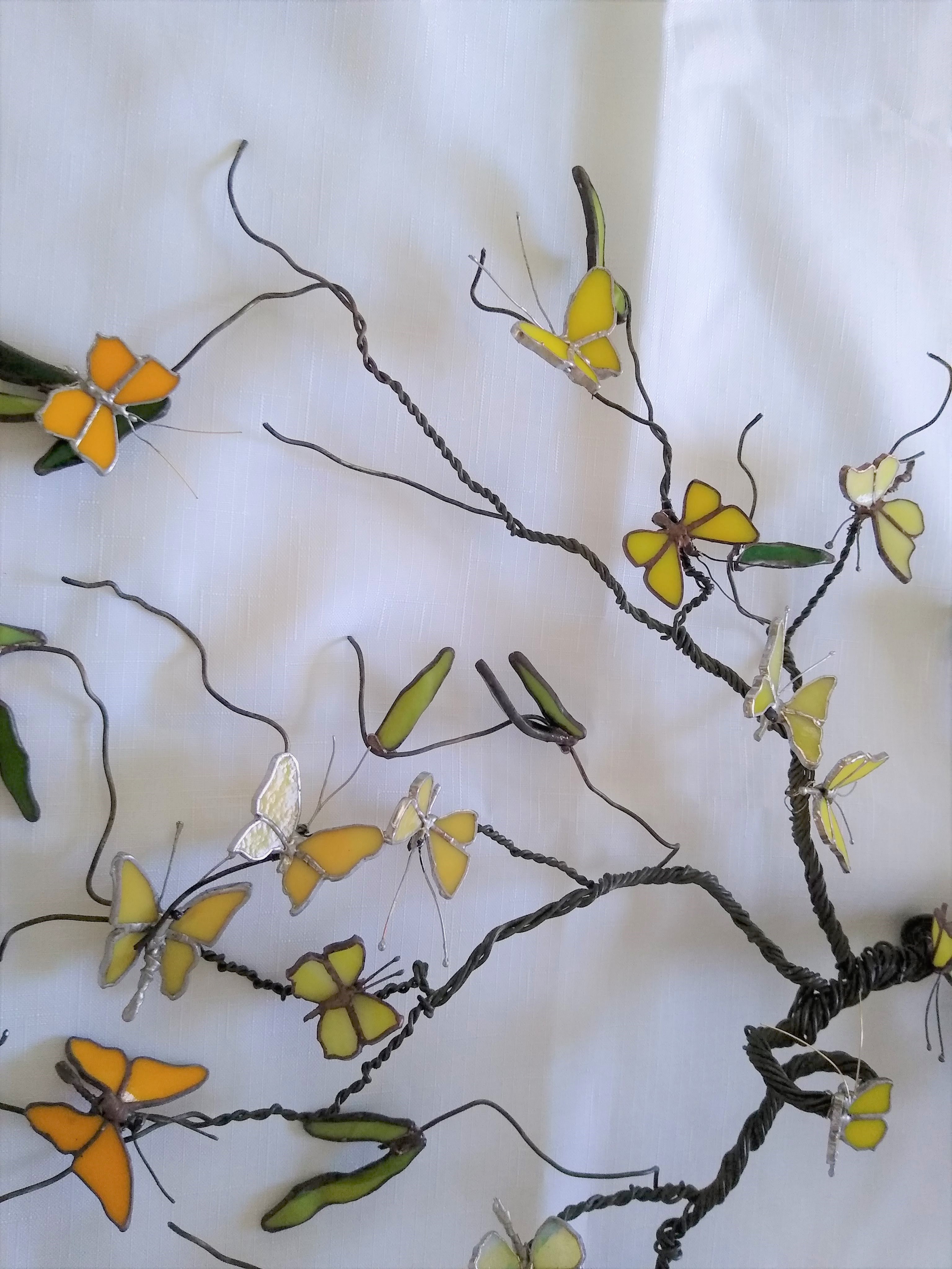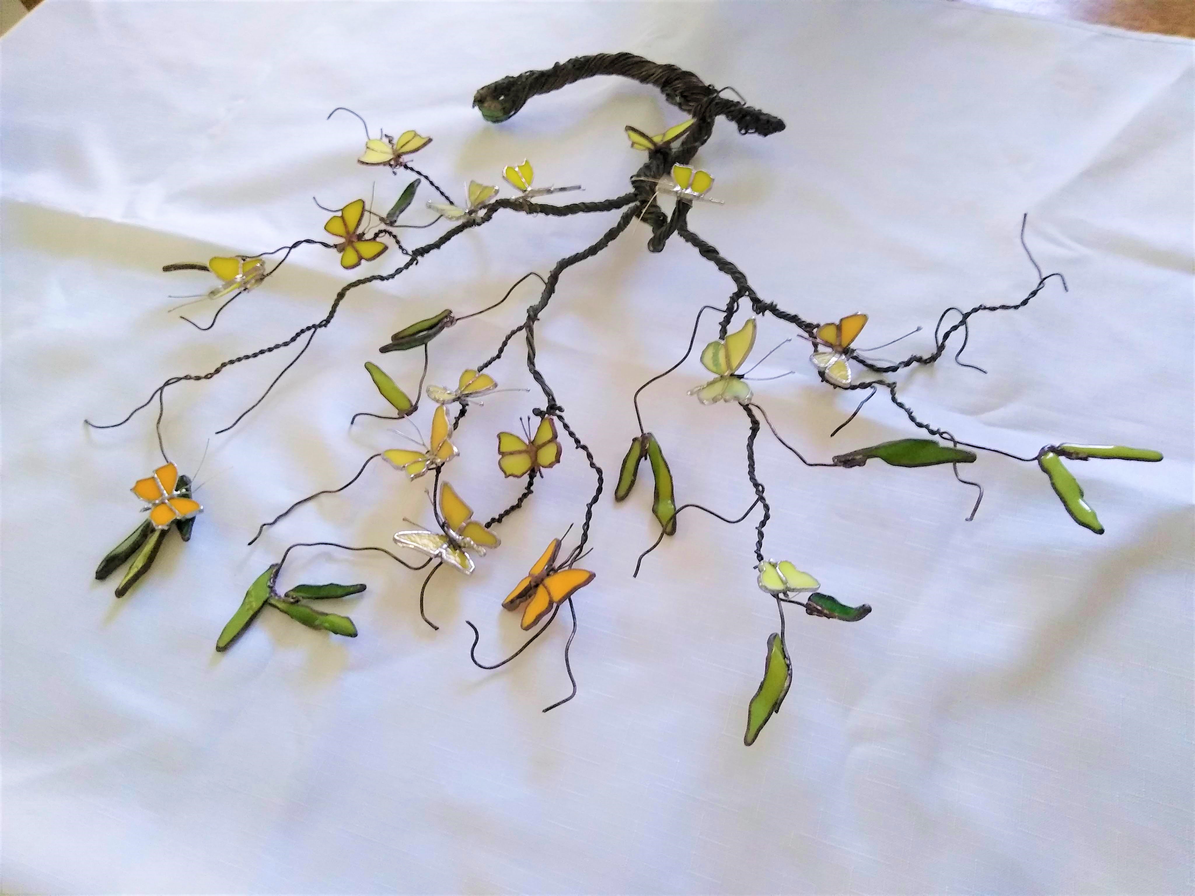 Butterfly Branch, Yellows – $355.00. This original art is an imaginary creation! The flight of mini yellow butterflies have paused for a rest in their migration. It is comprised of multiple sizes, shapes and shades of yellow – from stained glass and finished in copper foil. The branch is constructed from 48 strands of twisted tinned copper wire, soldered and treated with green/brown and black patina. The leaves are created from varigated green stained glass, kiln slumped, and wrapped in copper foil. The branch (hanging) is 22” wide by 20” high and sets about 3” above the mounting surface (wall or table-top). The butterflies are finished in copper and silver. As with all our creations from our studio, this is a one-of-a-kind original design!