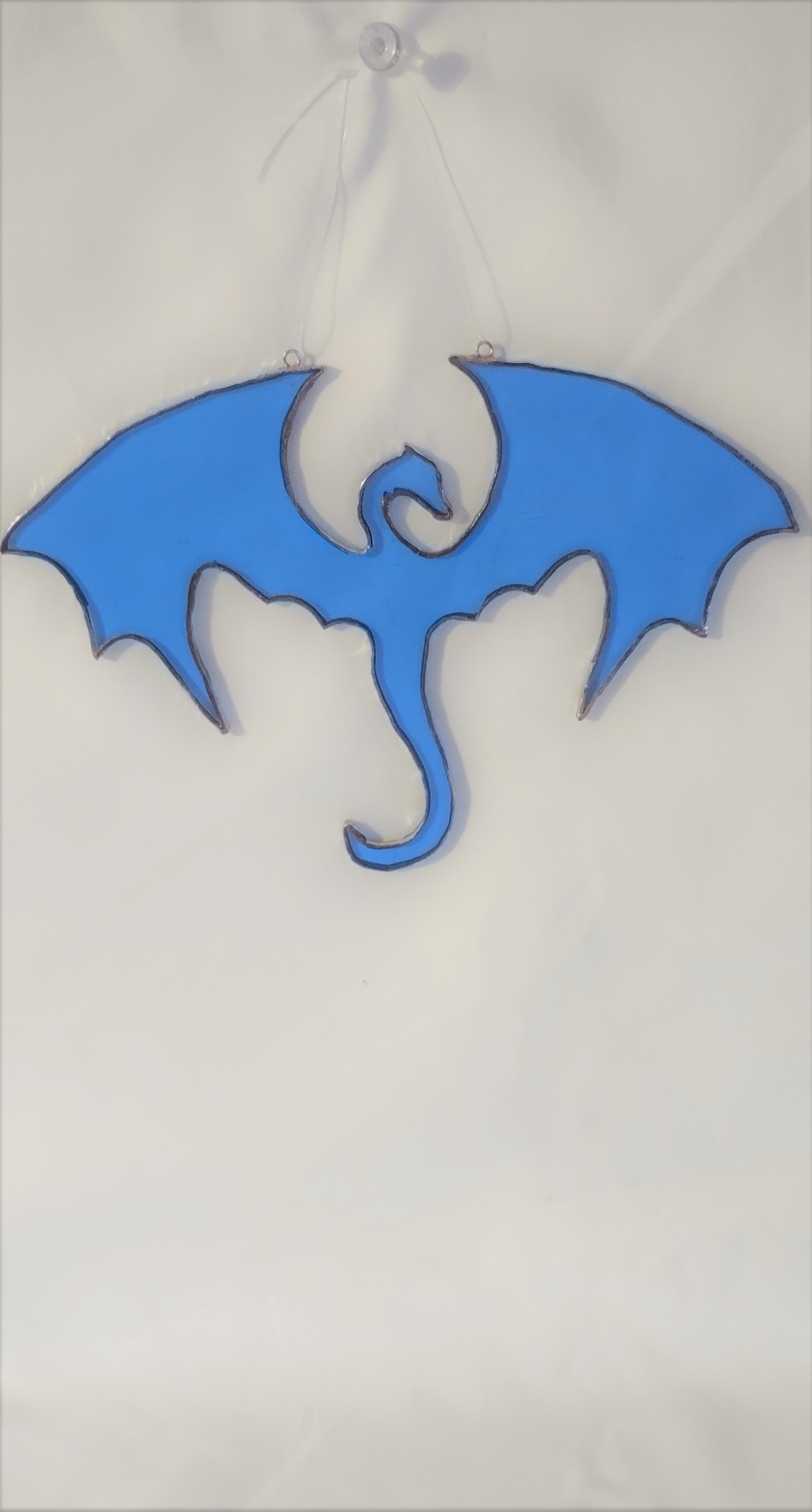 A Fantasy Piece – cut from stained glass of varying shades and textures, each piece hand-made and wrapped in copper foil, soldered and patinaed. It can be hung on a window or wall, or anywhere you’d like. Small hoops are added and monofilament for hanging. Varying colors – inventory is constantly changing – please reach out to us for availability.