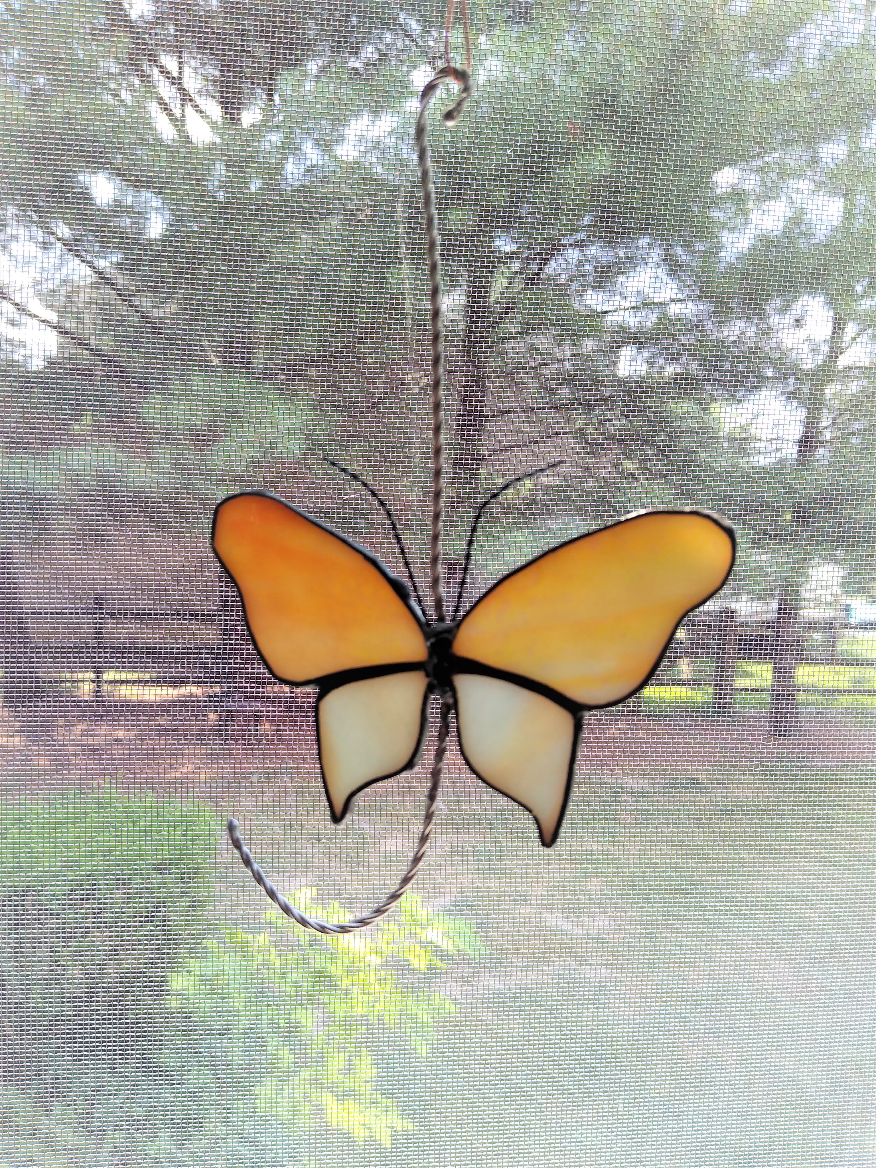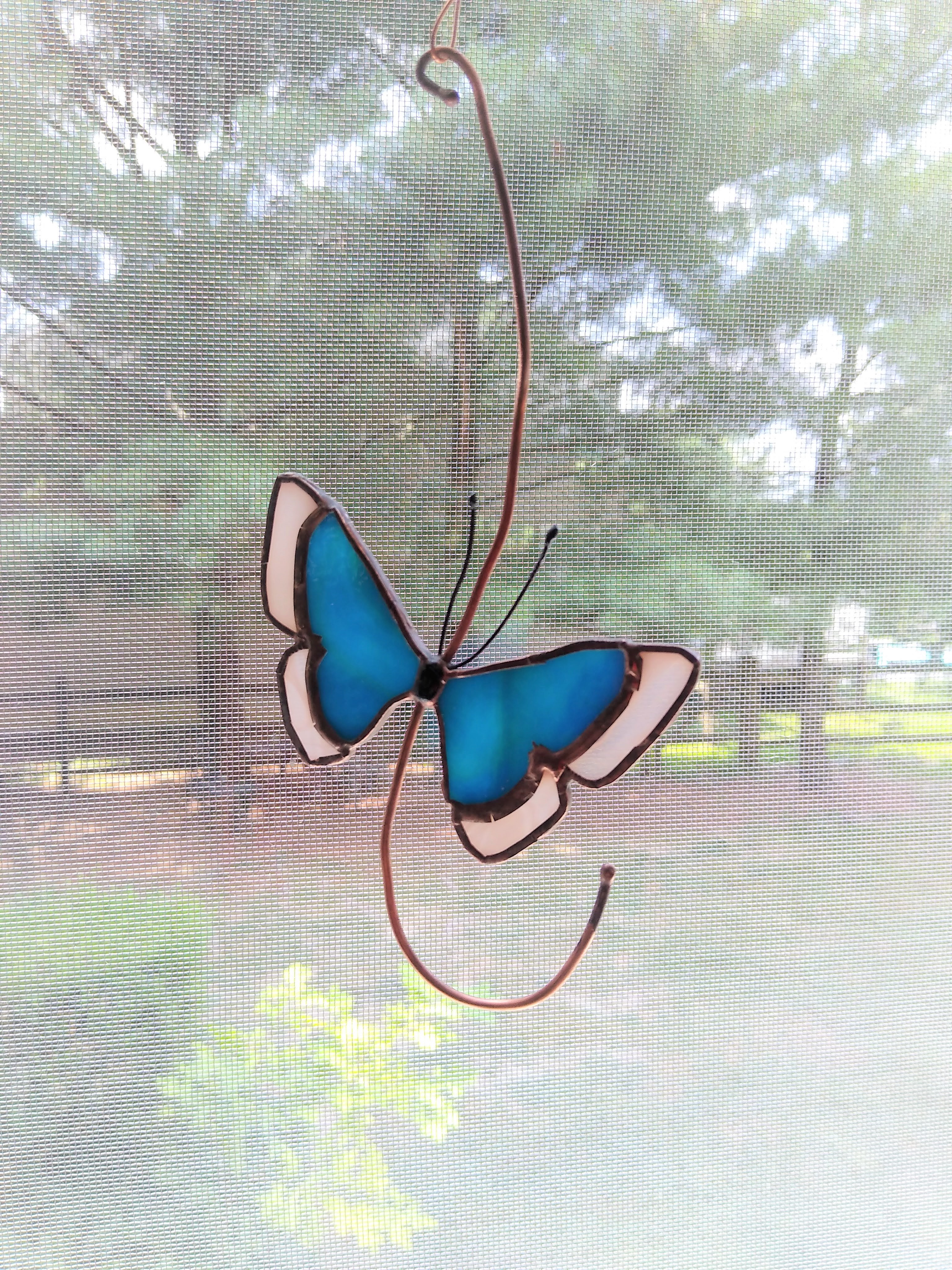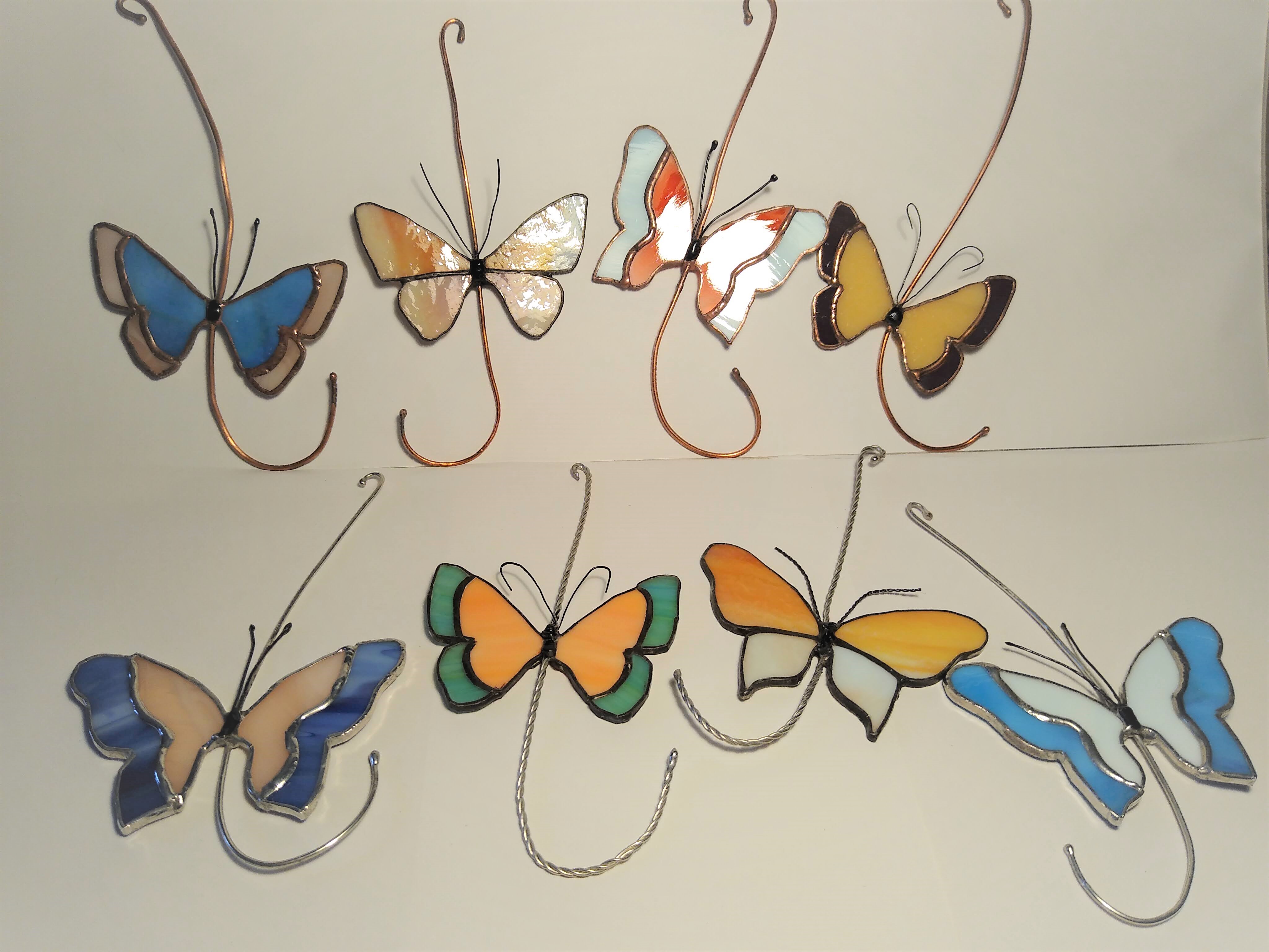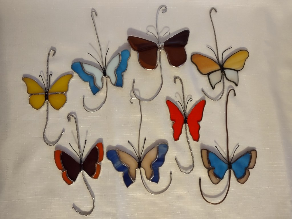 Butterfly Sun Catcher, multicolor – $55. Hand-crafted Stained Glass multi-color butterflies. Mounted on copper wire, suitable for hanging. These small, colorful butterflies do well in windows or suspended from anywhere, to add a splash of color. Each butterfly is hand-made with glass, copper foil, lead solder and copper wire using the Tiffany foil method. Butterfly has a wing-span of about 3 1/2 inches and 2 inches high, with the hanging wire at 6 inches total. Colors available as pictured – special color requests will be considered and may require additional production time. A perfect tiny gift for any occasion. Check Etsy for colors available.