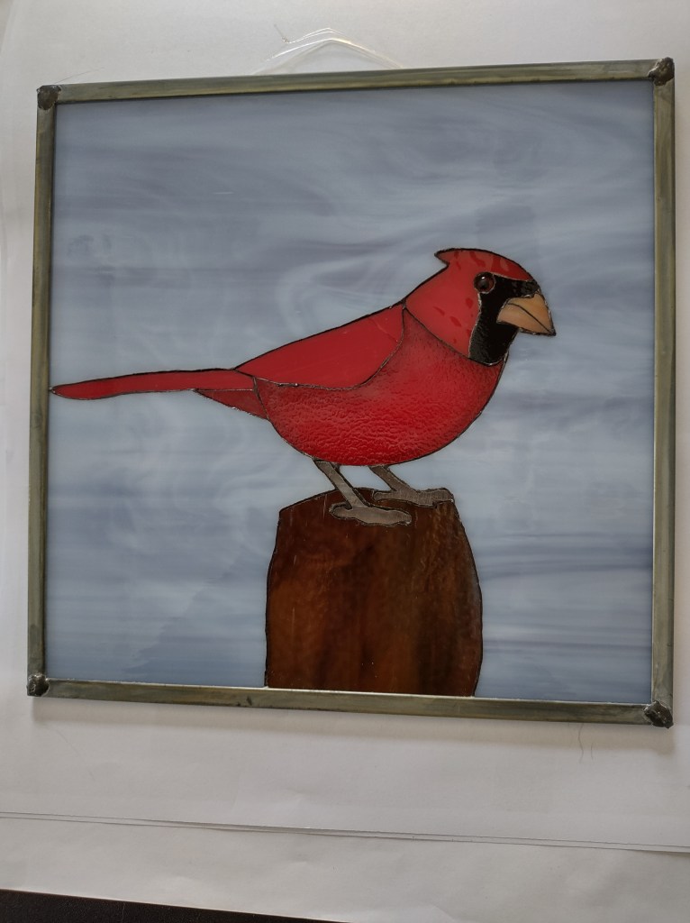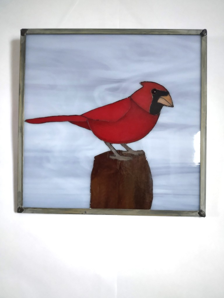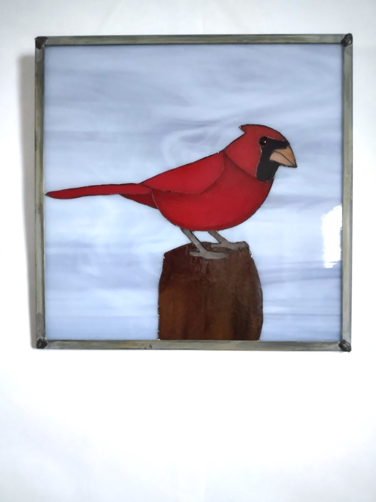 Cardinal #2 – $210 The male Northern Cardinal is perhaps the most colorful and recognizable common birds. Cardinals do not migrate and since they don’t molt, their brilliant red is displayed year round. Our re-creation is a male cardinal perched on a stump and comprised of stained glass, foiled, soldered and patinaed. Each piece is one-of-a-kind and an original design. Measures 9 ¼” x 9 ¼” and weighs 1# 11 oz.