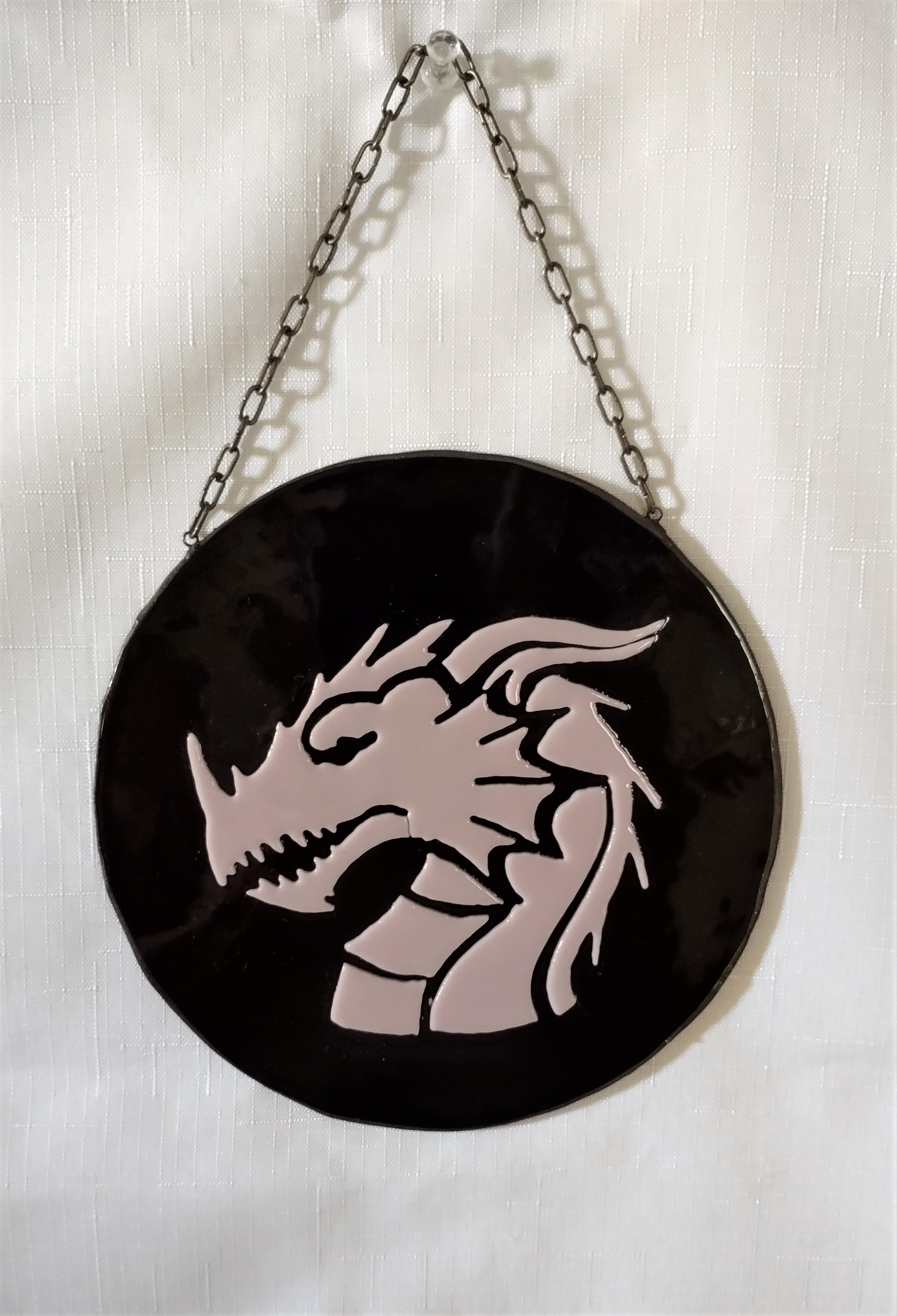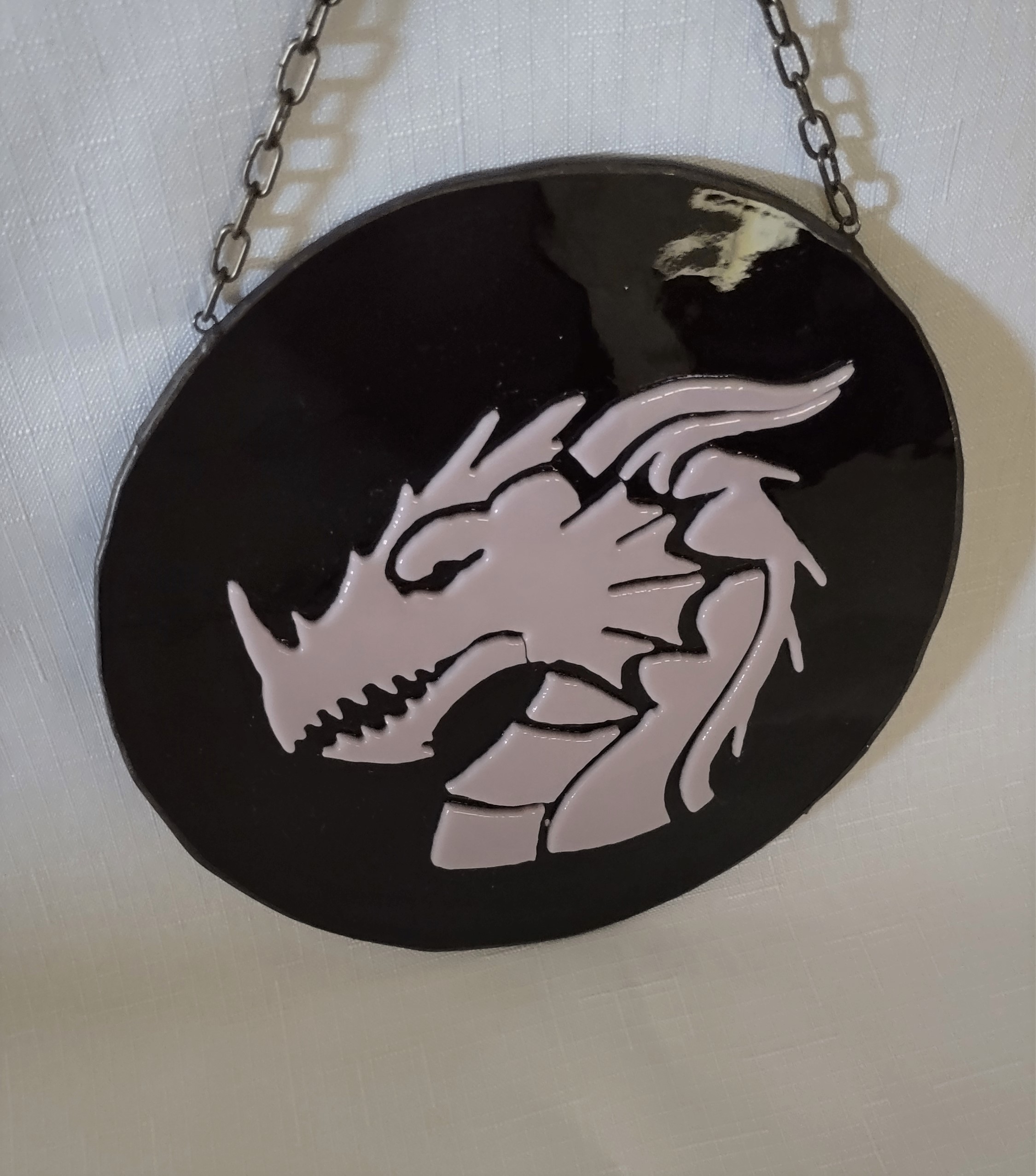 Dragonhead Sigil*, Lavender on Black – $115. This creation of stained glass has no magical powers, but let your imagination soar with the purple dragon! The glass sigil hangs from a chain to symbolize the imprisoned dragon. It is hand made from opaque black and lavender stained glass, cut and kiln fused. The piece is copper foiled in the Tiffany style, soldered at the edge and patinaed in black. It measures 7 inches in diameter and weighs 8.1 oz. *an inscribed or painted symbol, often in a circular form considered to have magical power.
