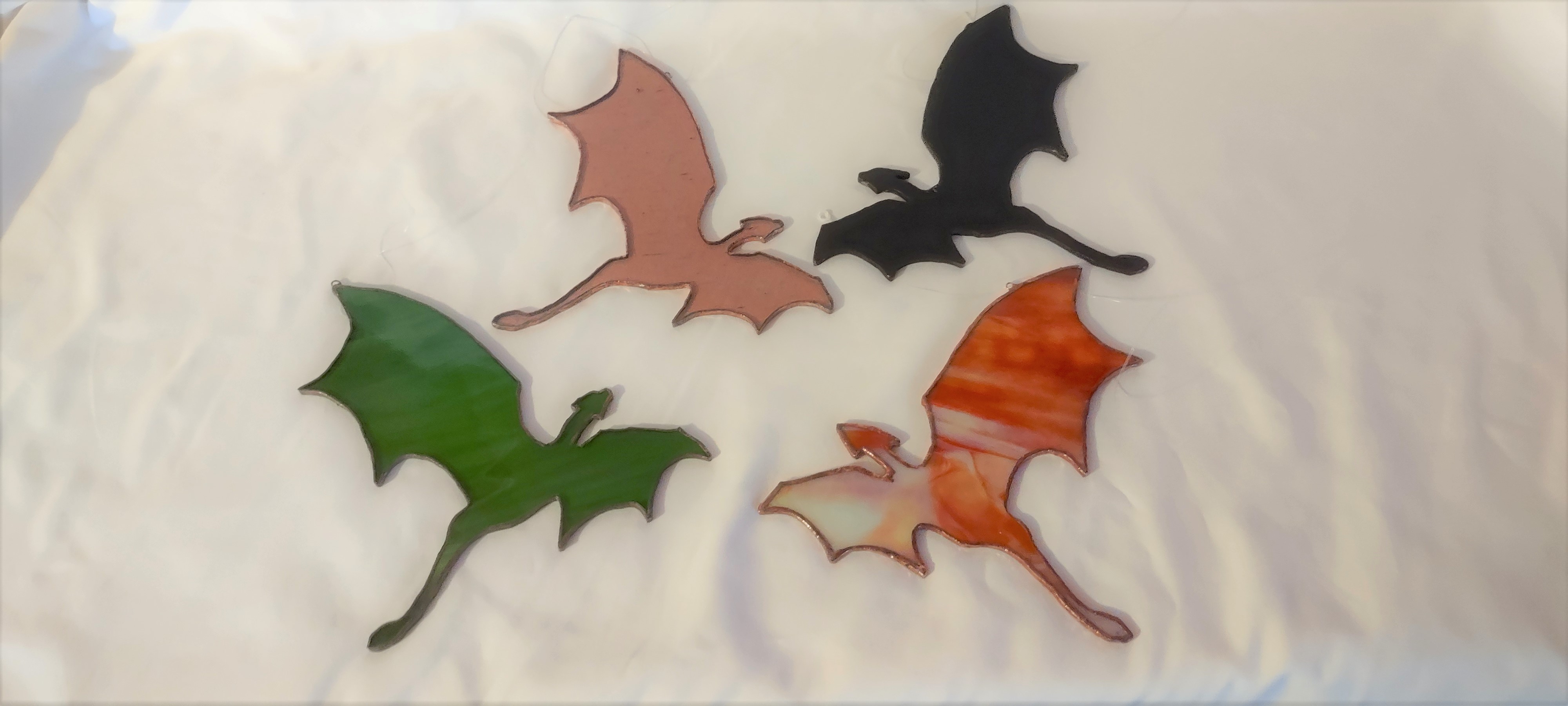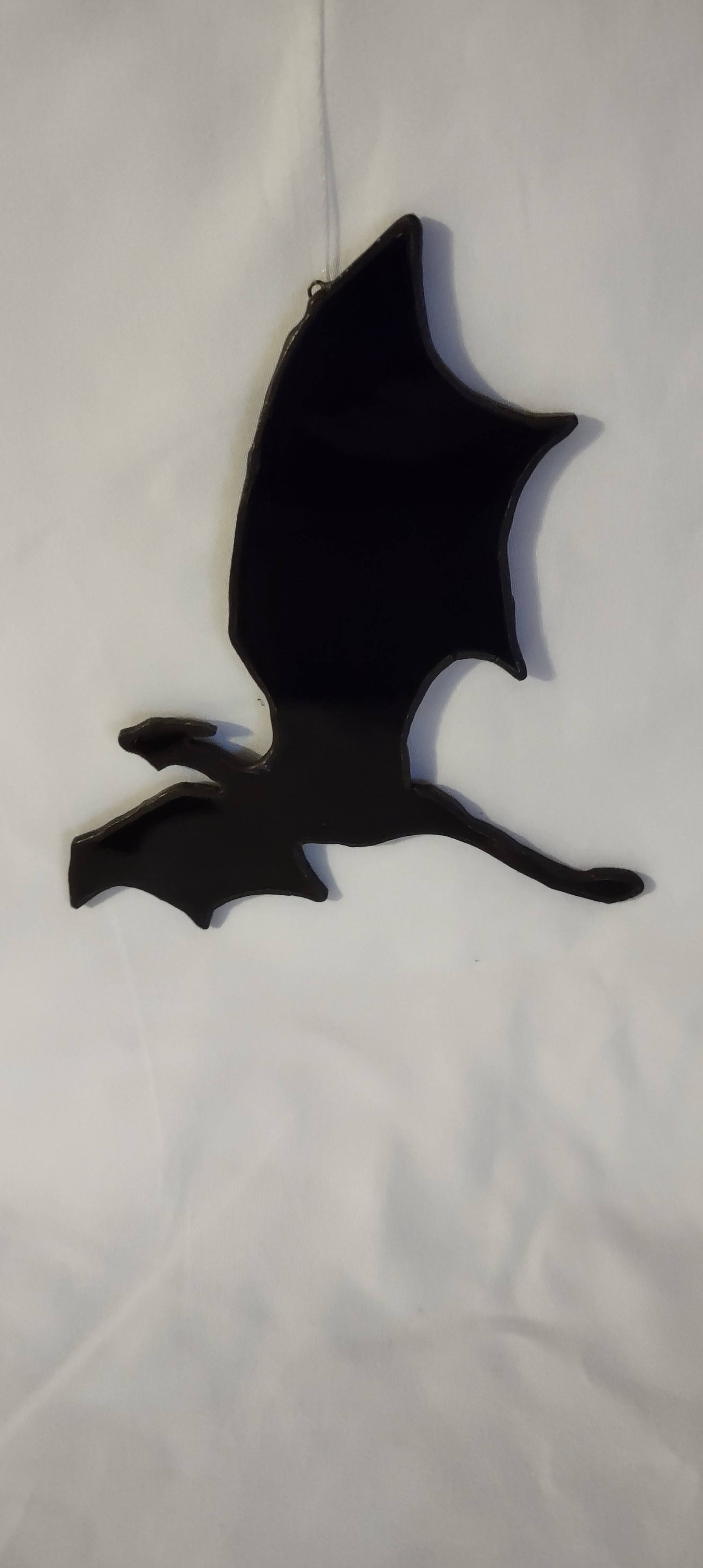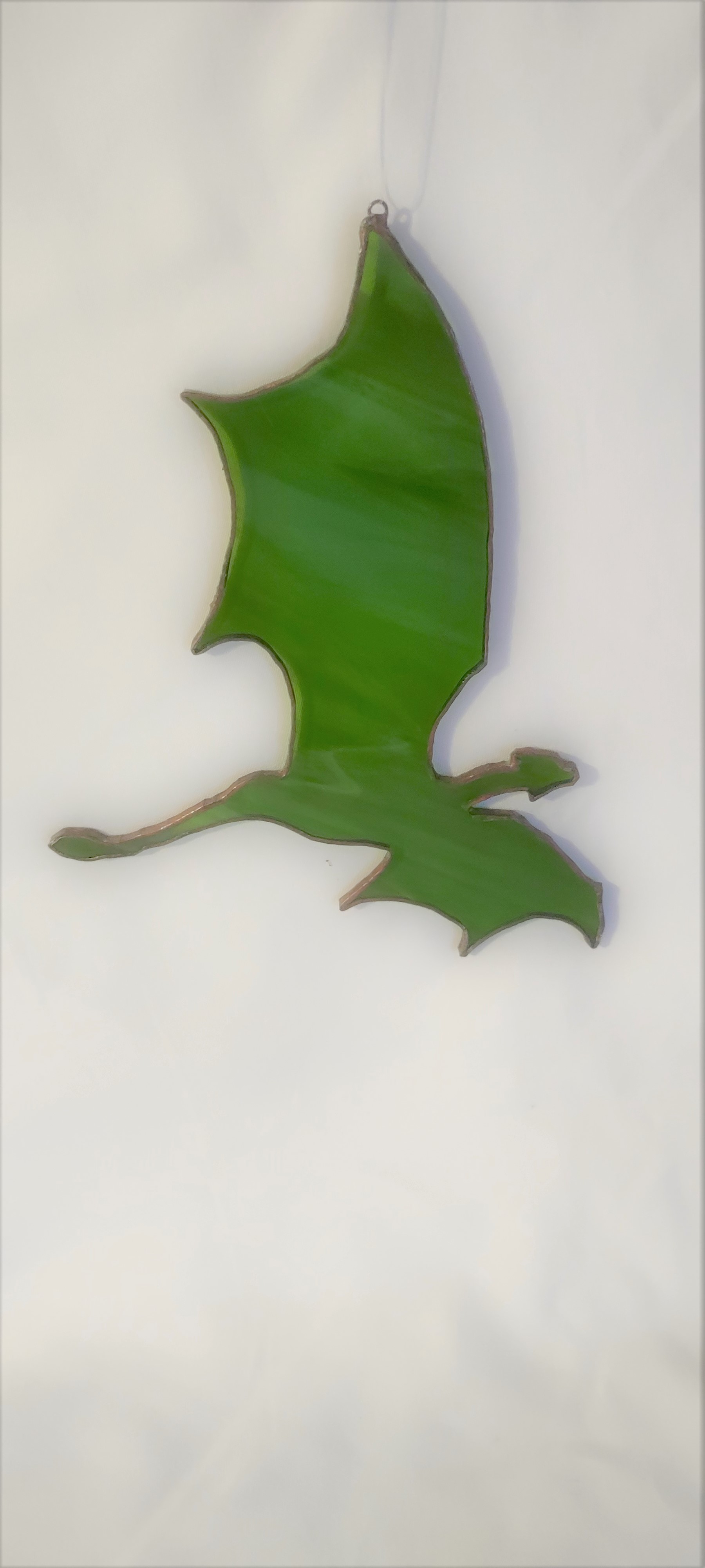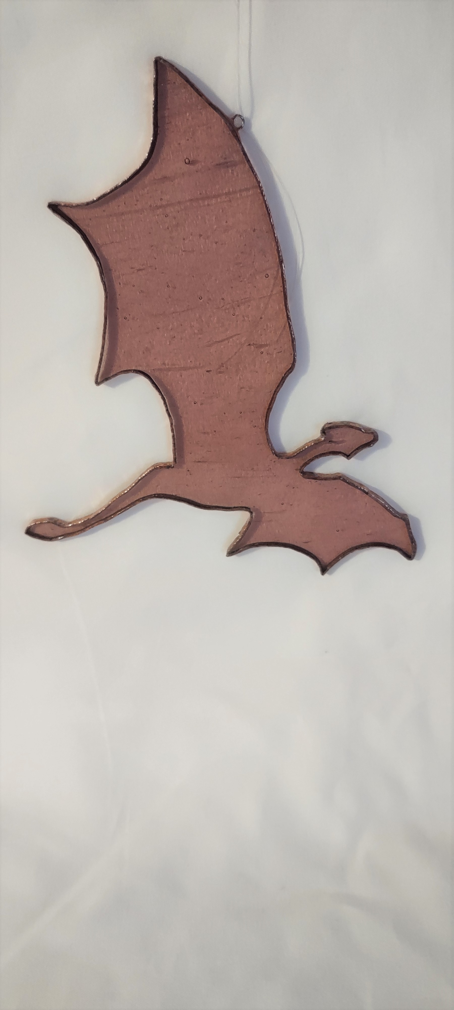 Dragon Soaring Suncatcher – $55. A Fantasy Piece – cut from stained glass of varying shades and textures, each piece hand-made and wrapped in copper foil, soldered and patinaed. It can be hung on a window or wall, or anywhere you’d like. Small hoops are added and monofilament for hanging. Color choices are constantly changing – please reach out to us for availability. KrimArtGlass.com