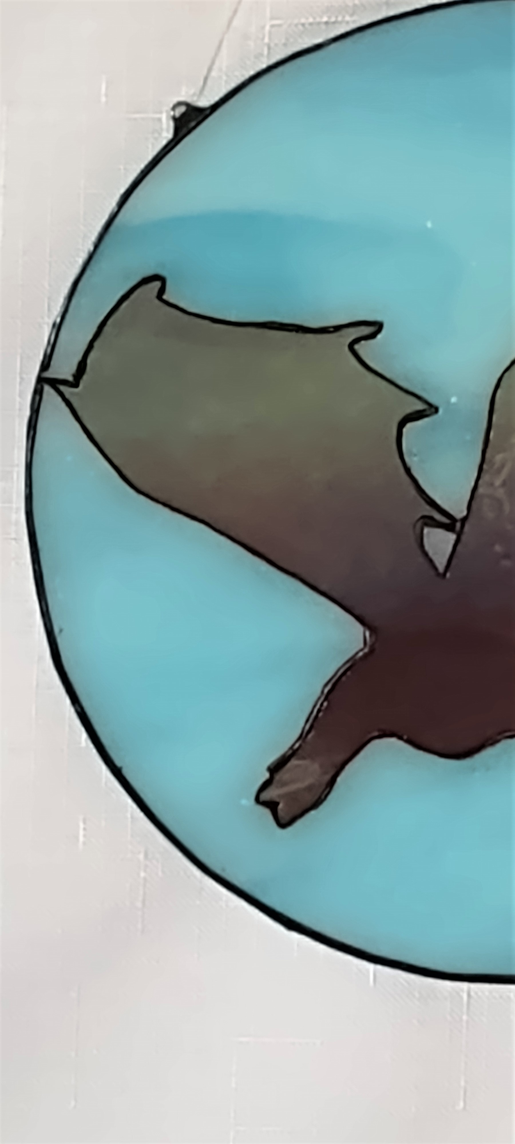 Dragonflight Sigil, Grey on Blue – $105. A Fantasy piece, this sigil has no magical powers. It is hand made from variegated grey and blue stained glass. Created in the Tiffany style, it is foiled and soldered, then patinaed in black. It measures 6 ¼ inches in diameter.