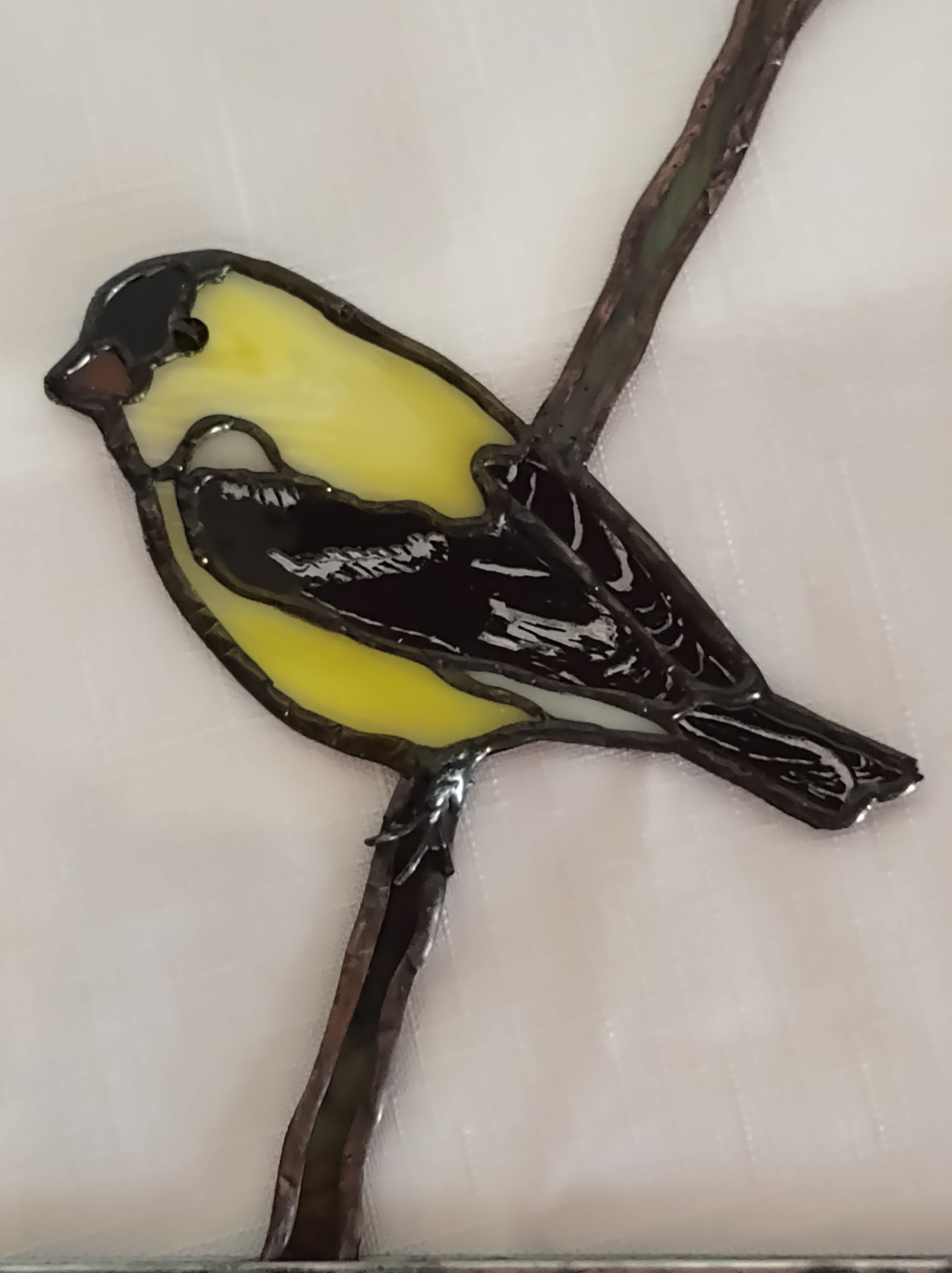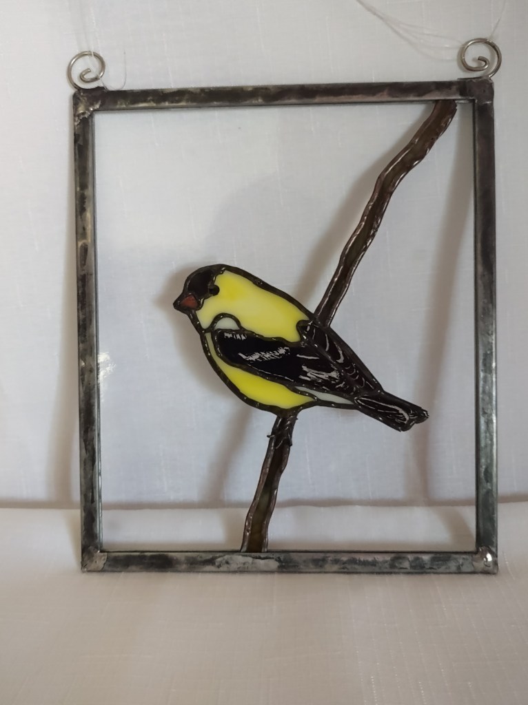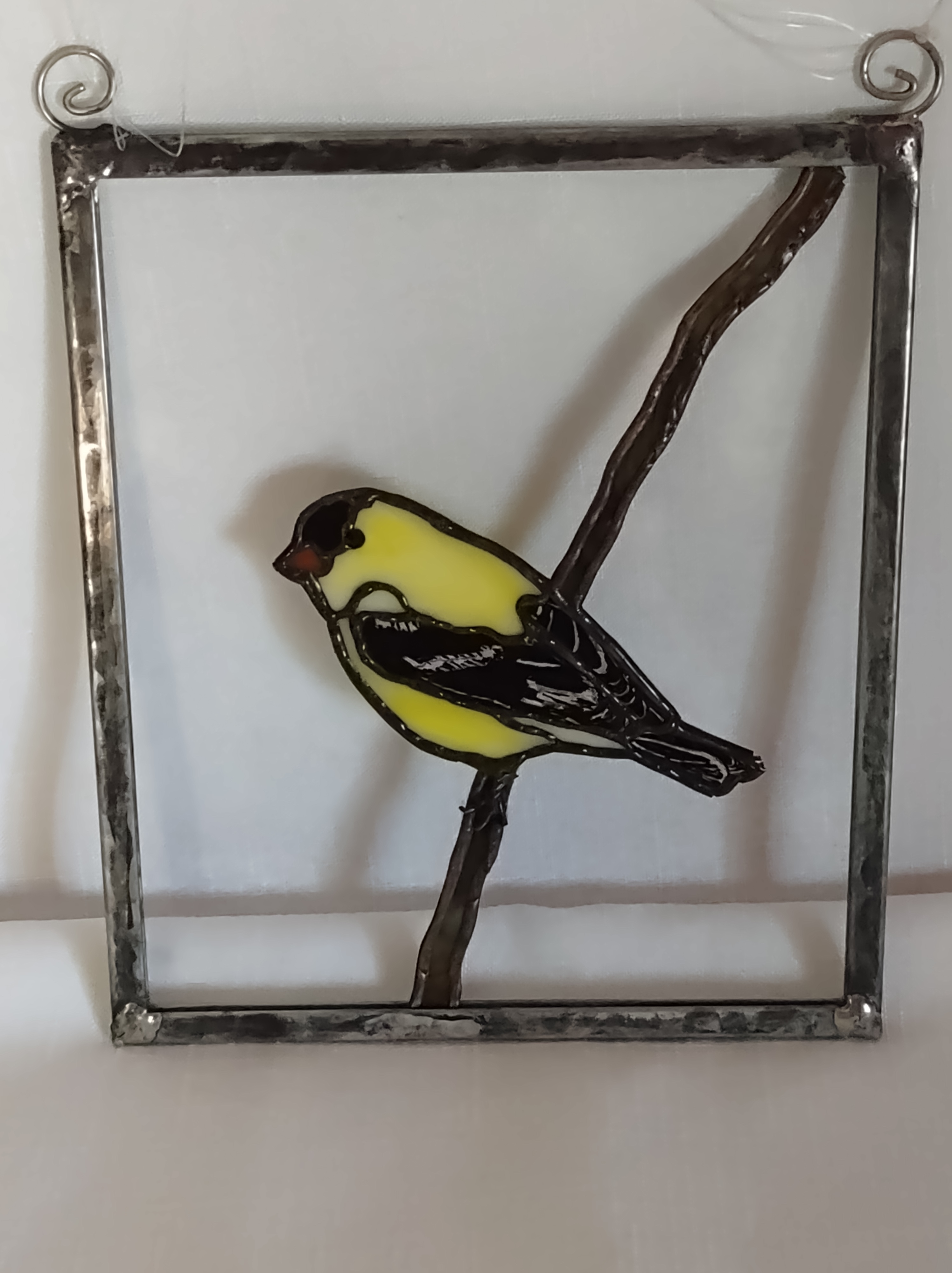 Male American Goldfinch stained glass panel. Original design and hand-crafted in the Tiffany style. Wings and tail are glass painted and kiln fired for detail; eyes is black Swarovski crystal and legs are patinaed copper wire. Panel is framed with zinc, stressed with patina and measures 6 ¼” x 7 ¼”. A tiny piece that does well in a window or as a wall hanging.
