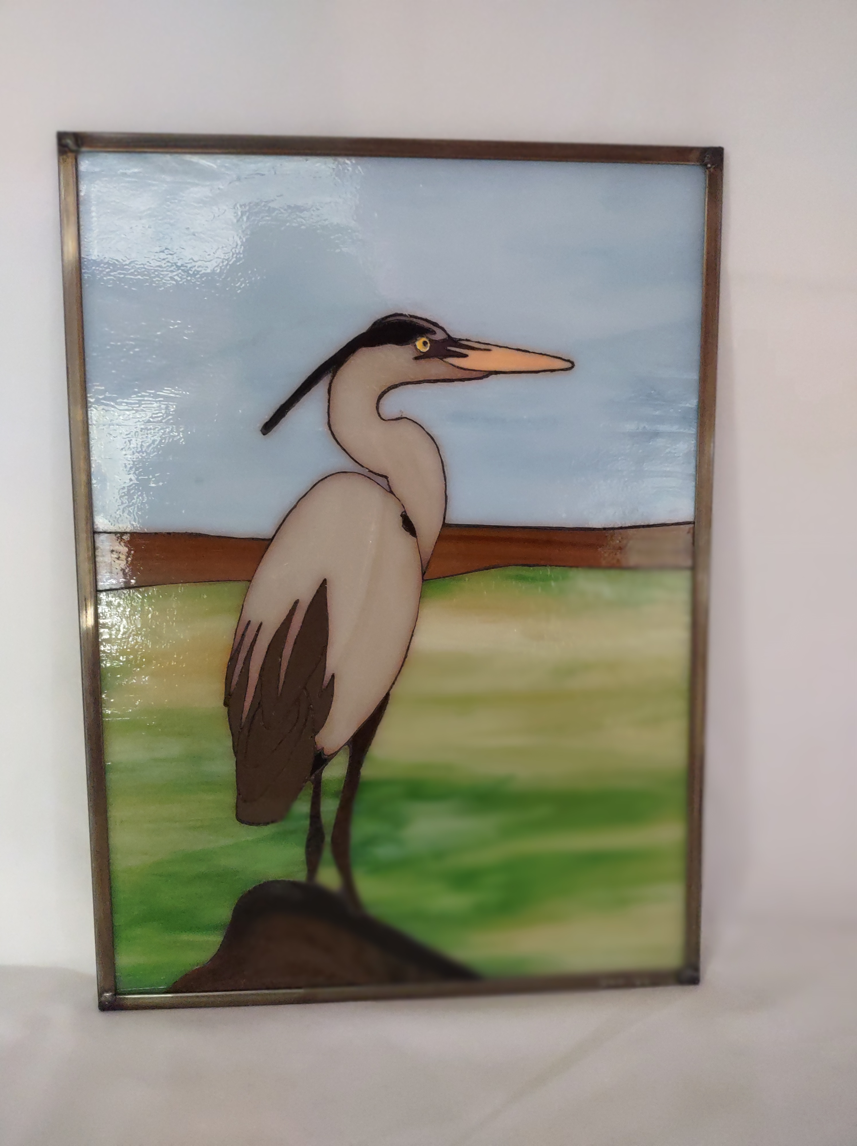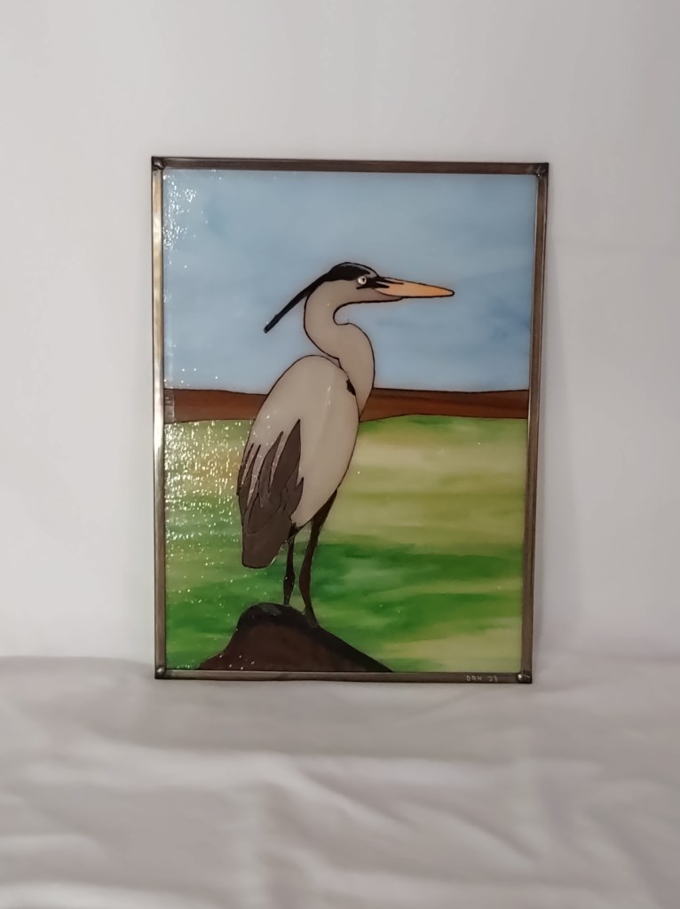 Stained Glass panel pictures a grey heron perched in a marsh. The heron is comprised of varying shades of white, grey and brown glass with a lacquered yellow eye. The background features the green marsh waters, distant shoreline and sky. Done in the Tiffany style, this panel is copper foiled, soldered, patinaed and framed in blue-stained zinc. Panel measures 10 ¼” x 14″ high, weight is 1# 14 oz and shows well as a wall hanging. A one-of-a-kind, original design. Please visit our shop at KrimArtGlass.com for other “flowers, flyers and fantasy” creations.