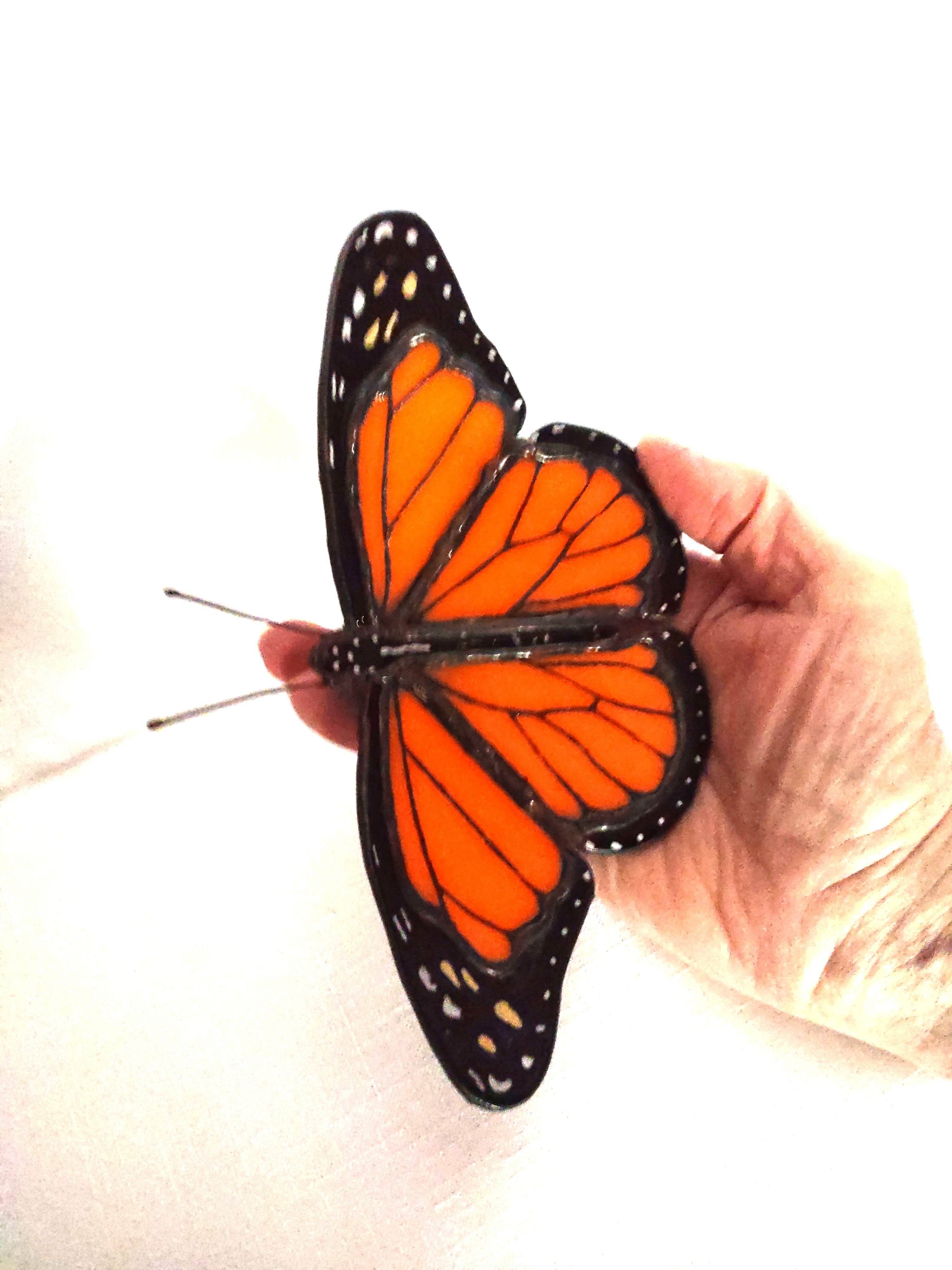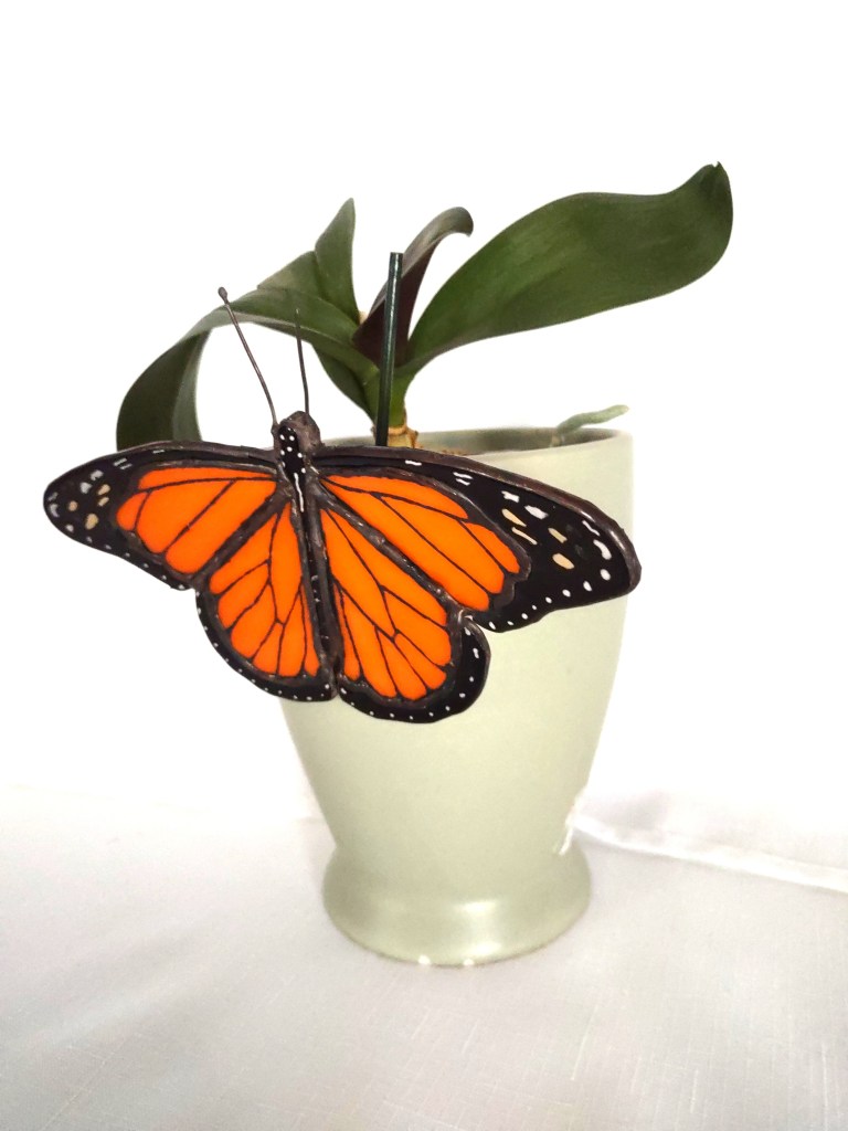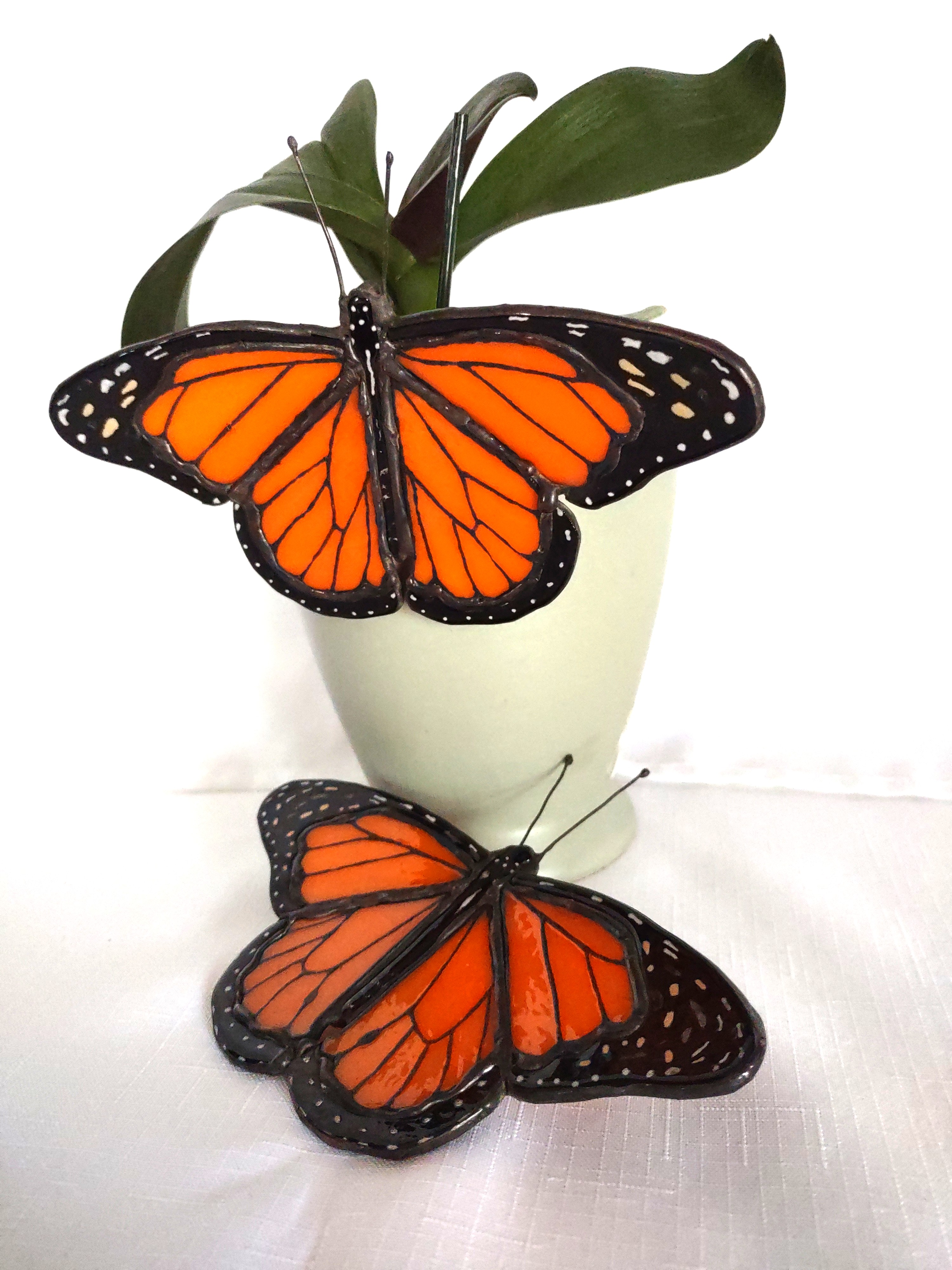 Original design – each monarch is different! Created with stained glass, glass painted and kiln fired for detail and permanency. Can be free-standing or hanging, the wing-span is around 7 inches.