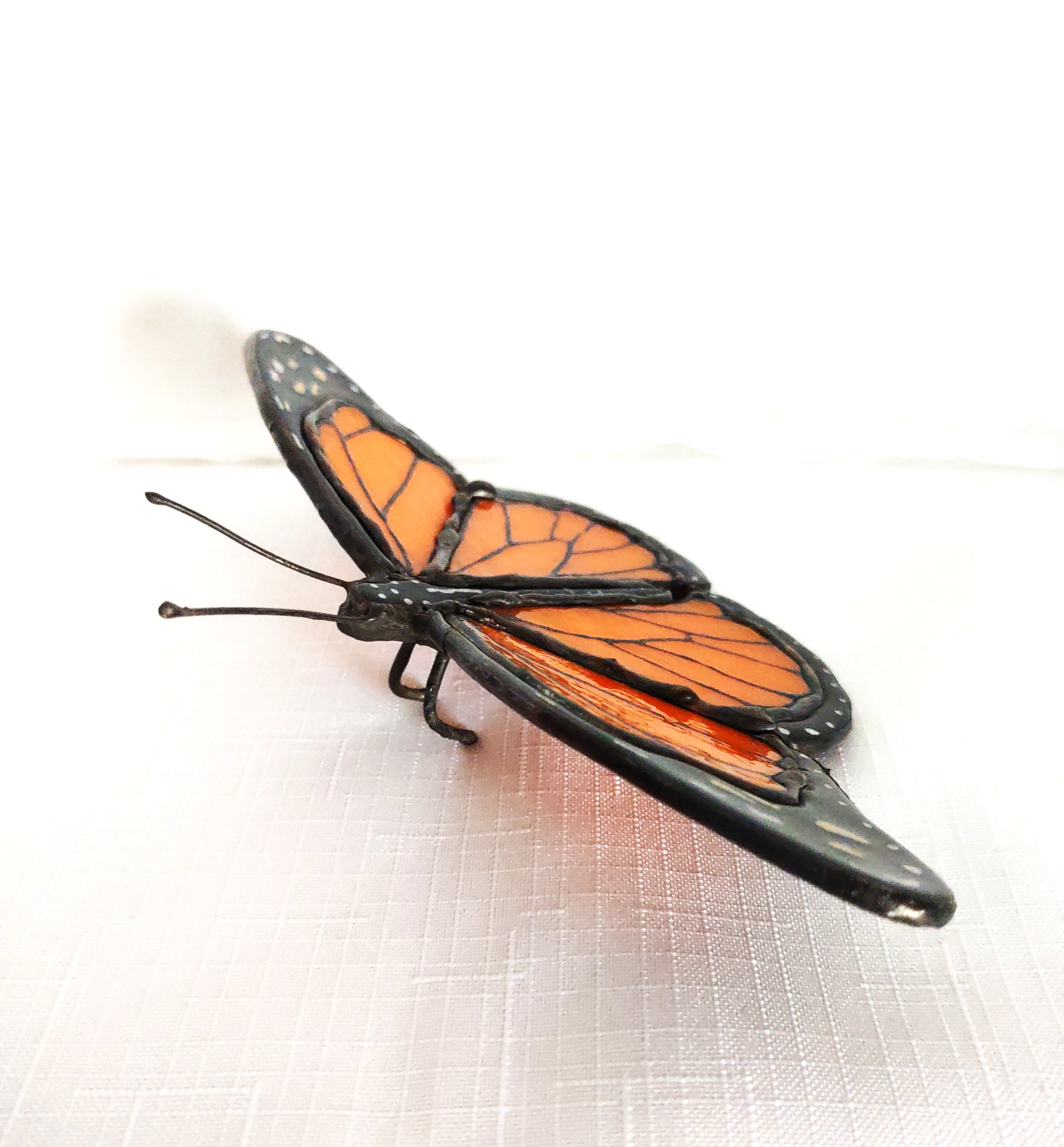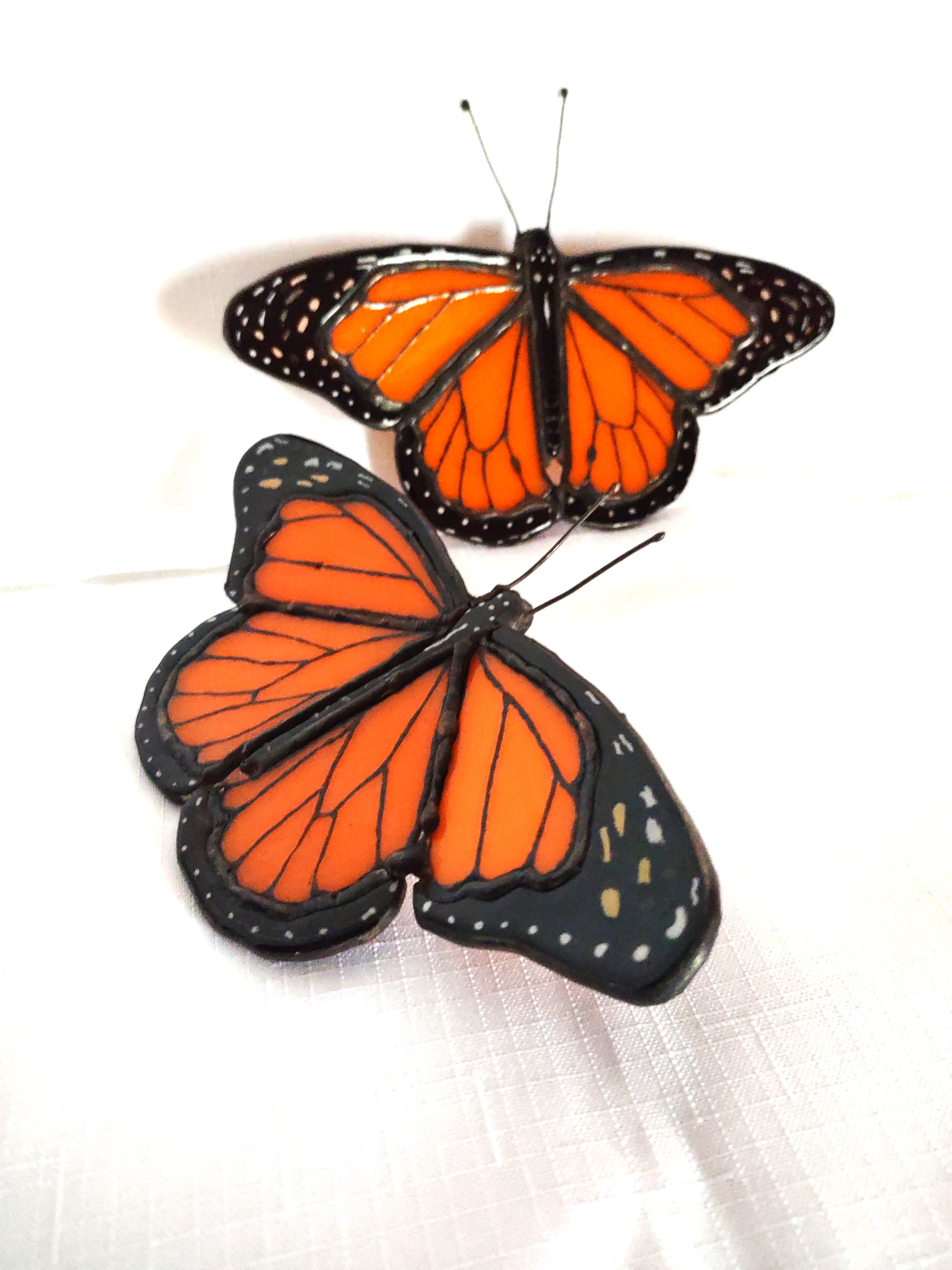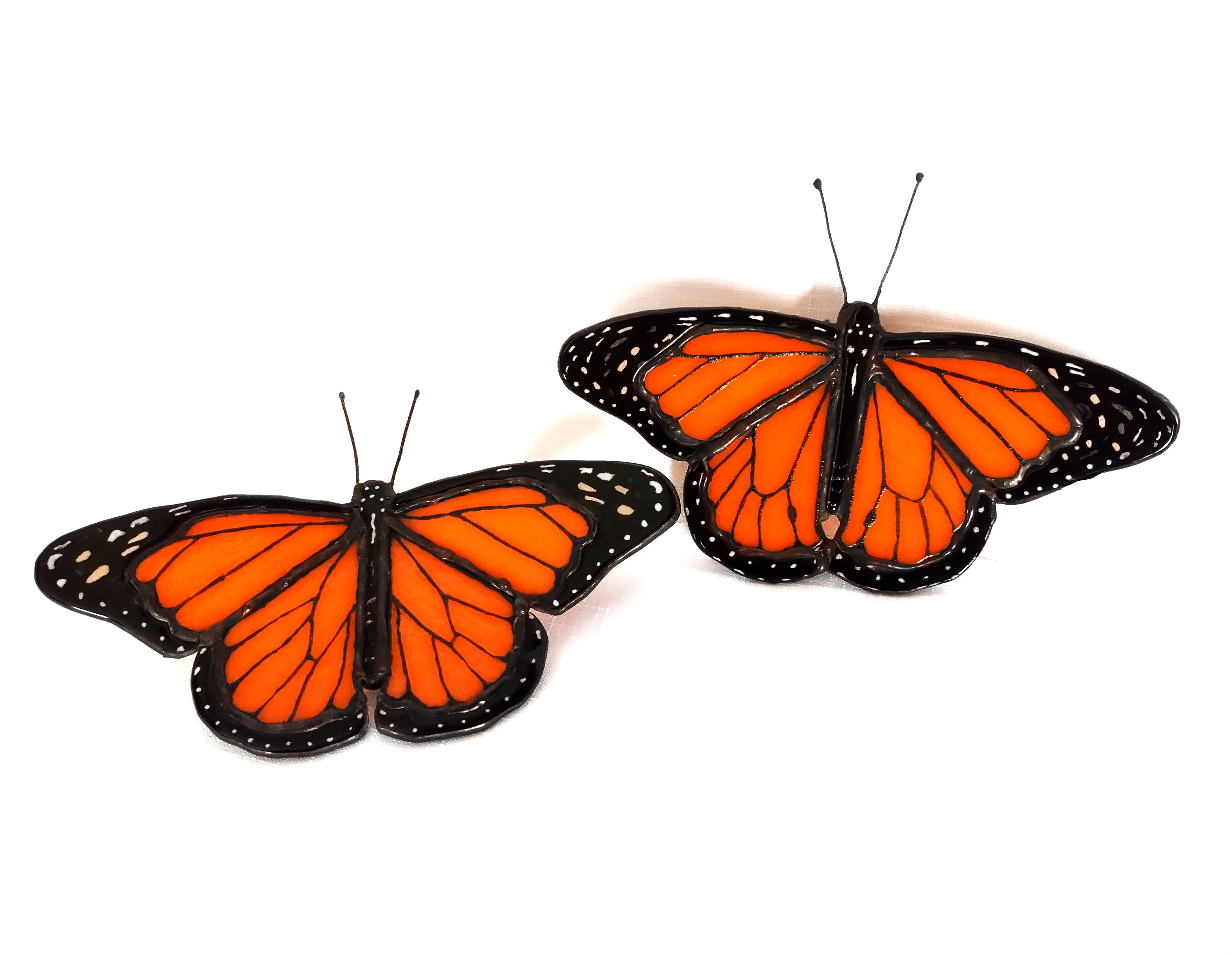 Original design – each monarch is different! Created with stained glass, glass painted and kiln fired for detail and permanency. Can be free-standing or hanging, the wing-span is around 7 inches.