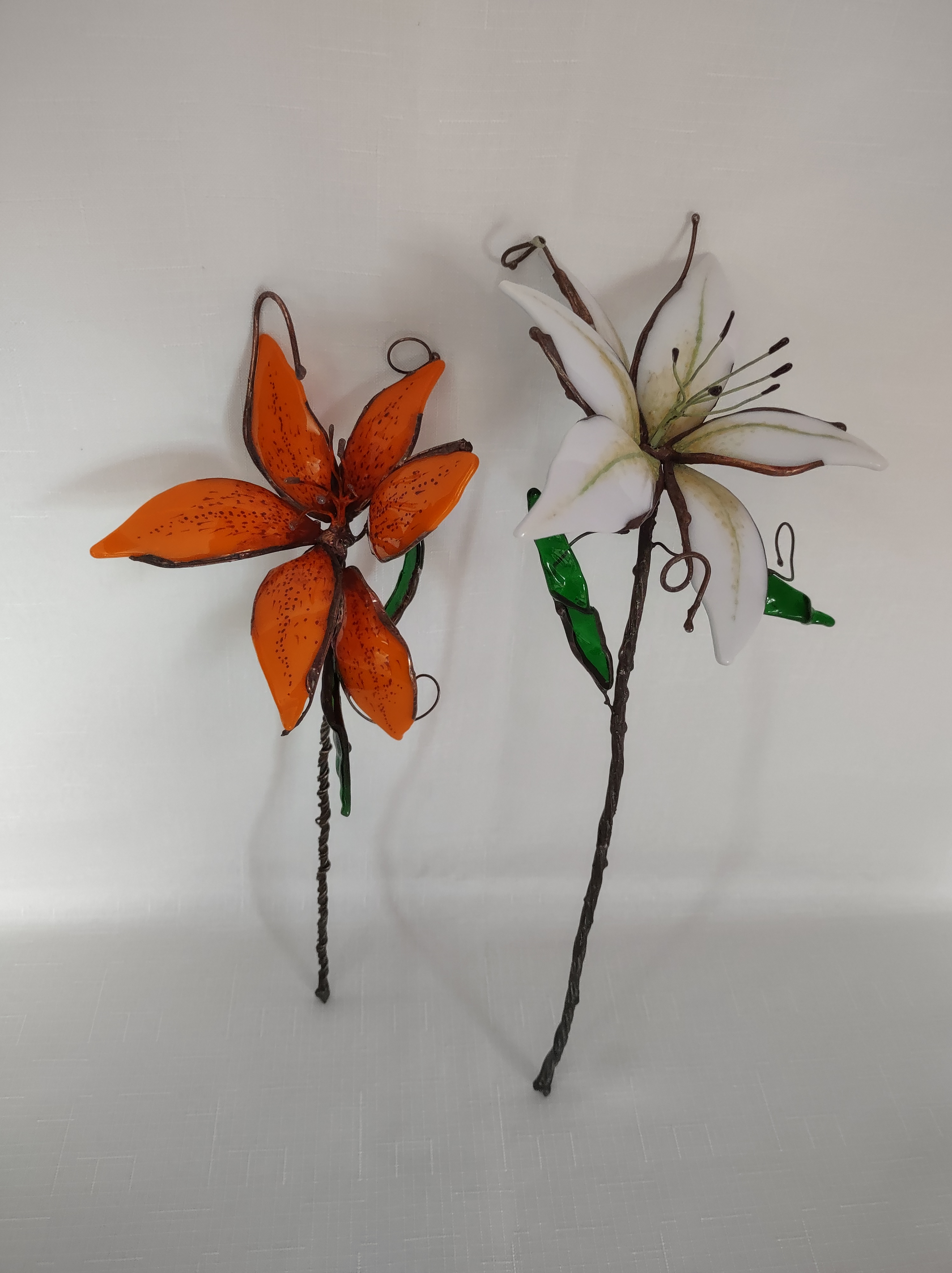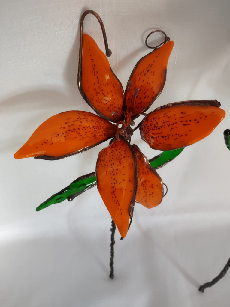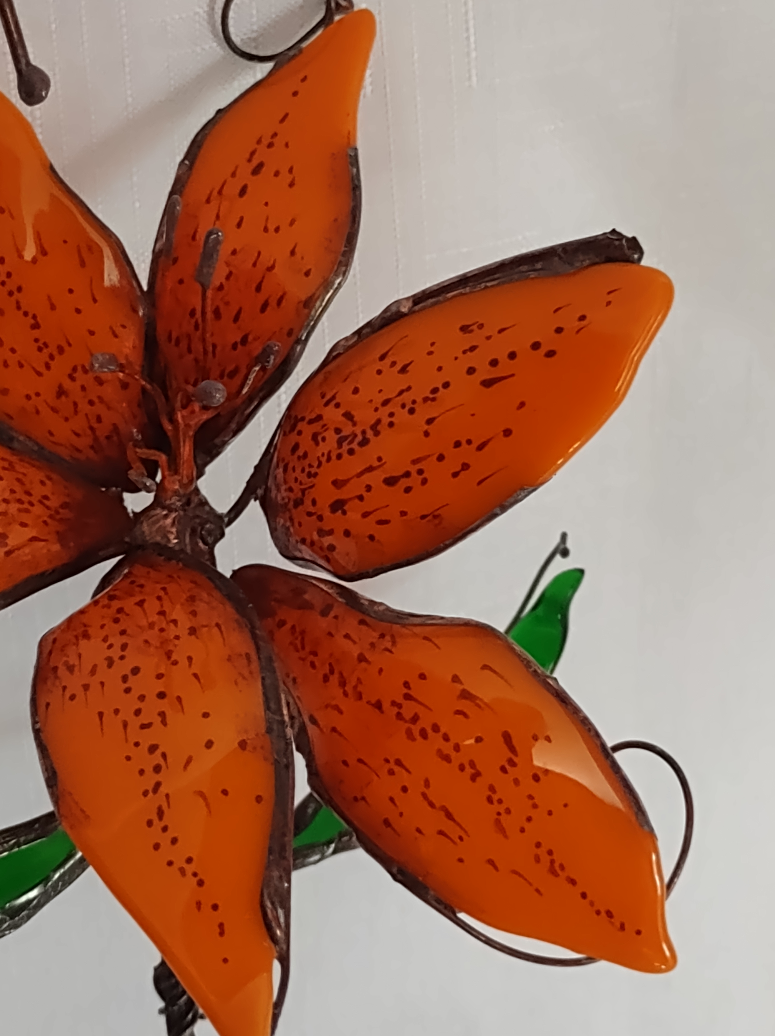 The Orange Daylily blooms only one time, unless it is created from stained glass! This Lily will bring color to your home year round. The flower petals are cut from orange striated glass, fired for shape and texture. The leaves are deep green stained glass, also fired for shaping. Petals and leaves are partially wrapped with copper foil, and solder joined. The centers are created from copper wire, soldered and lacquered. The stem is twisted copper wire, solder joined to the flower and petals. Various shades of patina are applied for effect. The piece is 12.5 inches high and 6 inches across.