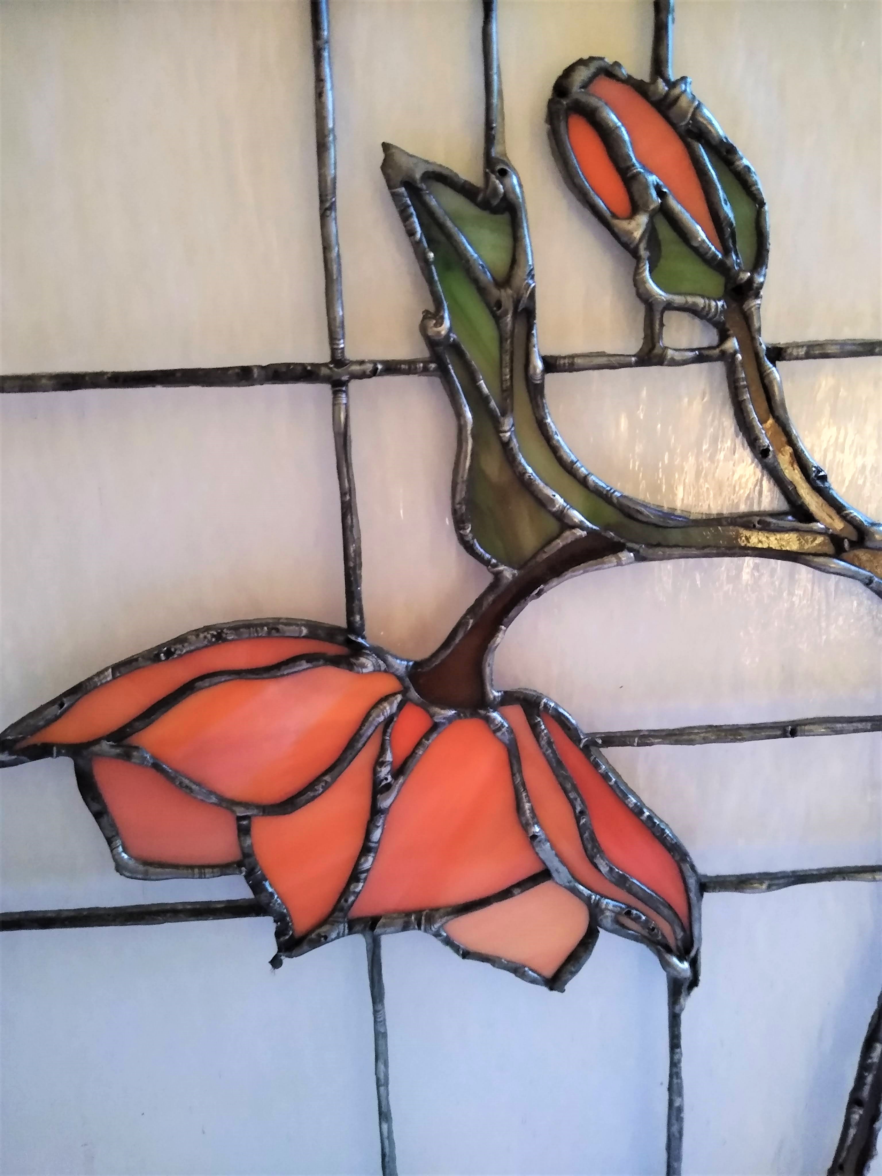Orange Poppy Panel – $205. Classic Orange Poppy has a short-lived bloom, but adds color and delight to the garden. It is presented in profile for this design, created in the traditional Tiffany-style glass. Can be displayed in the window, but shows nicely as a wall-hanging as well. This piece measures 10 1/4 inches by 9 3/4 inches – the Poppy is opaque orange glass, variegated brown and green for the stem and leaves, with copper/bronze patina. The frame is zinc with antique patina. A one-of-a-kind creation. All our art is unique and original – would make a great gift for the gardener!