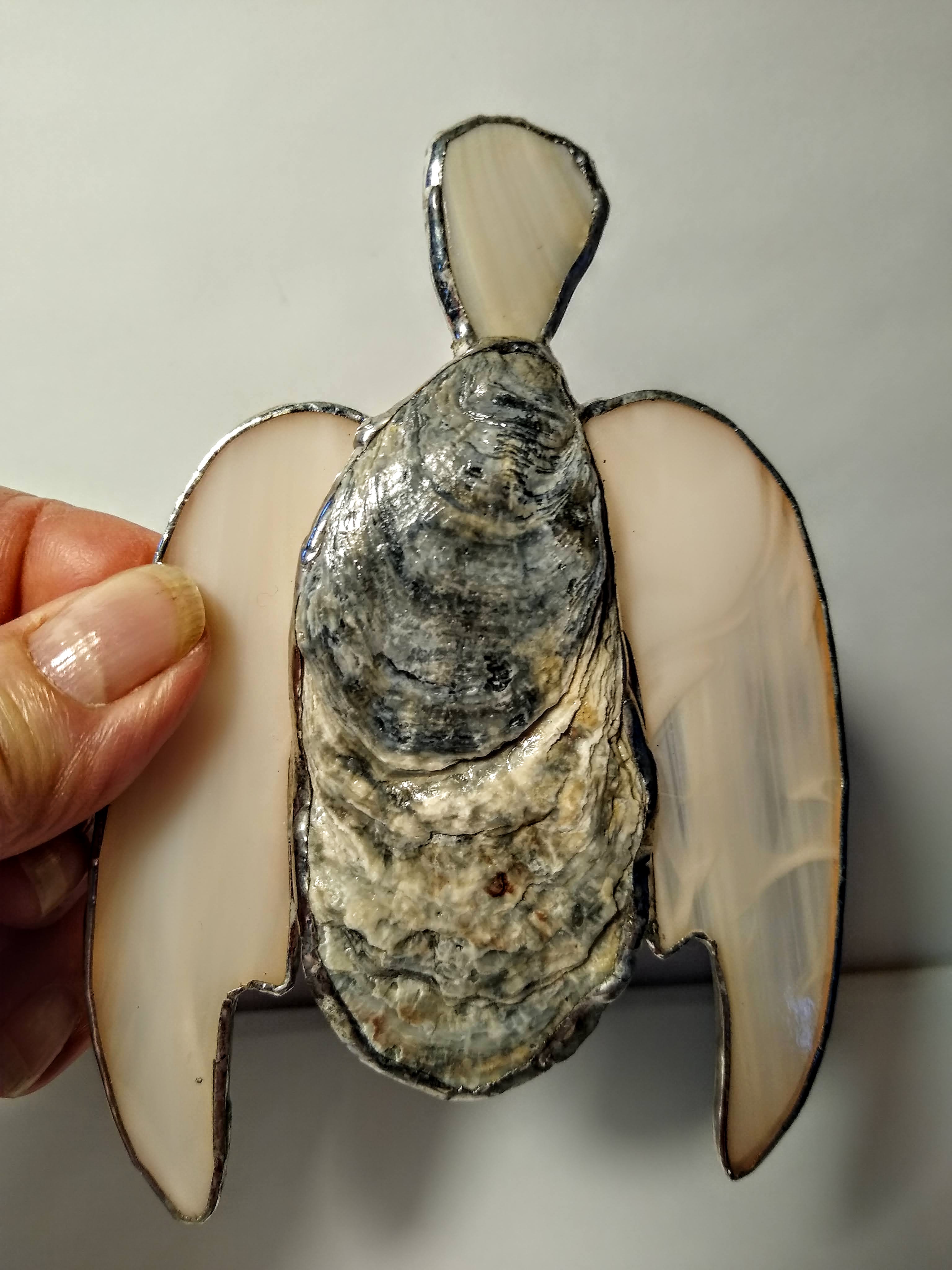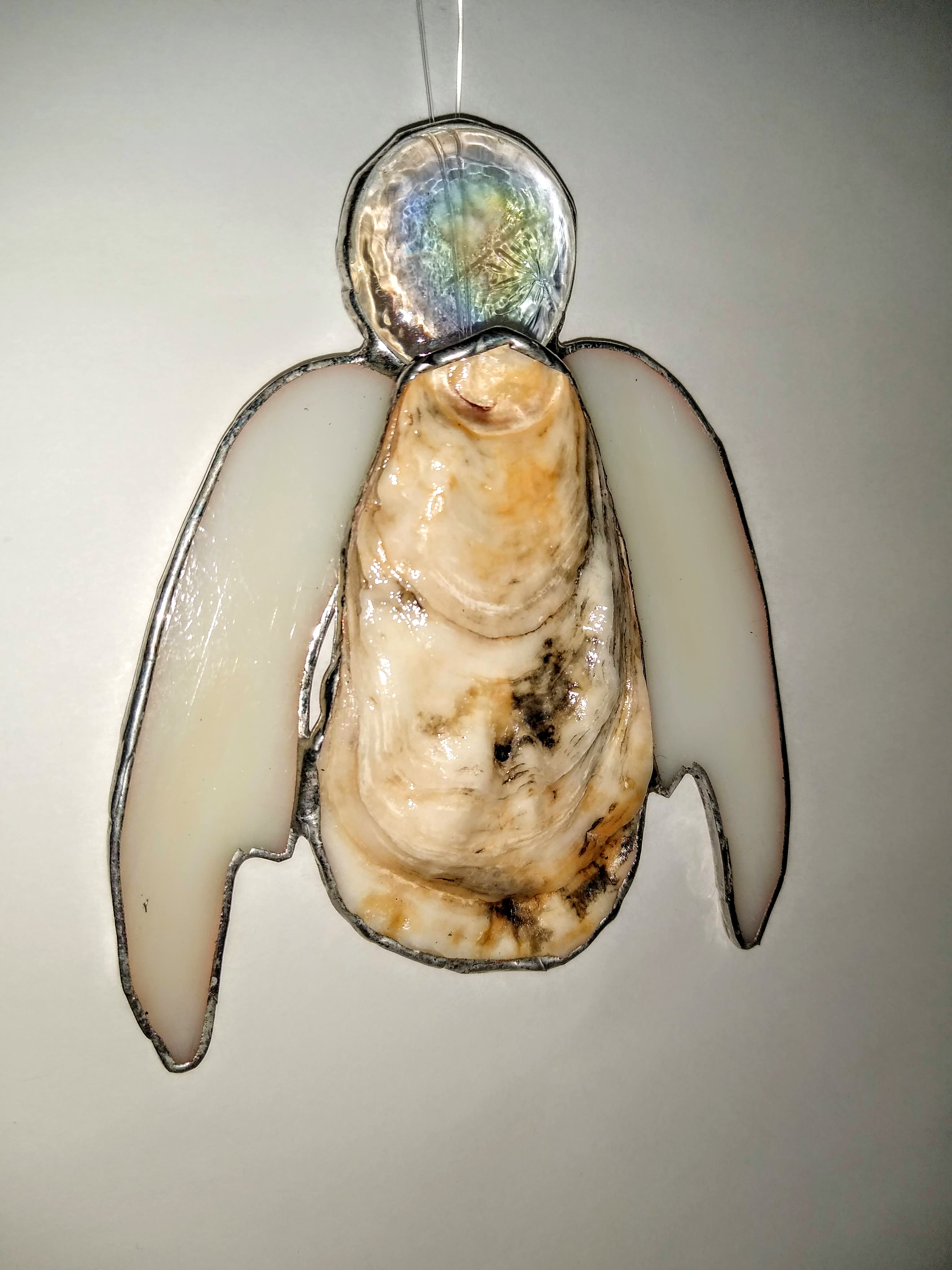 Oyster Shell Angels (small) – $59 each. Shell Angels – hand-crafted, decorative. Each Angel is wrapped in copper foil with silver patina and is suspended by monofilament and can be hung in window or anywhere you like! A great gift for any occasion or an addition to your personal collection. All our shell Angels are made from East-coast oysters!