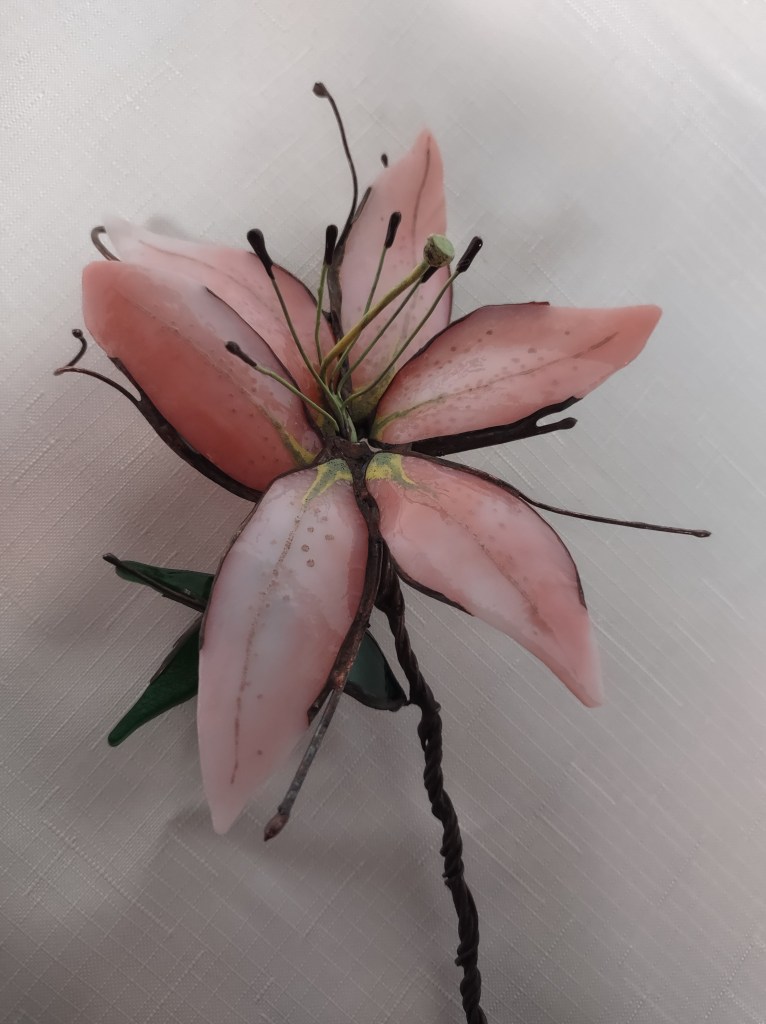 The Pink Lily will bloom in your home year round. The flower petals are cut from pink varigated glass, tinted with green, yellow and crimson blended liquid glass and fired for shape and texture. The leaves are deep green stained glass, also fired for shaping. Petals and leaves are partially wrapped with copper foil, and solder joined. The centers are created from copper wire, soldered and lacquered. The stem is twisted copper wire, solder joined to the flower and petals. Various shades of patina are applied for effect. The piece is 13.5 inches high and 6.5 inches across.