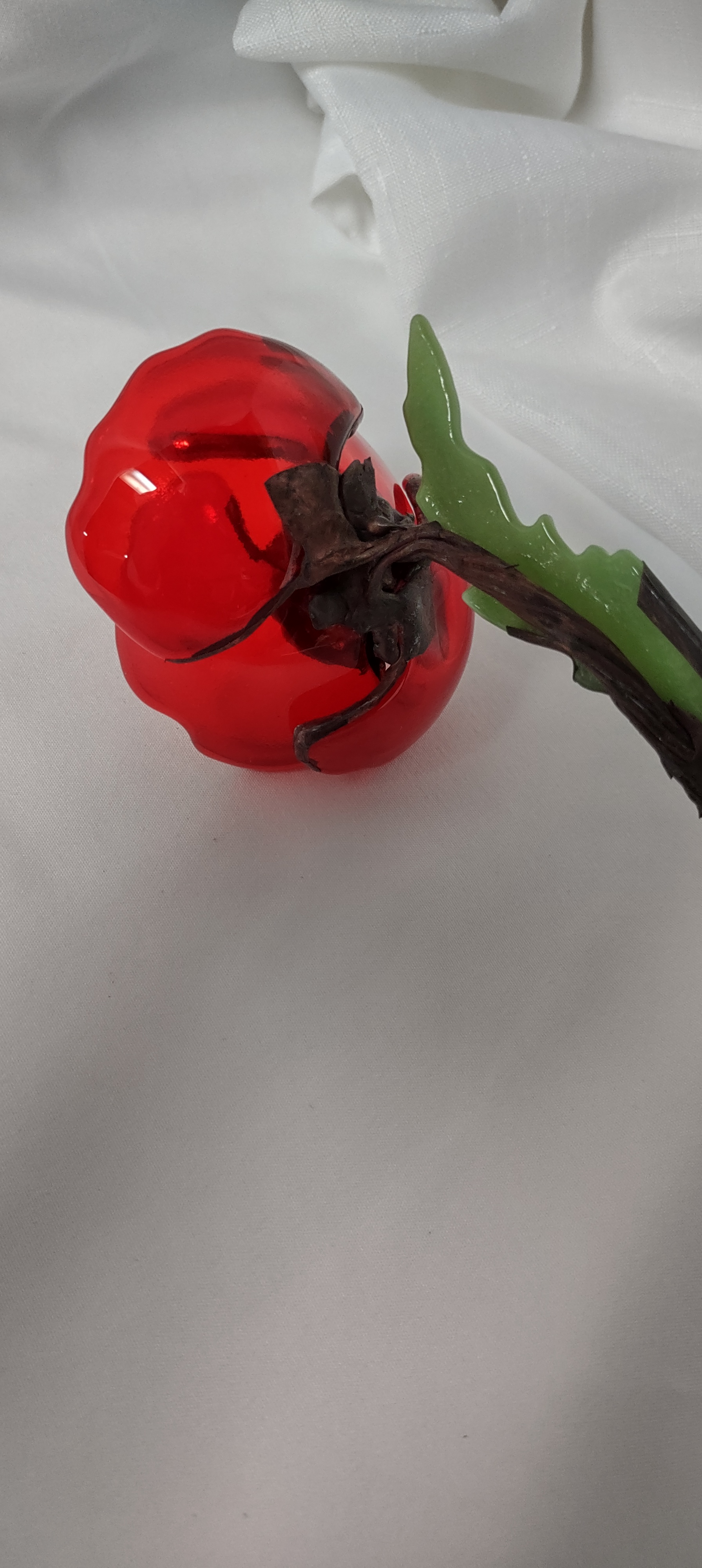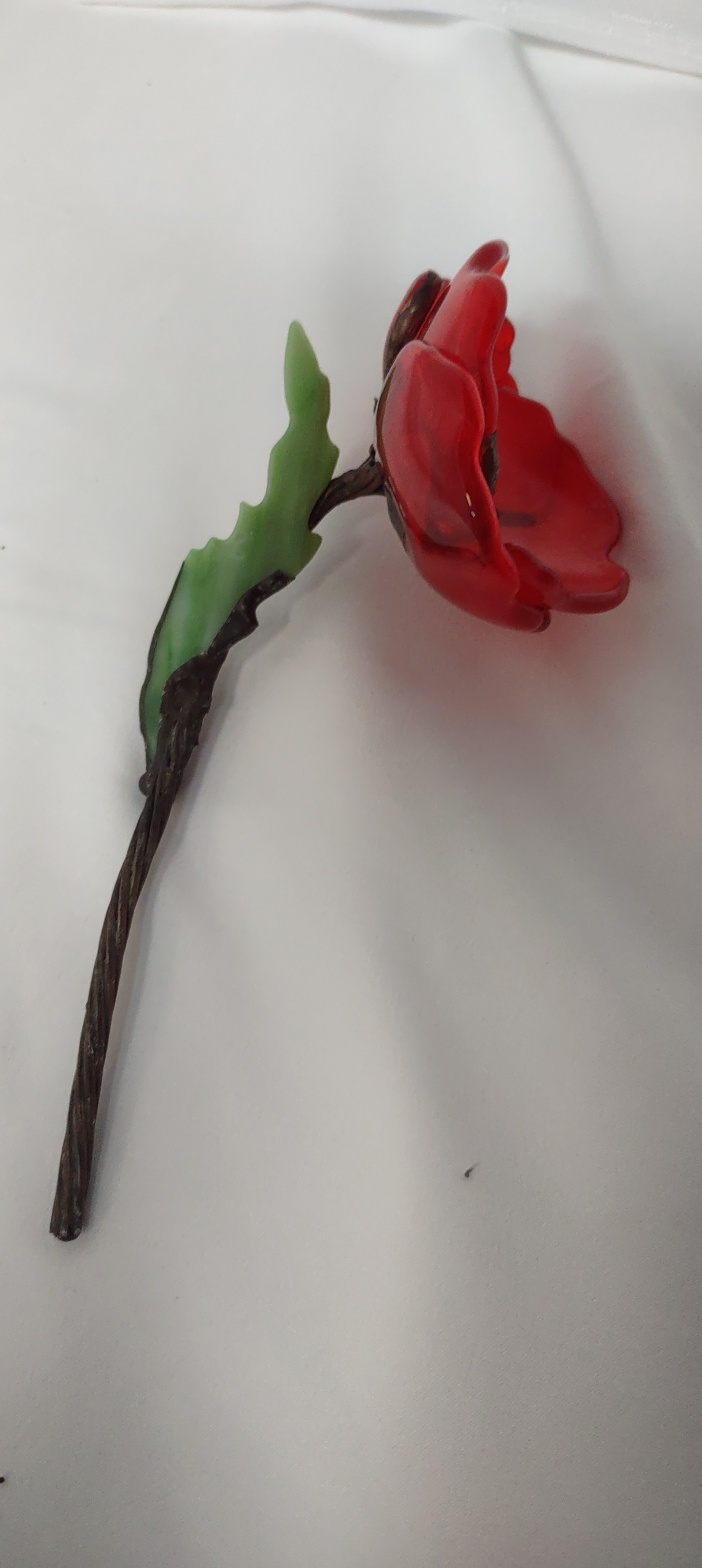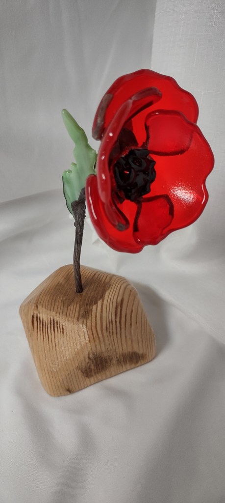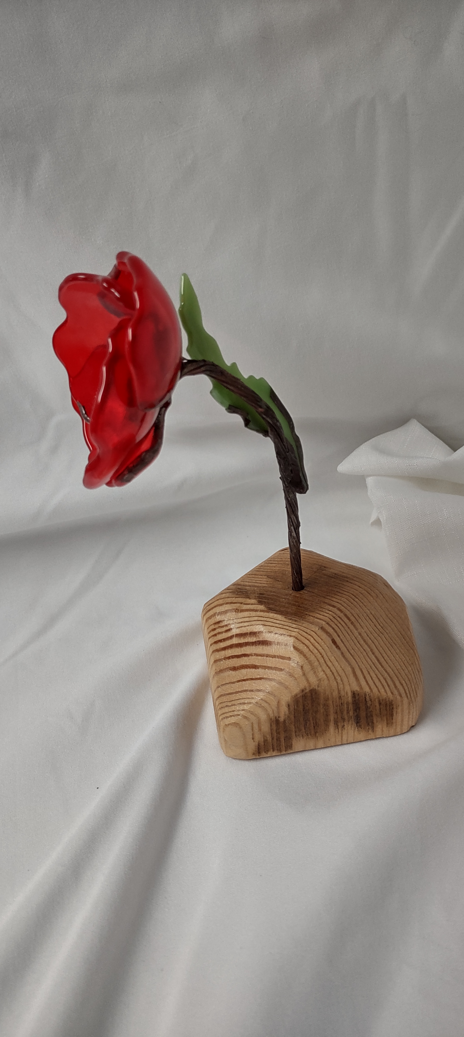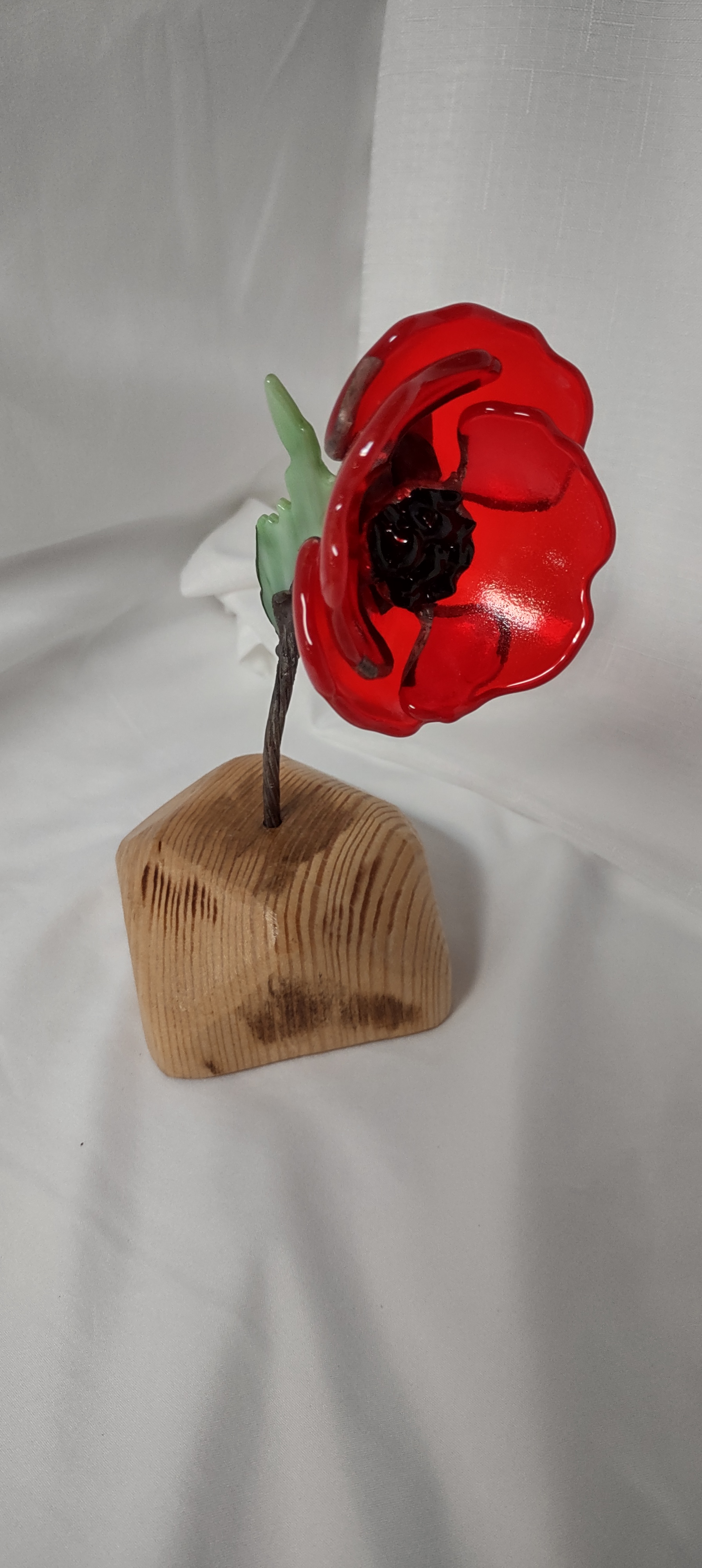 The petals are cut from red glass that is fire-slumped to shape. After firing, the glass petals are partially wrapped in copper foil, soldered, and joined. The center is shattered black glass, fired to fuse, soldered, and joined to the petals. The leaf is green glass, cut and fire-slumped, partially foiled and soldered. The flower and leaf are solder joined to the twisted copper wire, which has been soldered. Various patina are used on the flower, center, leaf and stem. The flower can be removed from the wood block. The flower measures 7″x5″, with block 7 1/4″x5″.