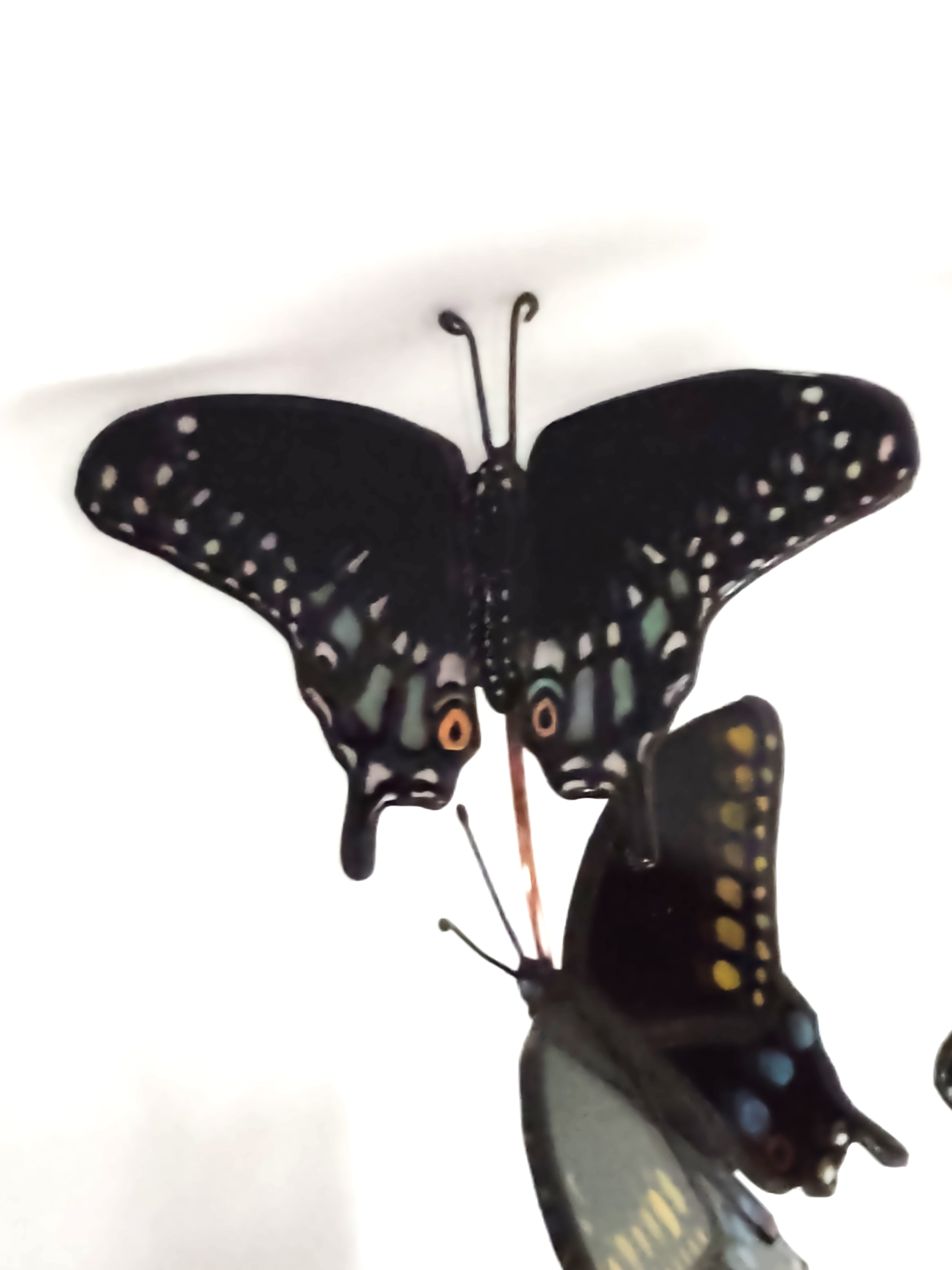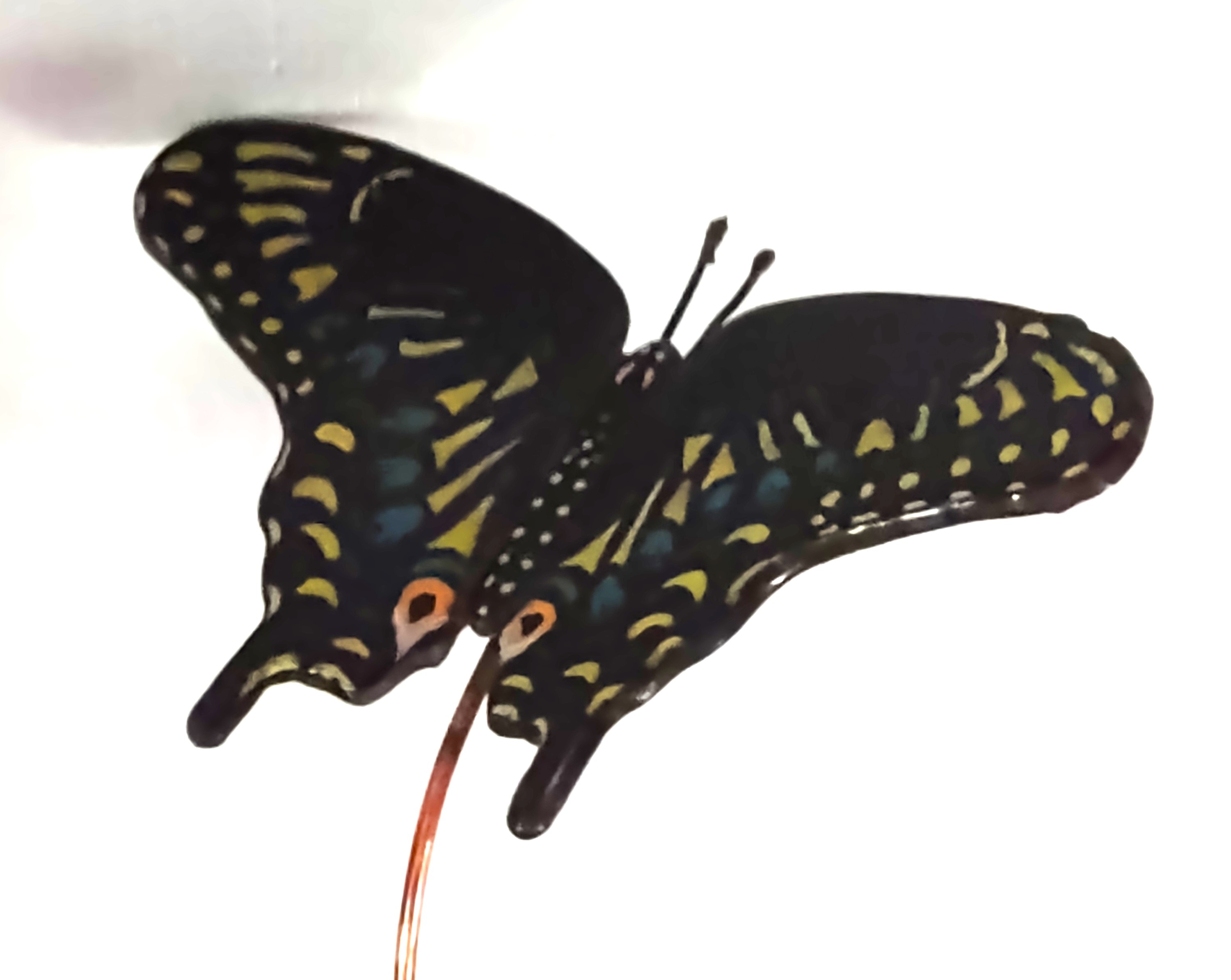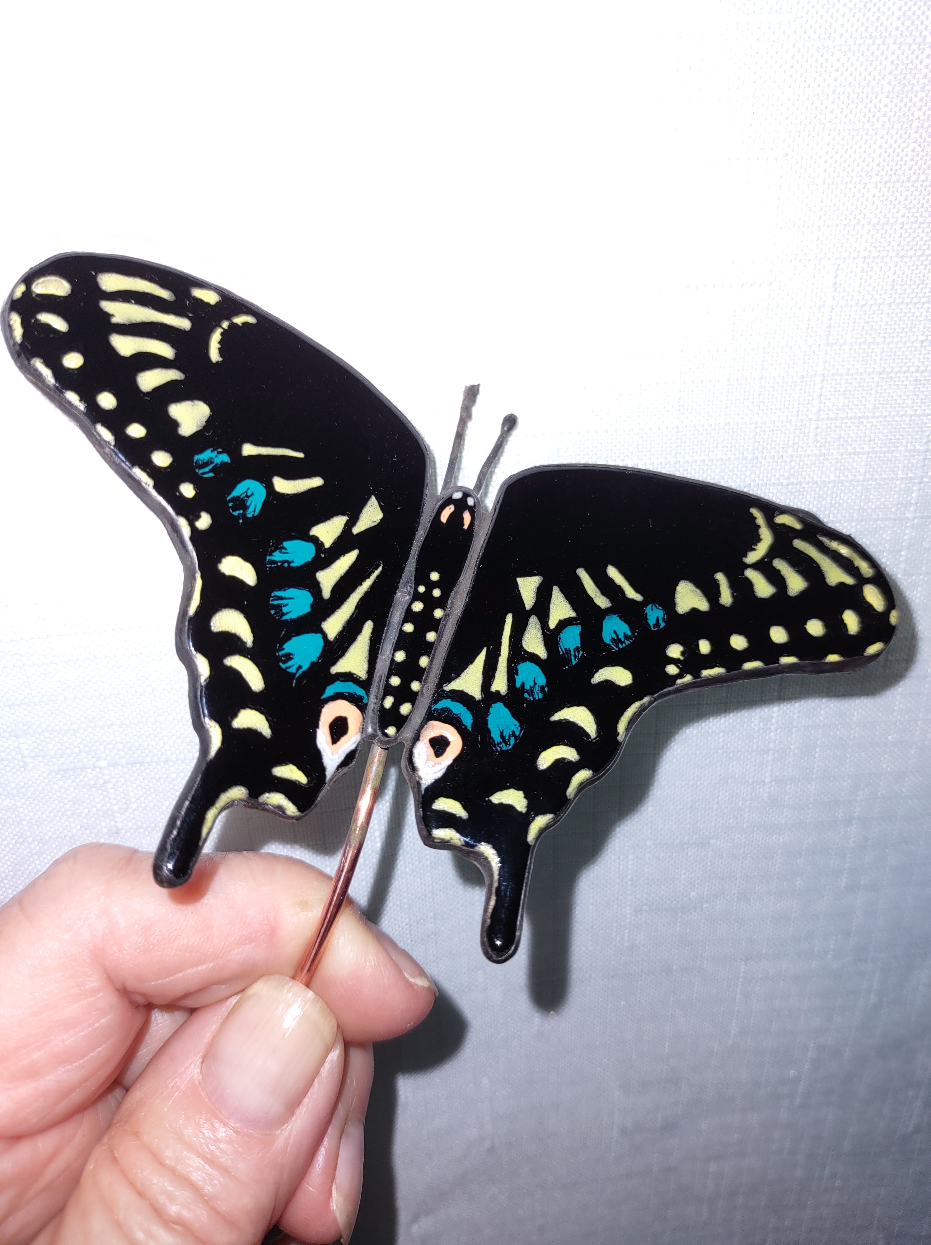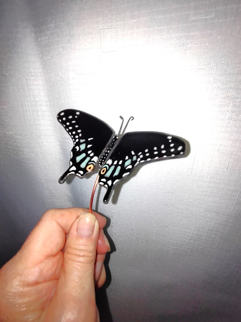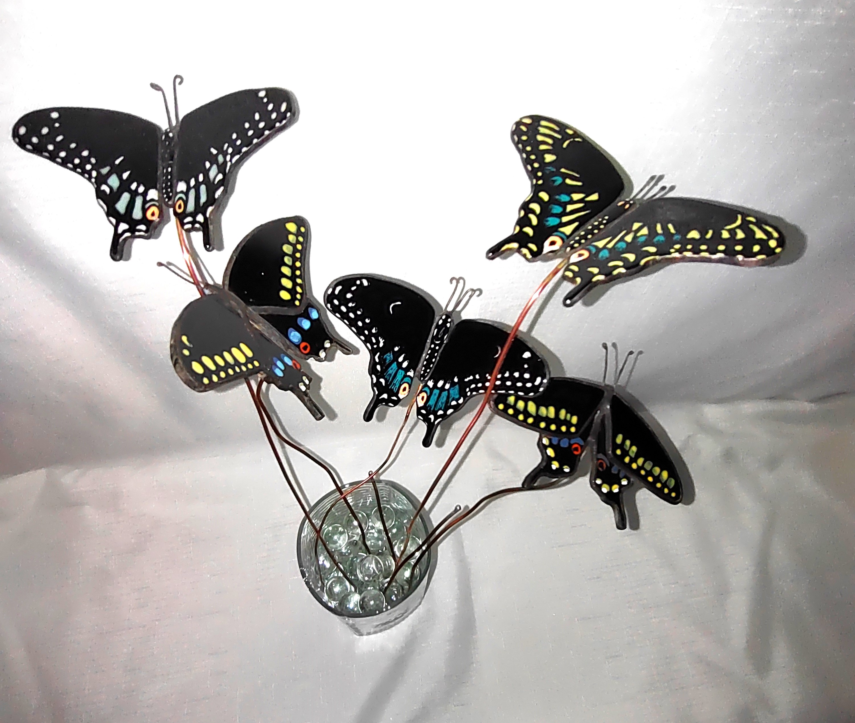 Black Swallowtail Butterfly Plant Stake– $60 Black Swallowtail butterfly mounted on copper wire and created from stained glass, the wing-span on each butterfly is about 4 inches. Each Swallowtail is made from black stained glass, no two are alike. Some are lacquered for their distinct colors, others are glass painted and fired to fuse. Both types are joined using the Tiffany foil method. Using their copper wire mounting, they can be entwined around any indoor item – a lamp base, bedpost, and are especially nice used to highlight your non-flowering house plants.