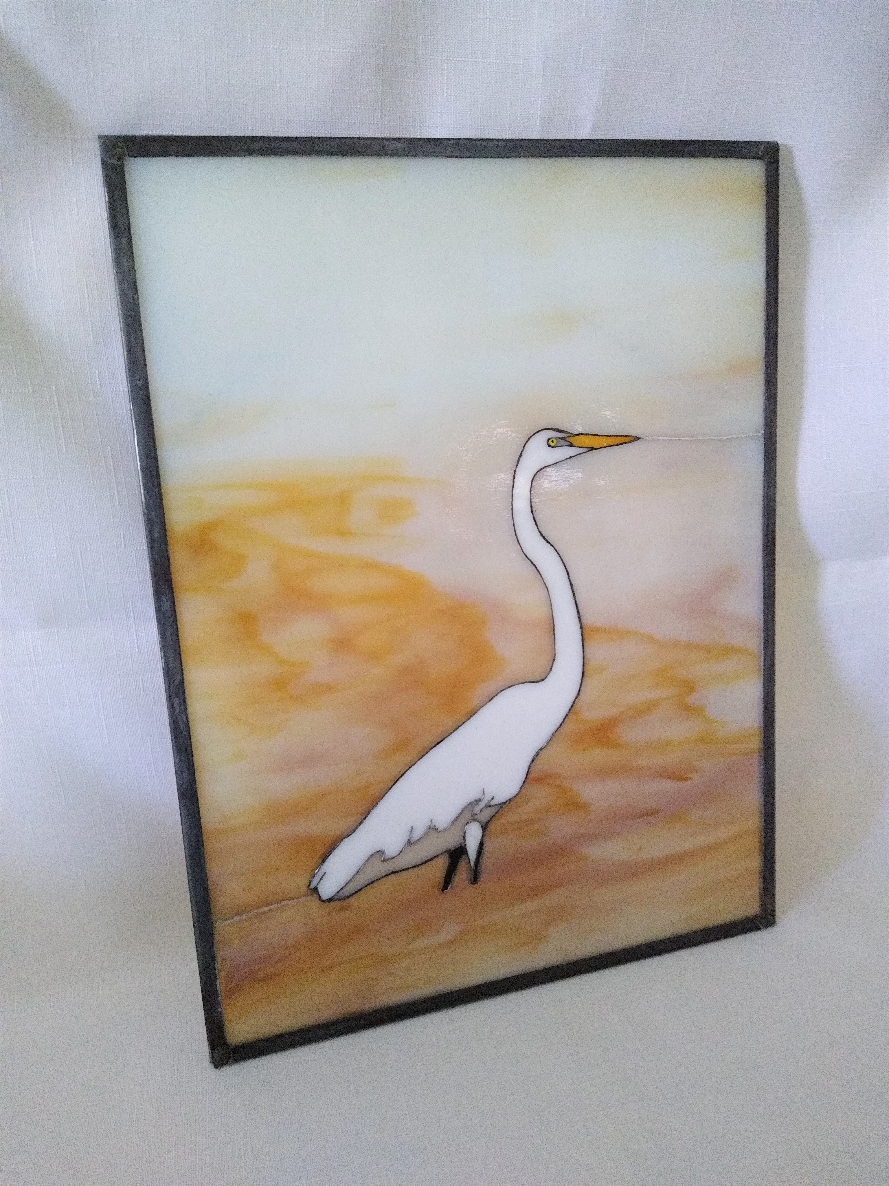White Heron on Sandy Beach – $290. Stained Glass panel depicting a white heron on a sandy beach searching for food. Piece is comprised of white, black and yellow stained glass on a variegated sandy-white stained glass background, with a lacquered yellow eye. Done in the Tiffany style, it is copper foiled, soldered and patinaed with black patina. It is framed in black-stained zinc. Measures 10 ¾” x 14 ½” high. An original design, as all our pieces, and one-of-a-kind.