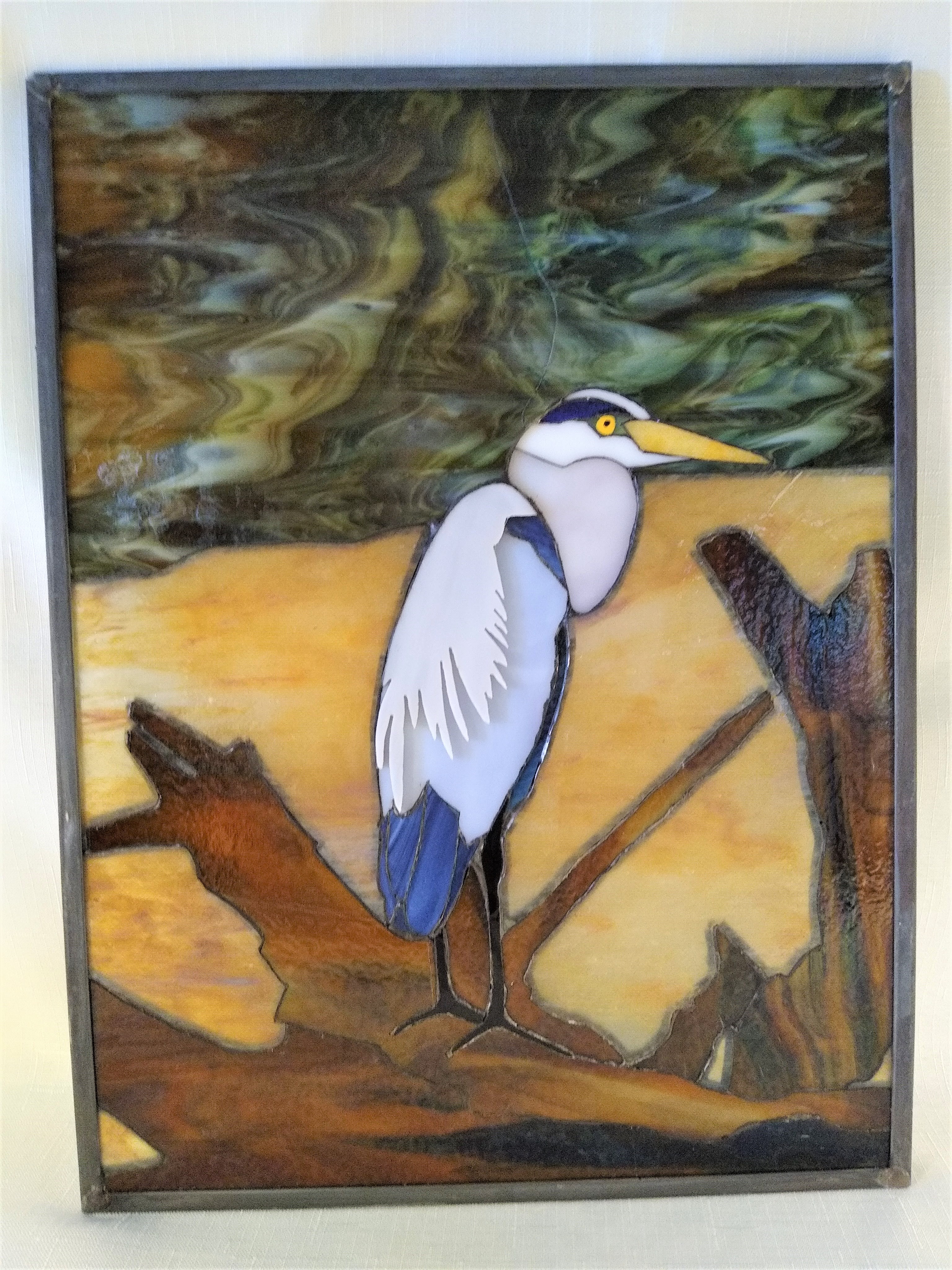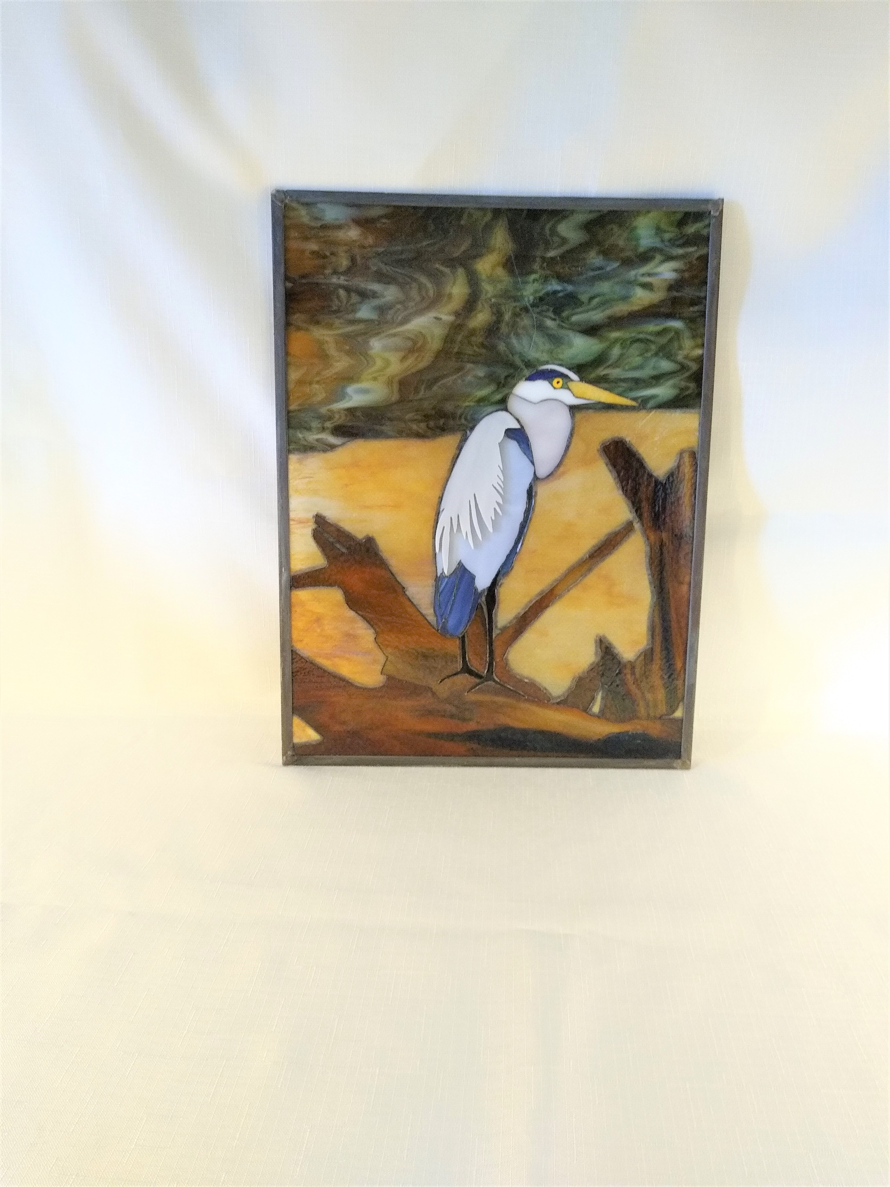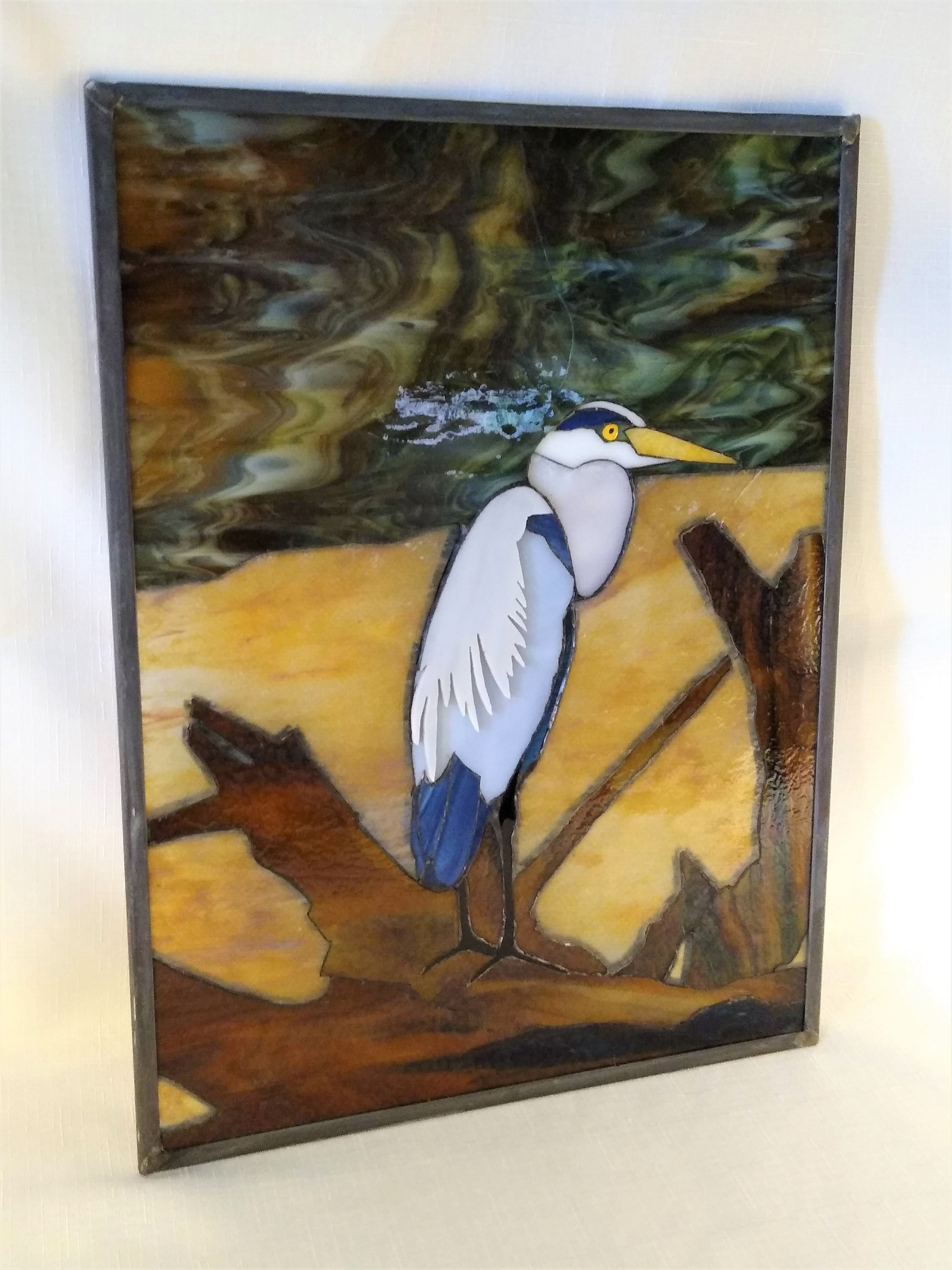 Blue Heron in Storm – $310. Stained Glass panel featuring a great blue heron on a wooded pond on a stormy night. The heron is multi-layered stained glass of blues, grey, white, yellow and black with a lacquered eye. The pond and stormy sky are opaque variegated/striated stained glass and the stumps and logs are shades of brown/black. The entire piece is patinaed in black and darkened antique brass and the zinc frame is black-stained. Measures 11” x 14 ½” high.