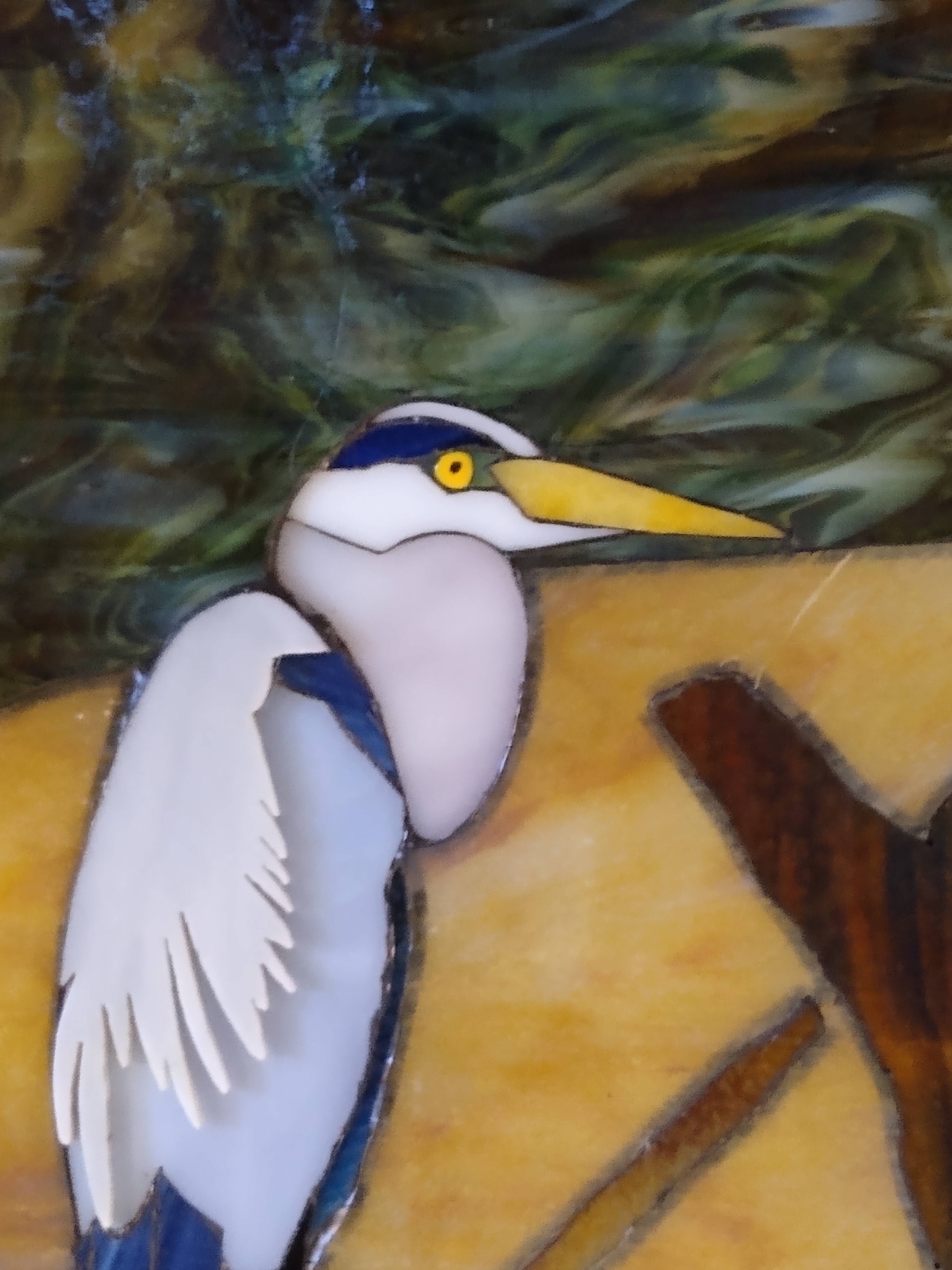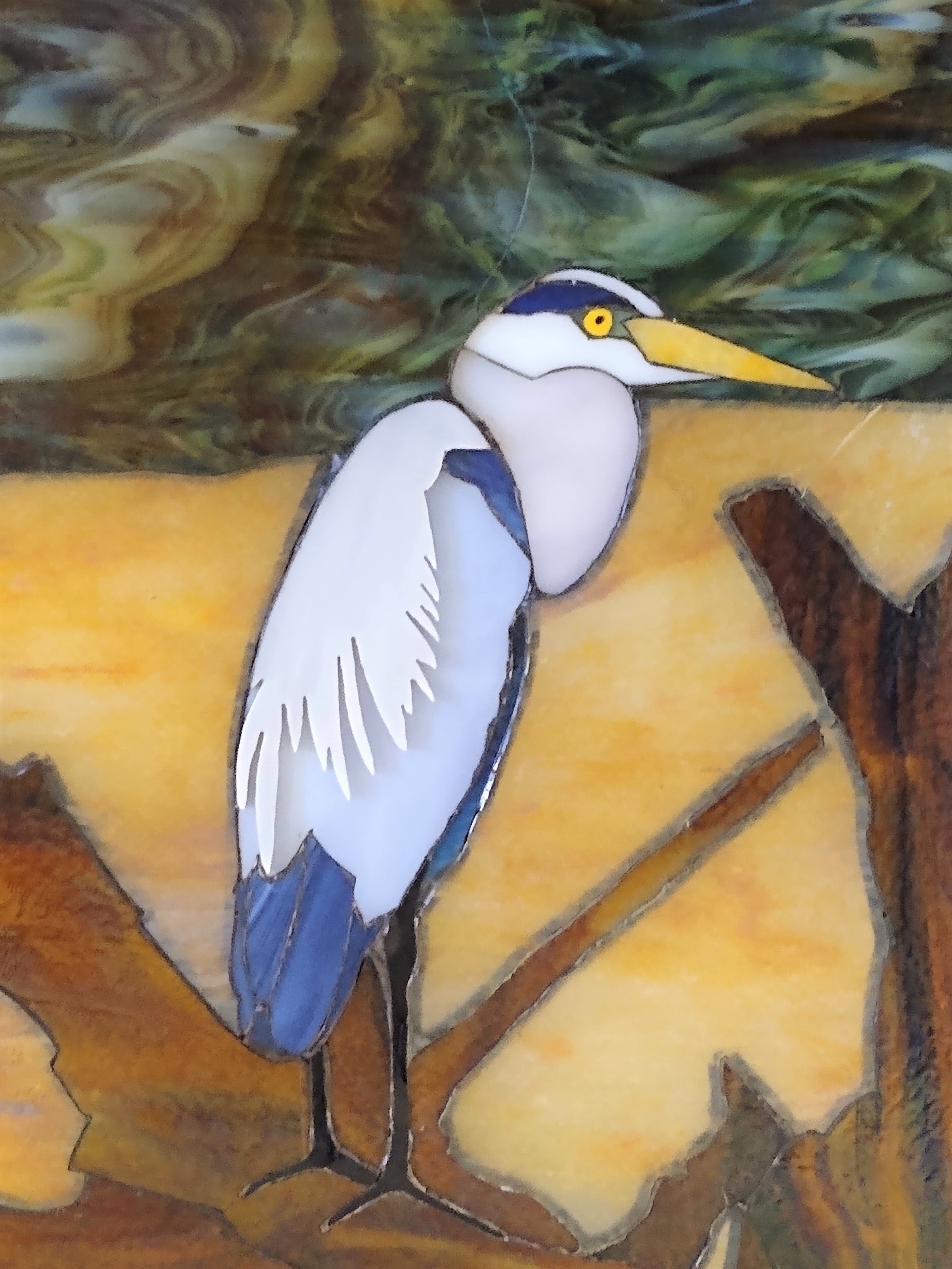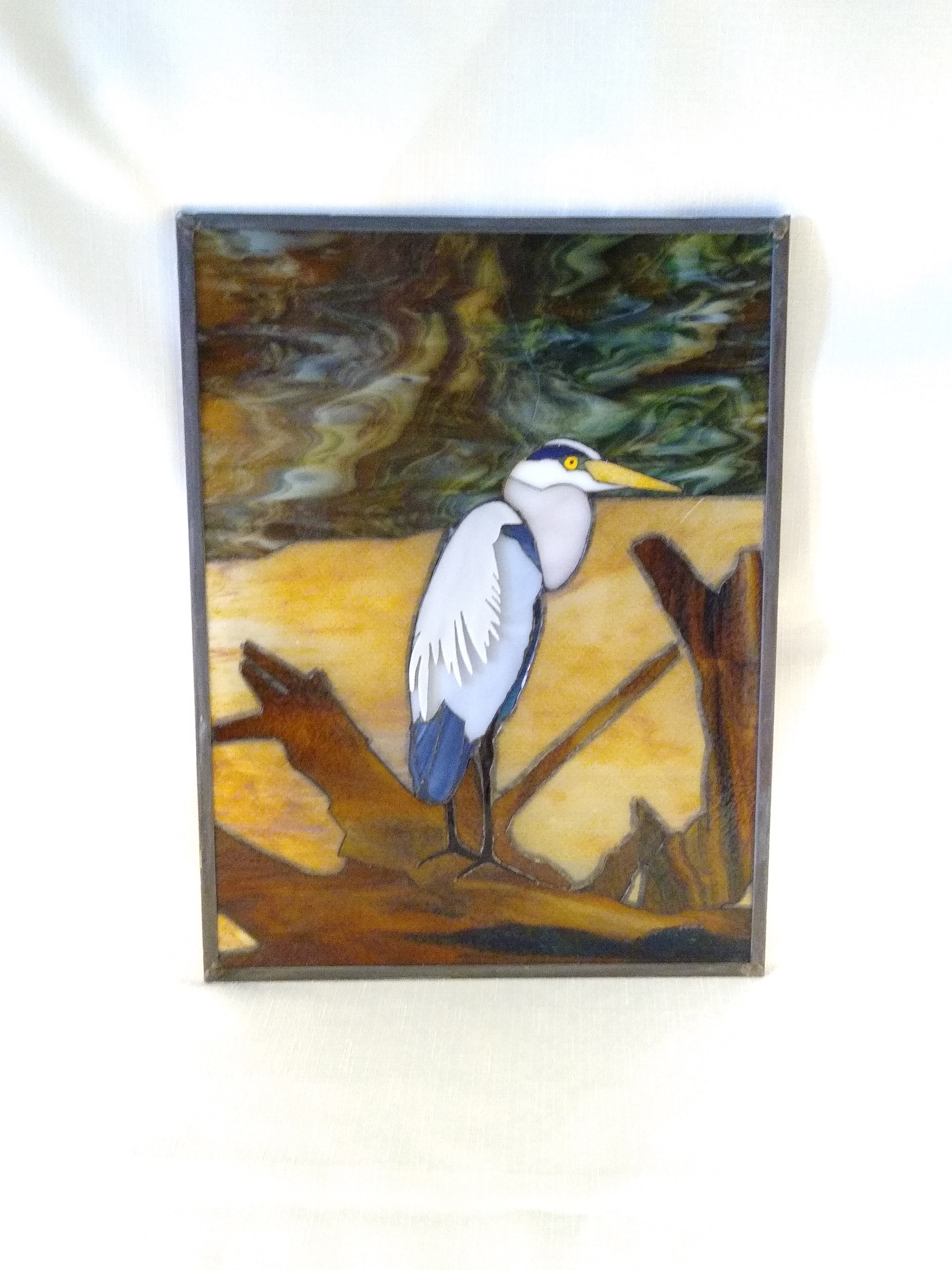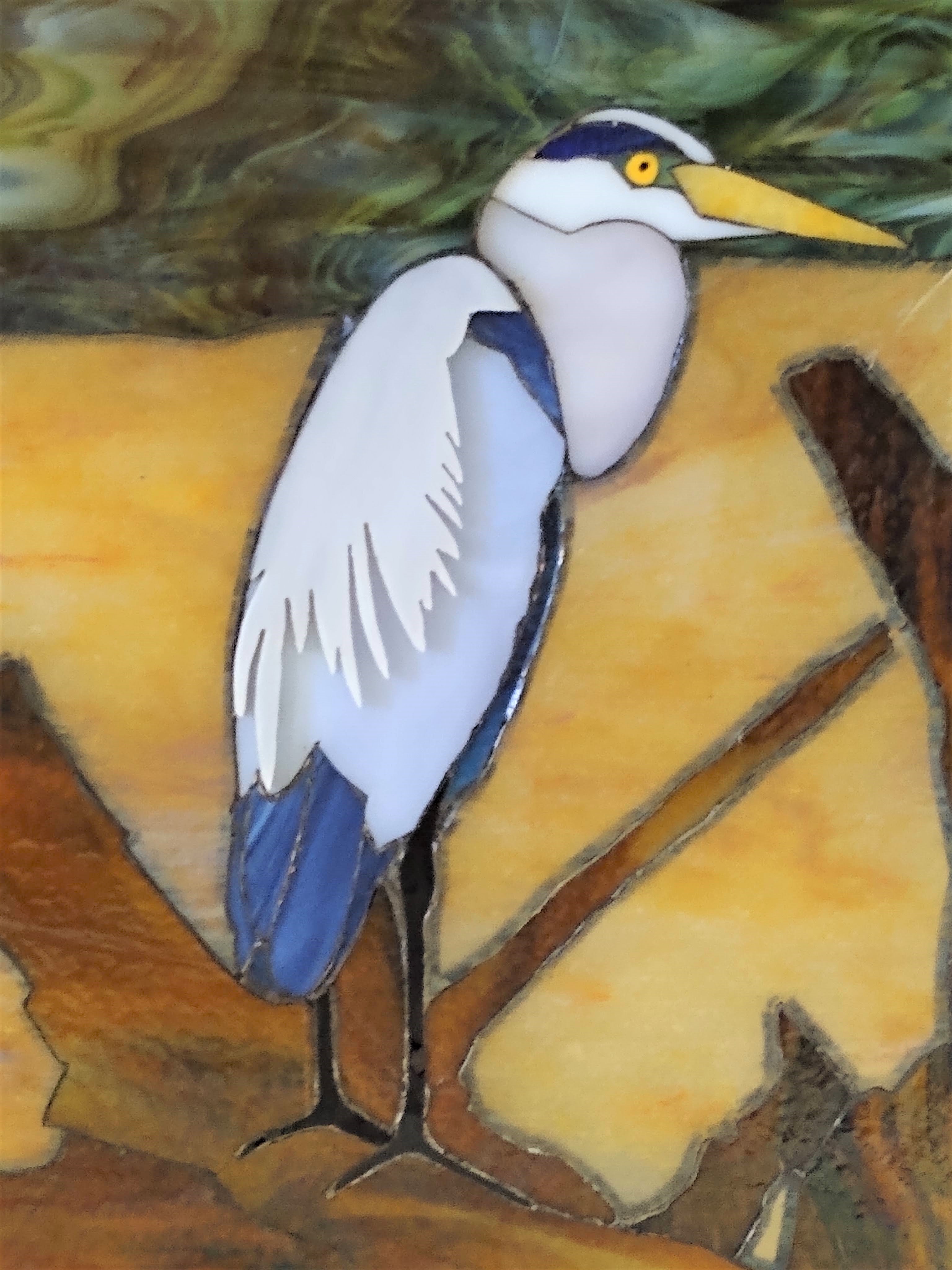 Blue Heron in Storm – $310. Stained Glass panel featuring a great blue heron on a wooded pond on a stormy night. The heron is multi-layered stained glass of blues, grey, white, yellow and black with a lacquered eye. The pond and stormy sky are opaque variegated/striated stained glass and the stumps and logs are shades of brown/black. The entire piece is patinaed in black and darkened antique brass and the zinc frame is black-stained. Measures 11” x 14 ½” high.