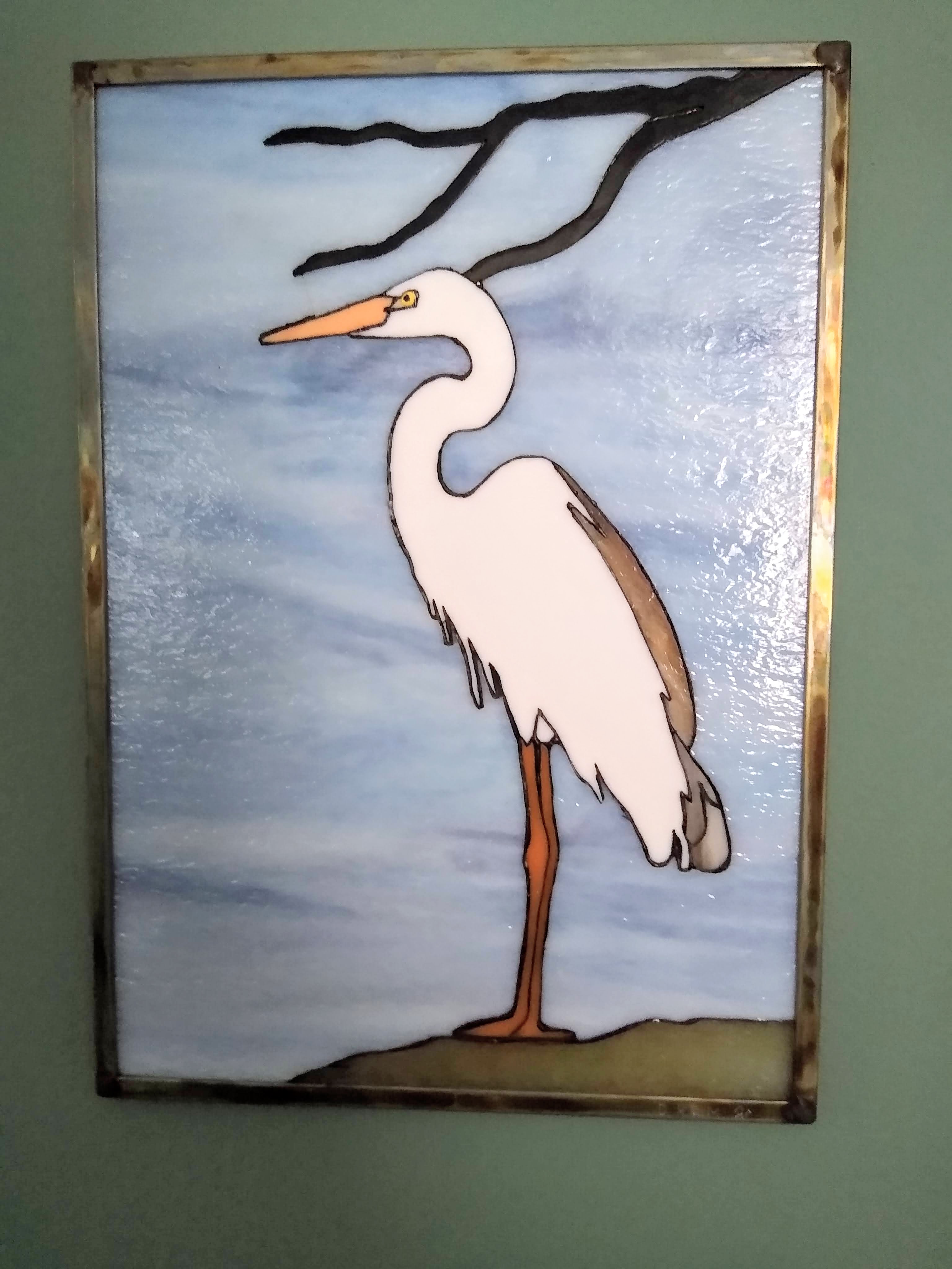 Great White Heron – $219. Majestic in its own right, this uncommon bird can be spotted in South Florida, depicted here on a sand sprit. Done in the traditional Tiffany style, this stained glass creation is comprised of opaque glass and displays very well as a wall hanging. A great gift for any occasion, or to hang on the wall at a beach house. This particular piece measures 12.5 inches tall by 9 inches wide. It is designed from stained glass, copper foil, solder and is zinc framed. A one-of-a-kind creation! All our art is unique and original.