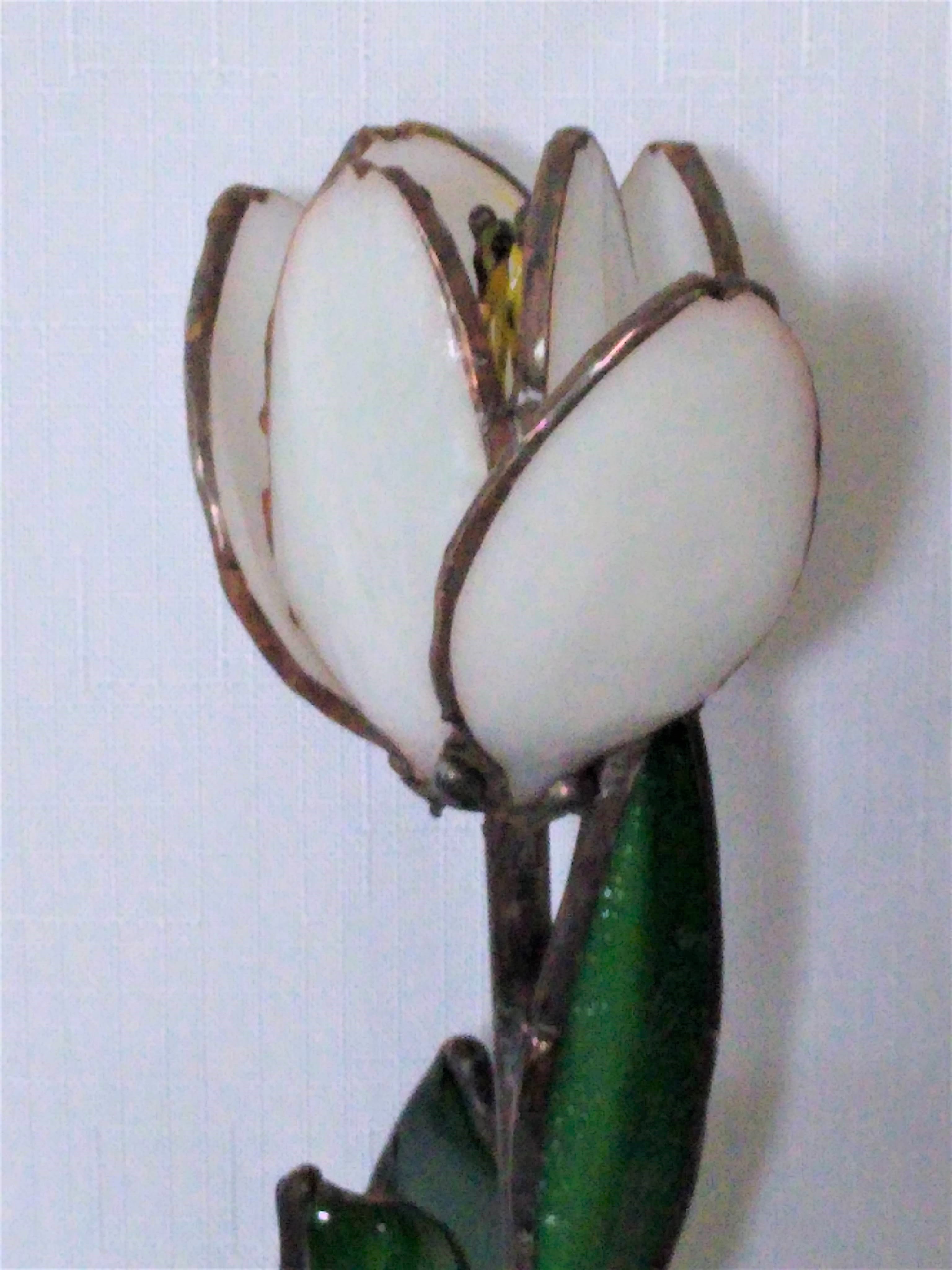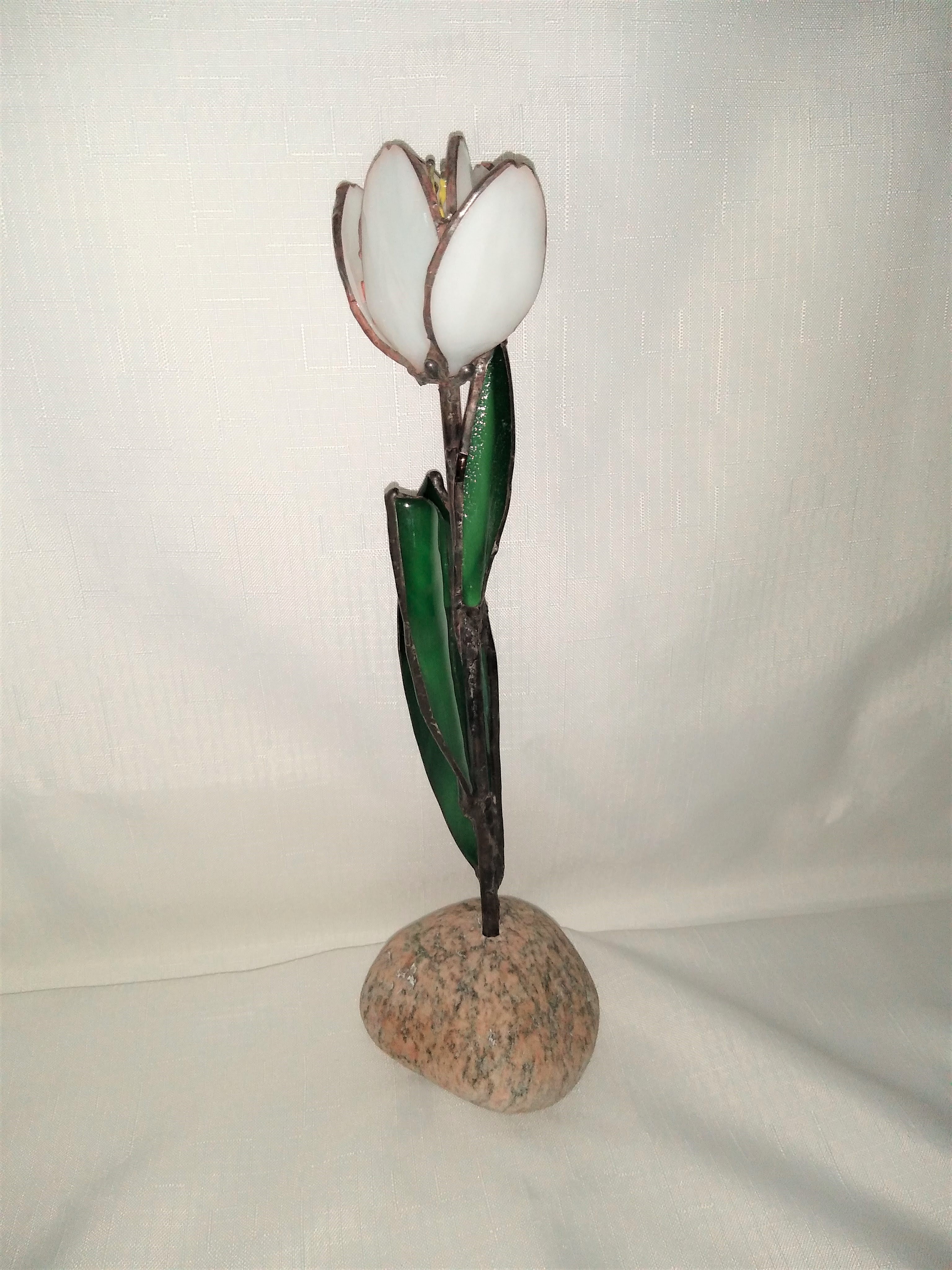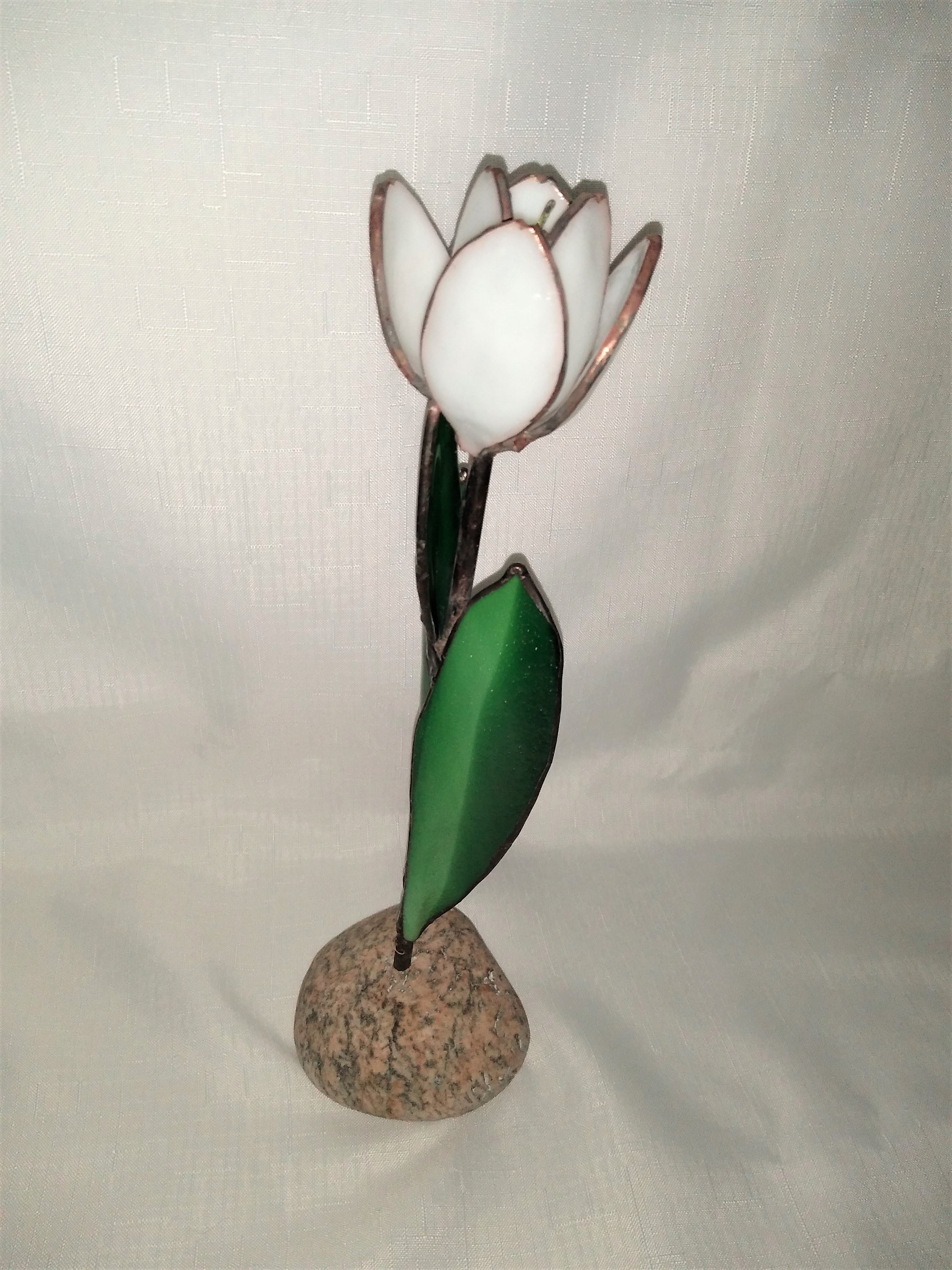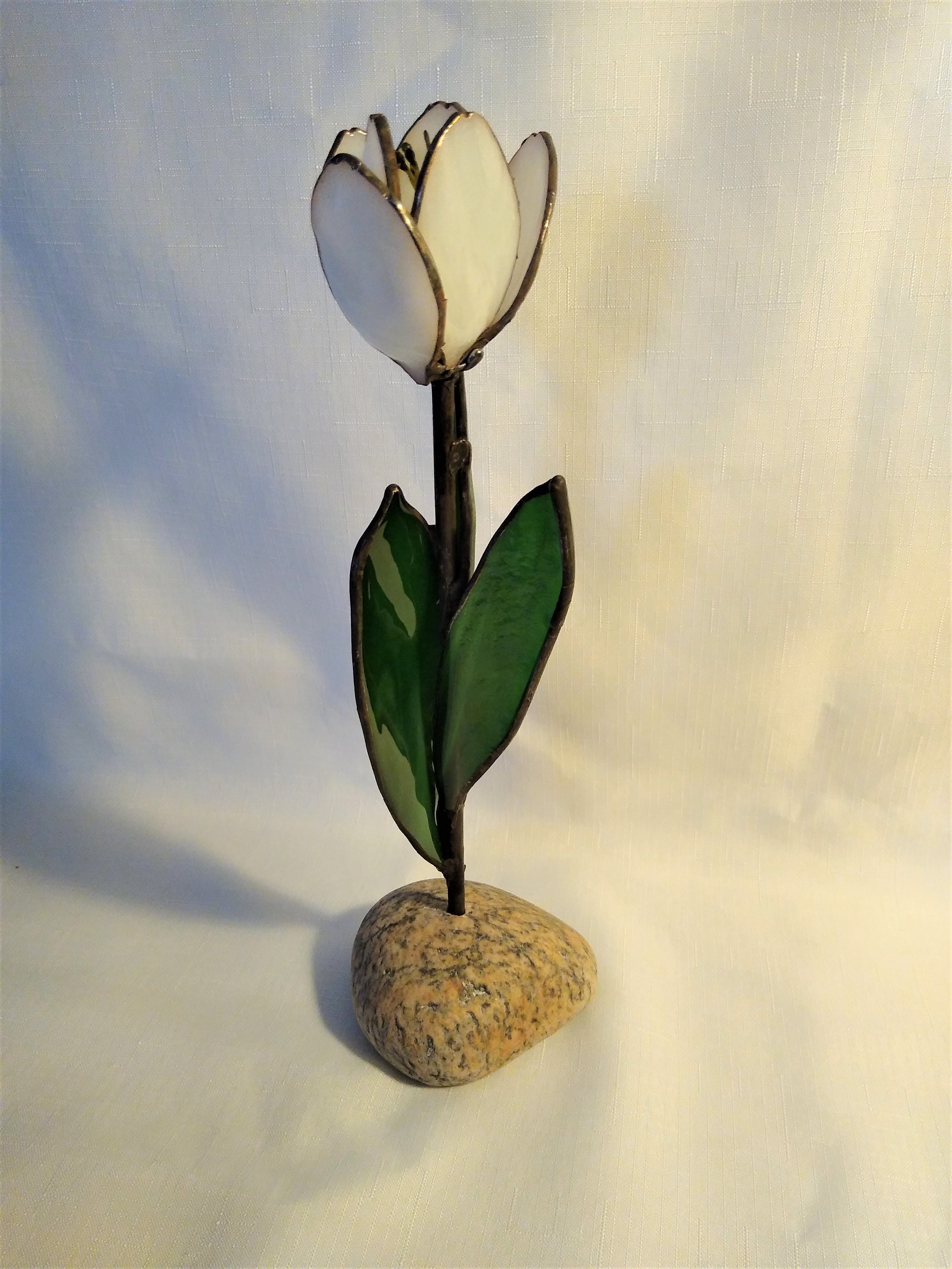 White Tulip on Granite – $175. The White Tulip petals are opaque white stained glass, kiln slumped, copper foiled and bronze patina. The 6 stamen are made from copper wire and lacquered in yellow. The stem is copper tubing in distressed black patina. The leaves are striated green stained glass, kiln slumped to shape., copper foiled and distressed black patina. The leaves and tulip flower are lead soldered to attach to the stem. The stem is freely inserted into the natural granite rock. The entire piece is 12 inches high and maximum across 4 inches at the granite rock. This free-standing, multi-dimensional design can be viewed from all sides. As with all our creations, this is a one-of-a-kind original design!