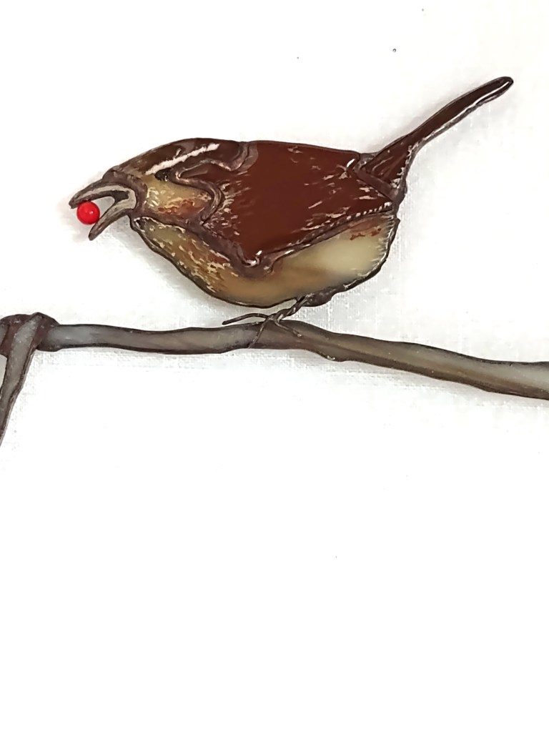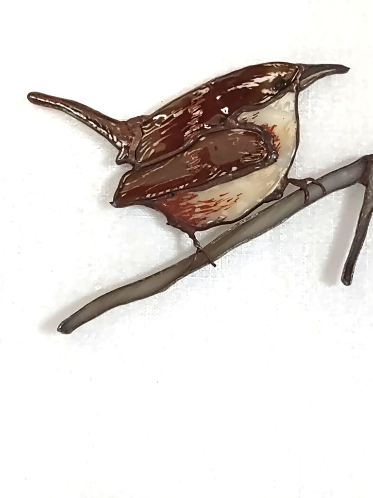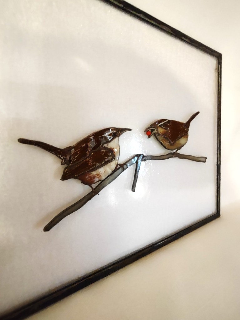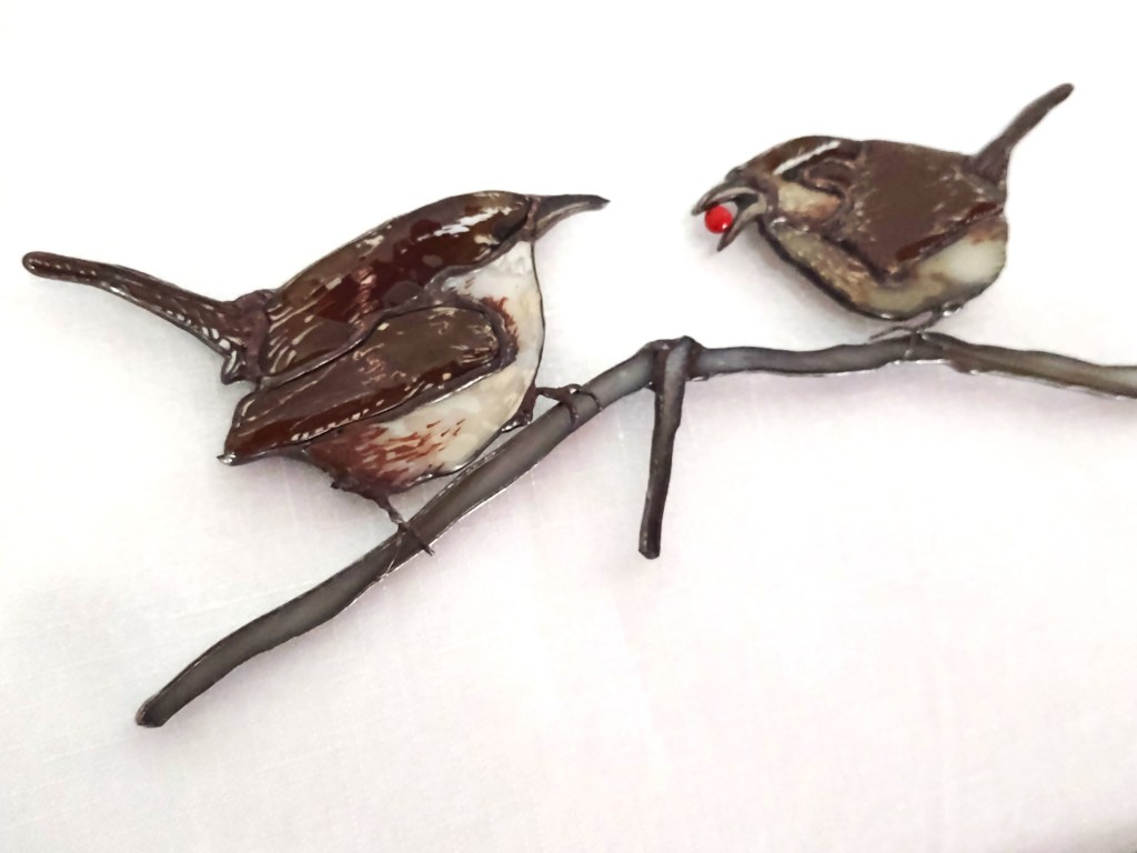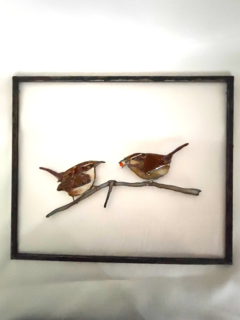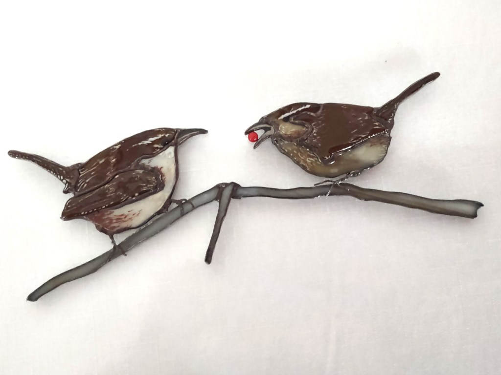 An original design and hand-crafted. Wrens are created from stained glass, highlighted for detail with glass-line and kiln fired. The birds are patinaed in gun browning, the red “berry” is glass bead. The frame is zinc, lead-stressed and patinaed in black. Measures 10 ½ x 12 inches and does well in a window or as a wall hanging. This is a companion piece to the black-capped chickadee pair.