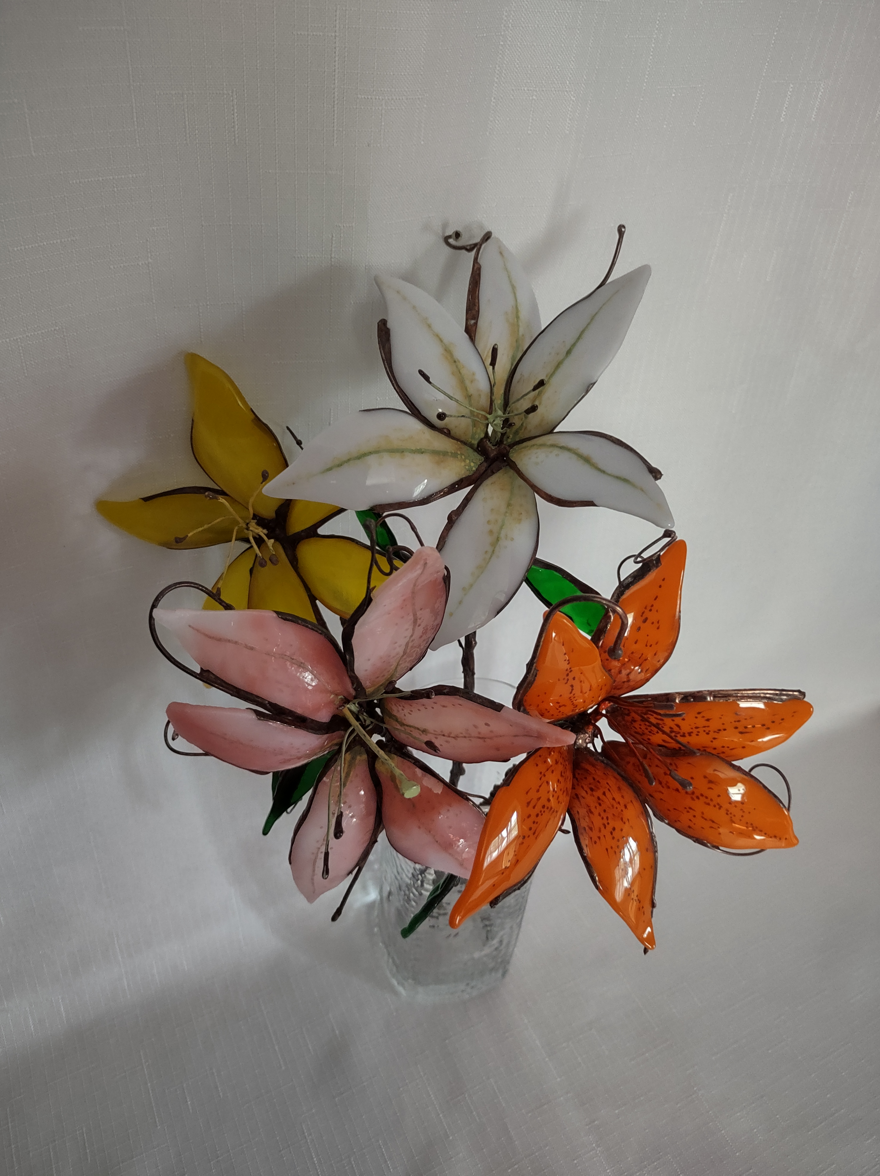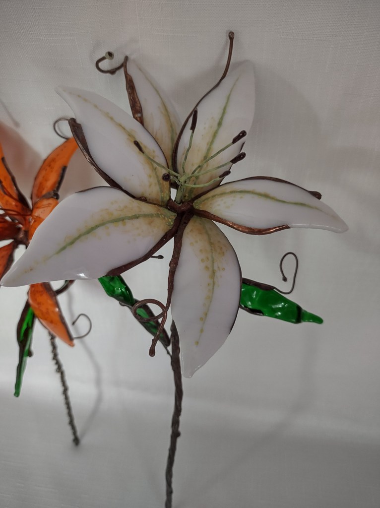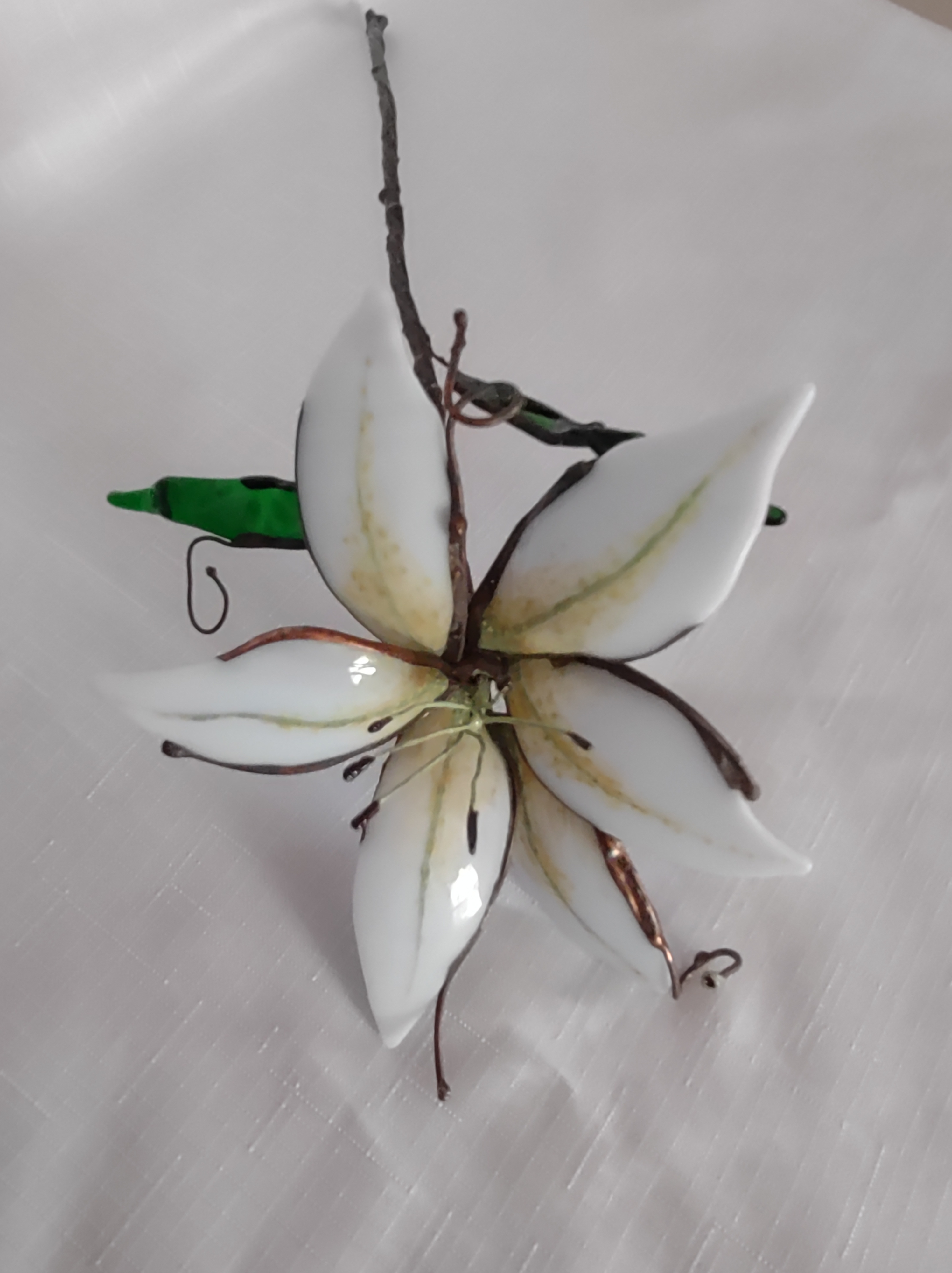 The White Lily will bloom in your home year round. The flower petals are cut from white glass, tinted with green and yellow blended liquid glass and fired for shape and texture. The leaves are deep green stained glass, also fired for shaping. Petals and leaves are partially wrapped with copper foil, and solder joined. The centers are created from copper wire, soldered and lacquered. The stem is twisted copper wire, solder joined to the flower and petals. Various shades of patina are applied for effect. The piece is 14.5 inches high and 5.5 inches across.