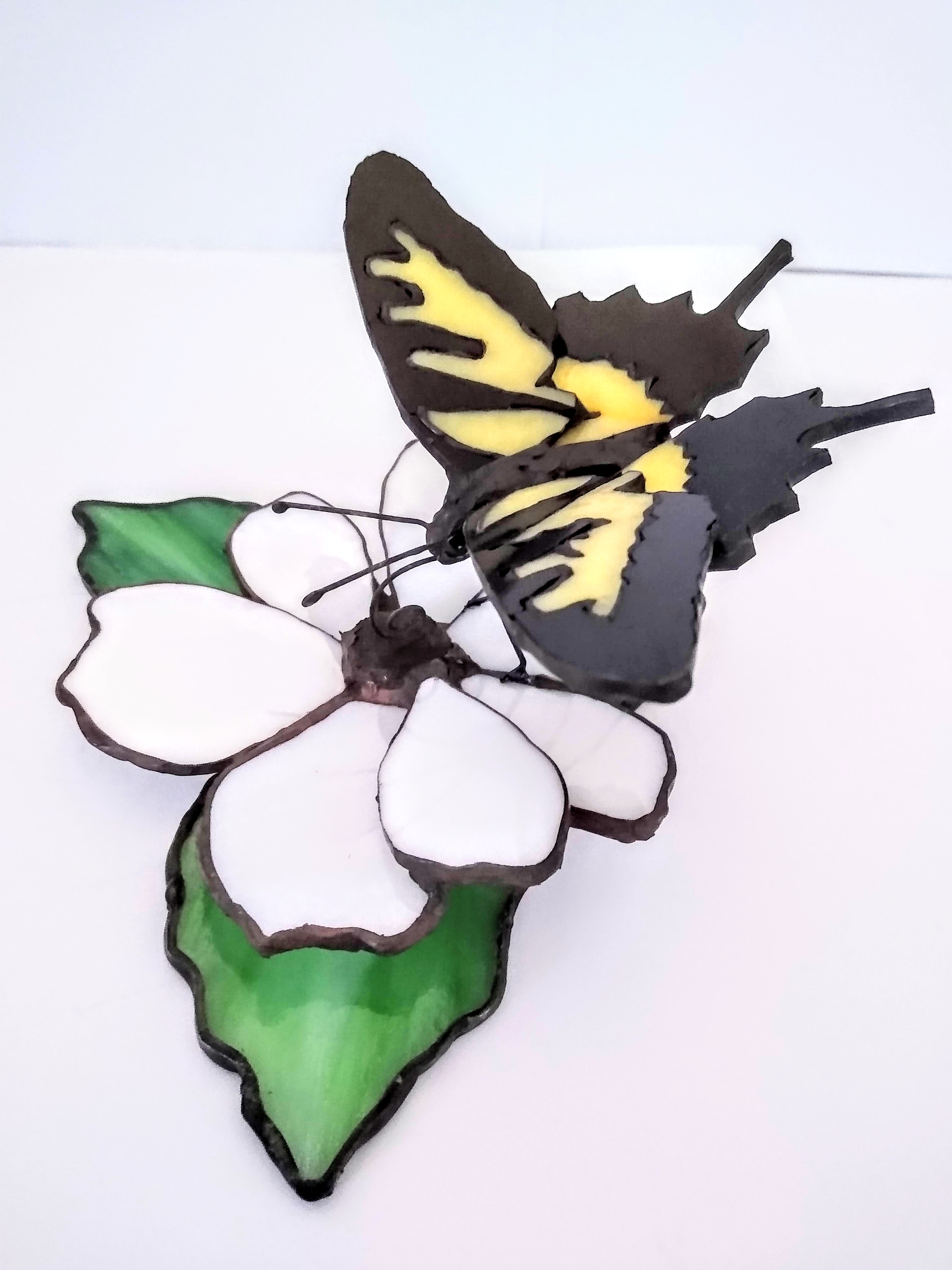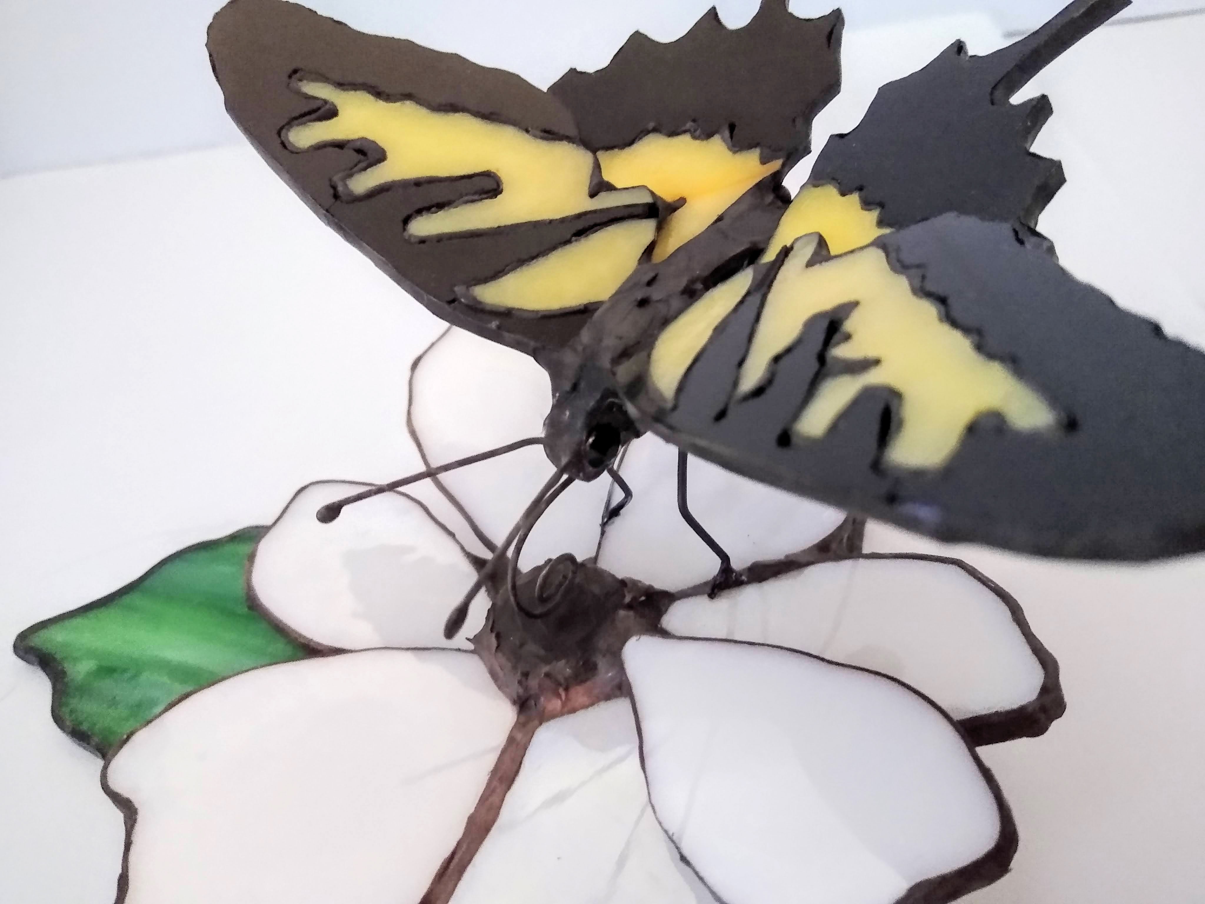 Close to the size of a real Yellow Swallowtail, the wing span is 5 3/4″. The overall piece is 3″ high by 6″ wide. It comes with a five-sided glass box, measuring 6″ x 6″ x 4″, also hand-crafted. Your new addition can be displayed in or out of its box.